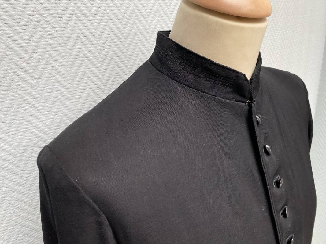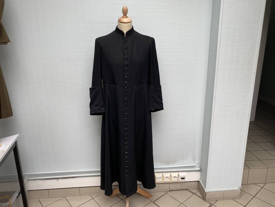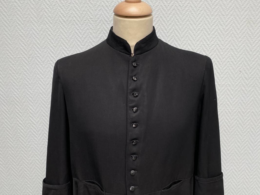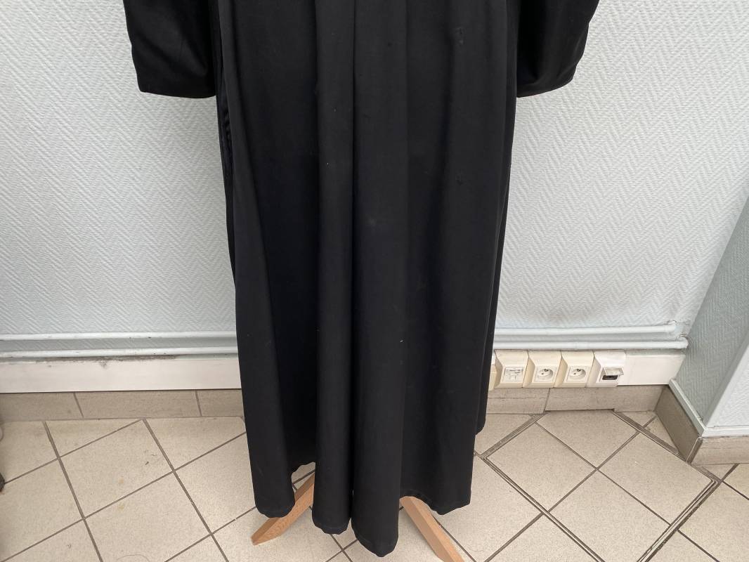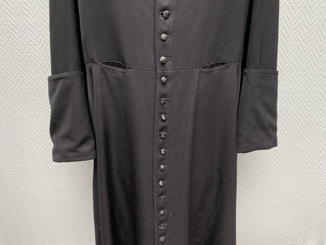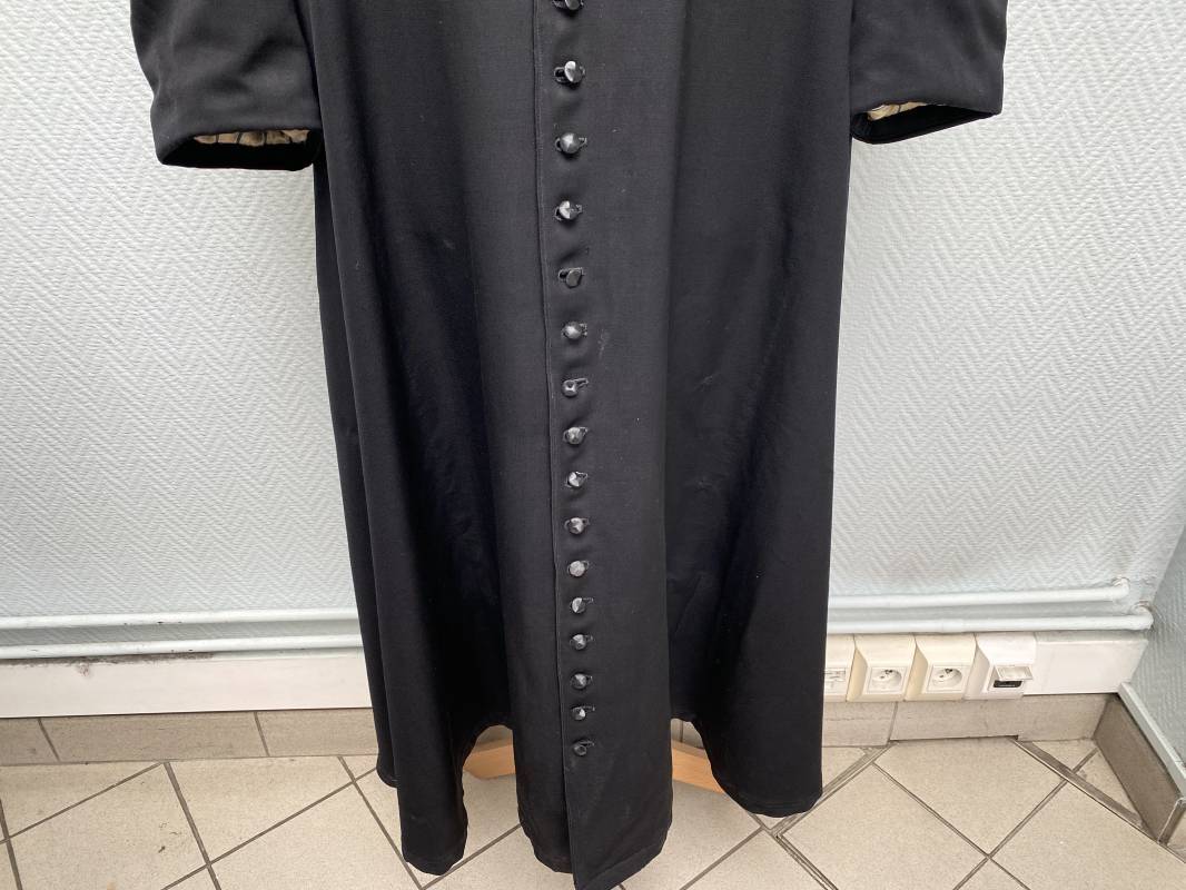 Rare soutane en coton noir d'un abbé. Fermeture sur le devant par boutons en plastique noir. Col droit, crochet métallique de fermeture au col. Deux petites poches sur le devant. Bouts des manches à rabats. Largeur d'épaules 43cm. Manches 57cm. Longueur 140cm. Intèrieur doublé en satinette rayée. Etiquette fabricant Pape "Gerbert Volpilhac Aurillac". Une poche intèrieure. Belle soutane de confection civile du modèle utilisé par les aumoniers militaires 1914/40. Ref 18079