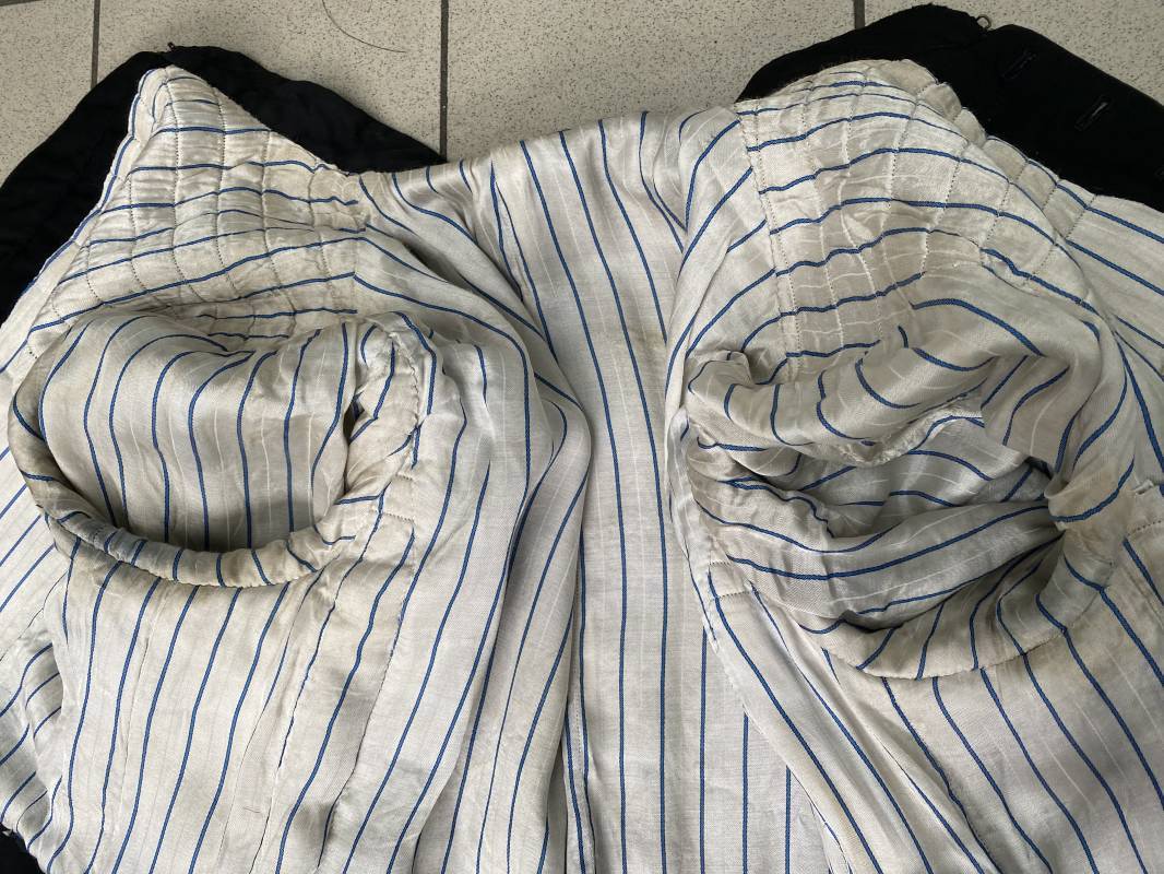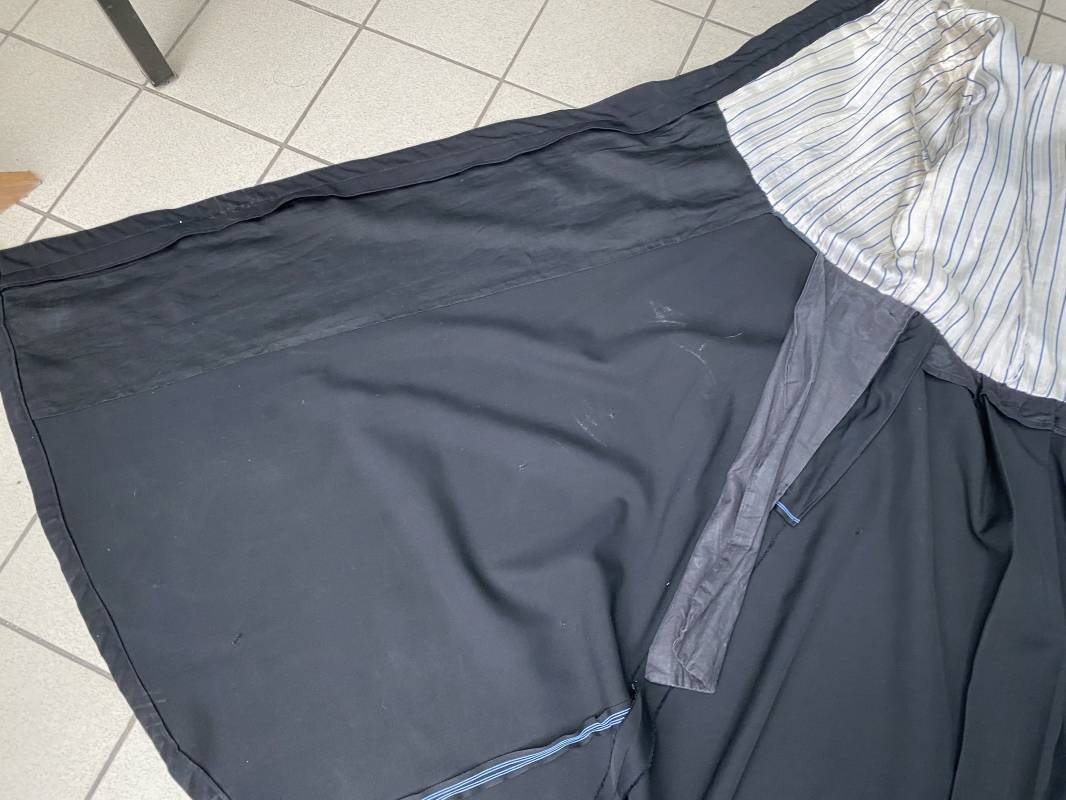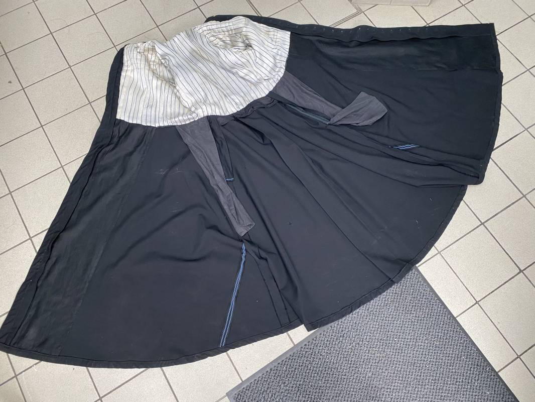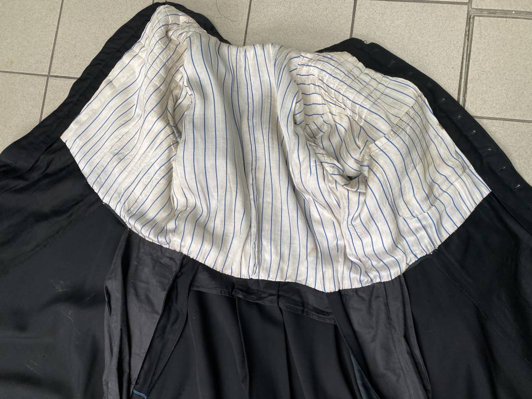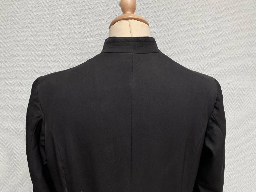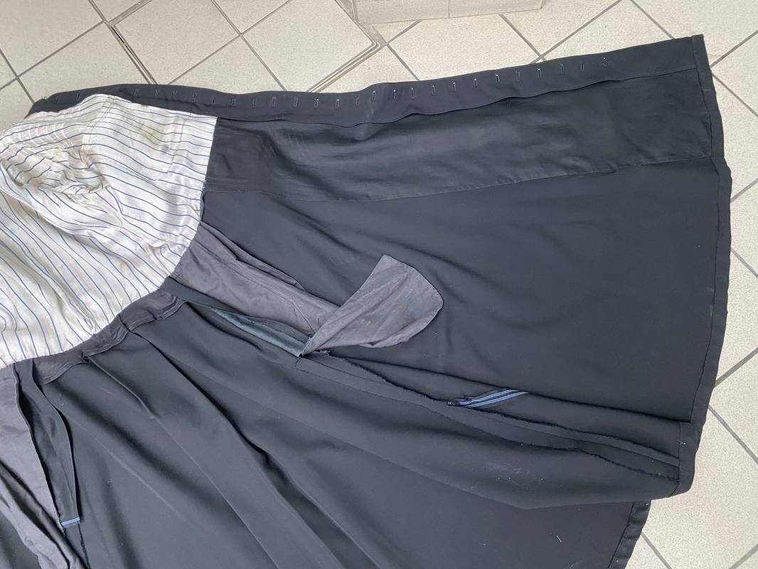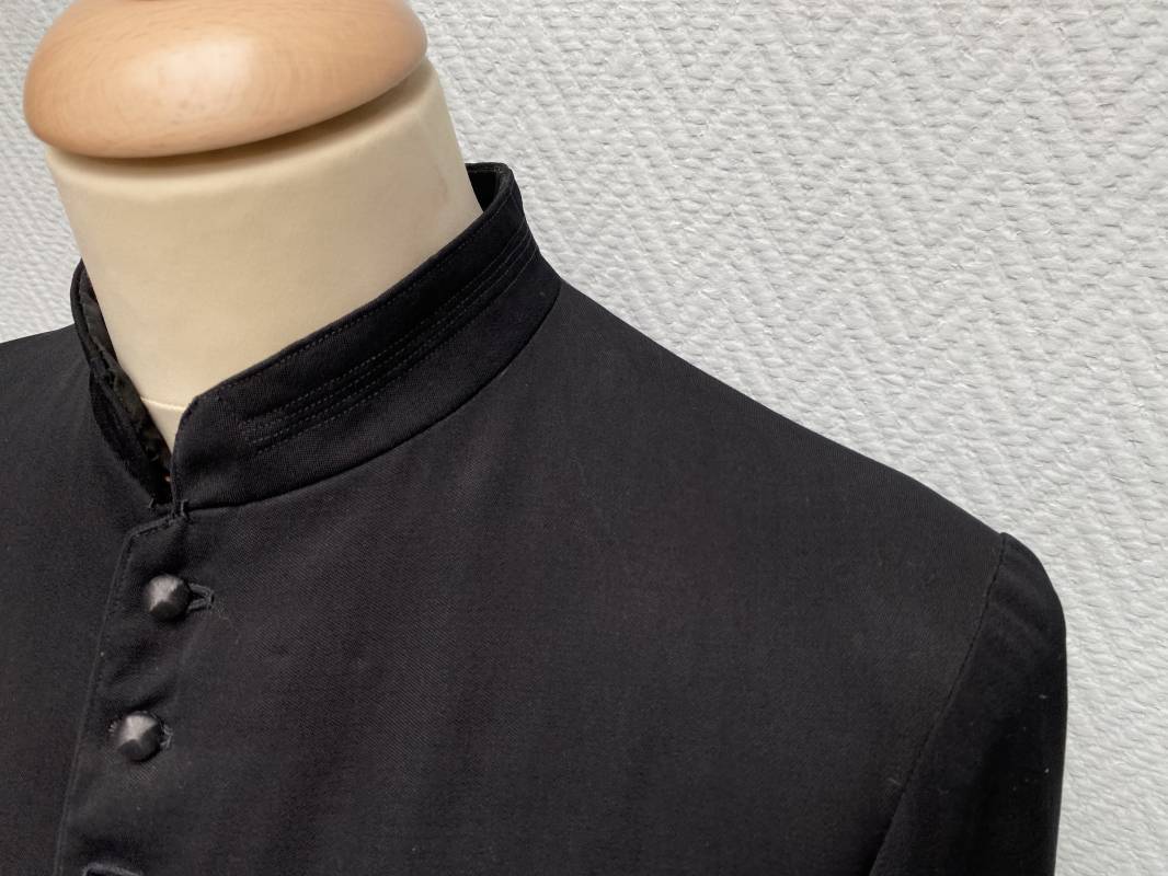 Rare soutane en coton noir d'un abbé. Fermeture sur le devant par boutons en plastique noir. Col droit, crochet métallique de fermeture au col. Deux petites poches sur le devant. Bouts des manches à rabats. Largeur d'épaules 43cm. Manches 57cm. Longueur 140cm. Intèrieur doublé en satinette rayée. Etiquette fabricant Pape "Gerbert Volpilhac Aurillac". Une poche intèrieure. Belle soutane de confection civile du modèle utilisé par les aumoniers militaires 1914/40. Ref 18079