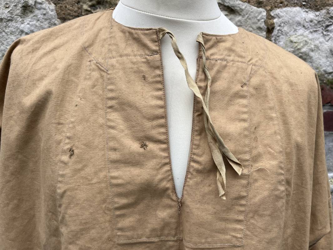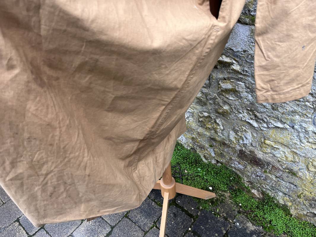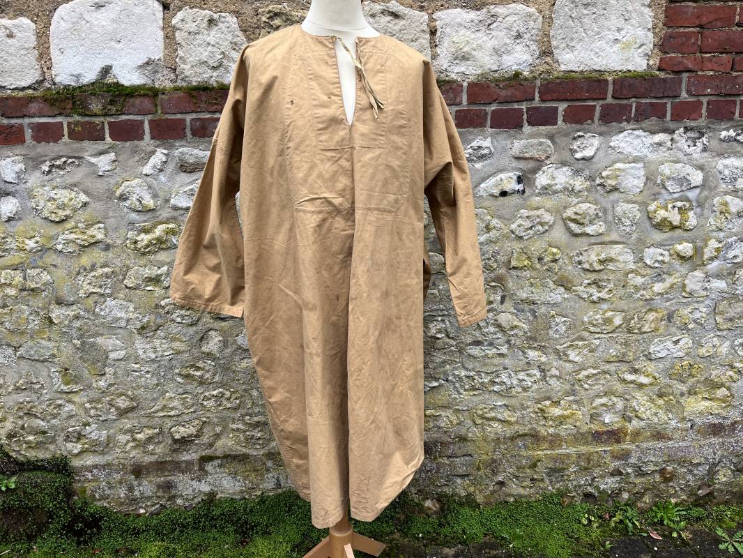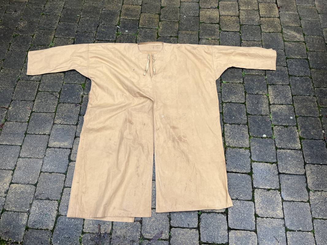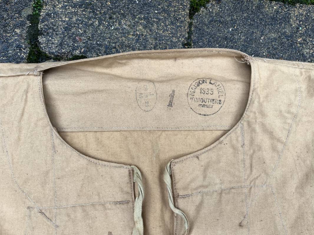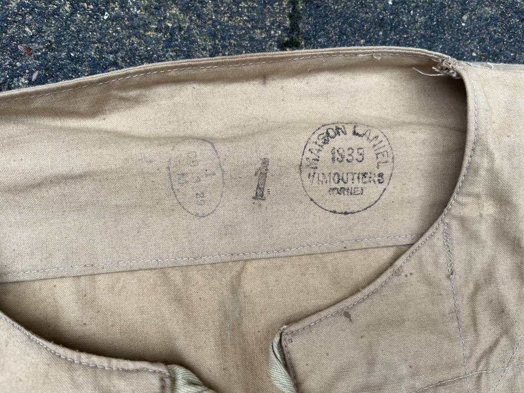 Trés belle gandourah d un spahis en coton kaki . Gandourah de dotation . Fermeture frontale avec lacet en coton kaki , deux poches intérieures . Deux fentes latérales d acces a la culotte . Fentes avant et arrières . Tampon rond fabricant Maison LANIEL Vimoutiers Daté 1935 . Tampon oval de réception daté 08 3 39 Taille 1 Largeur épaules 50 cm manches 57 cm longueur 125 cm . Belle de coton kaki clair . Légérement porté en parfait état . Rare uniforme d un spahis en mai juin 1940 21861