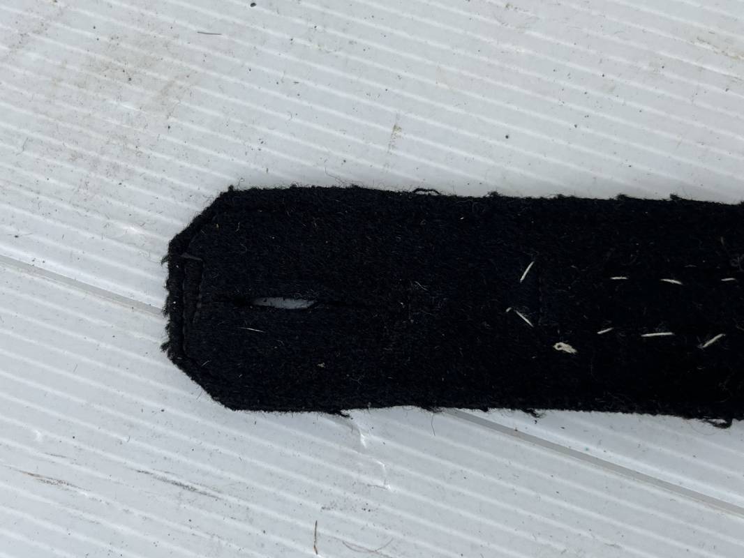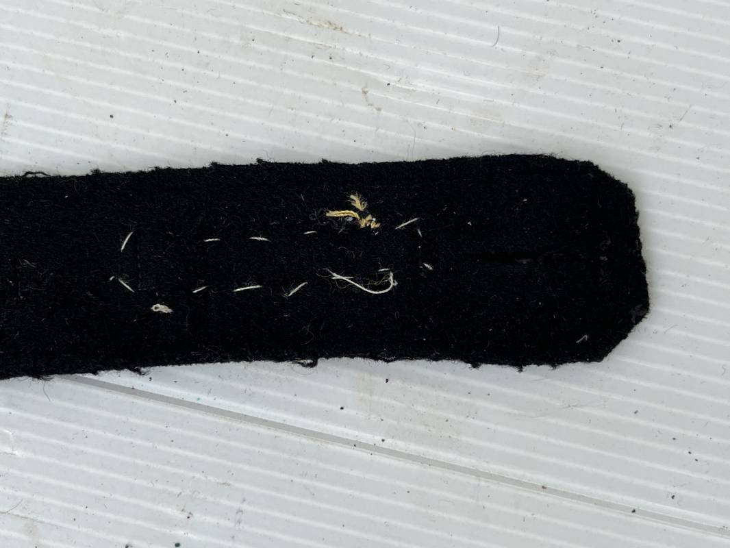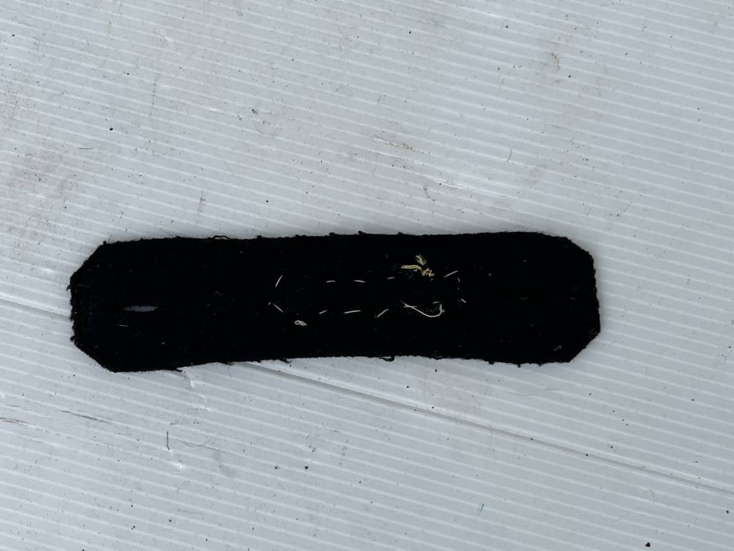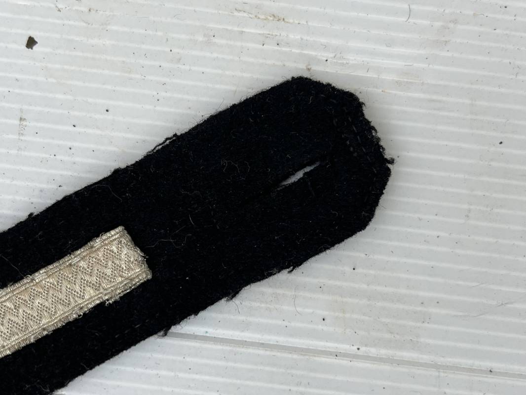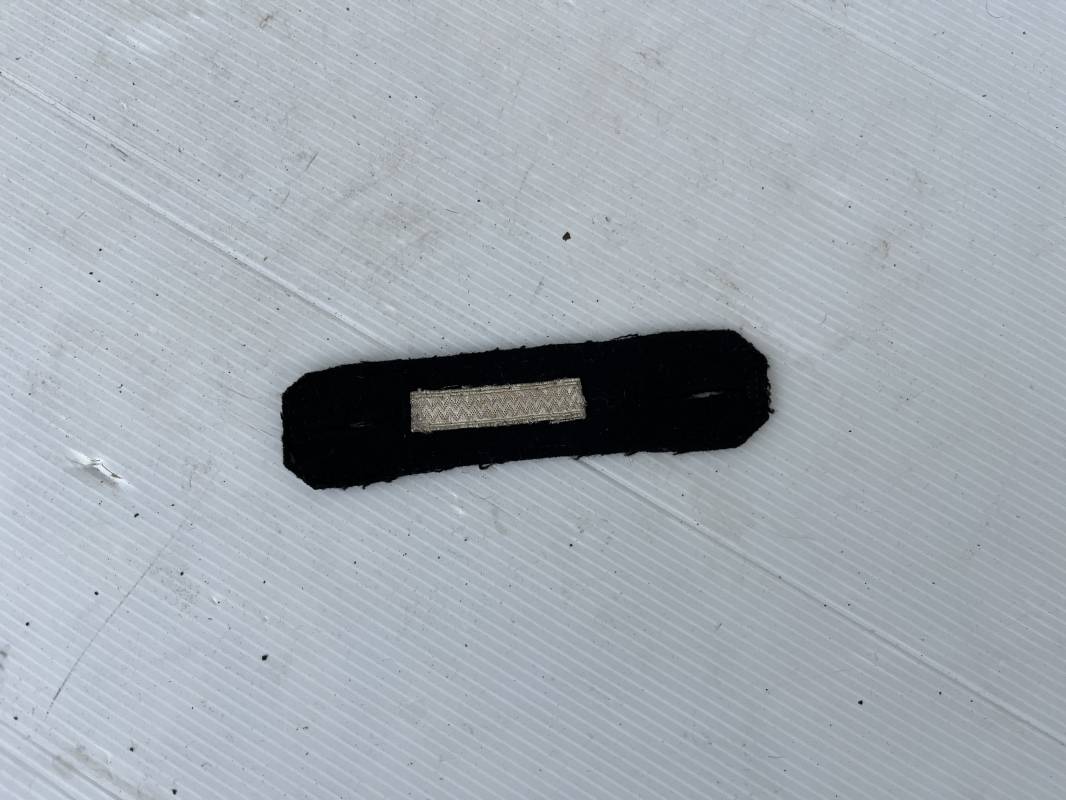 Rare Patte de grade amovible de poitrine pour veston de tankiste . Patte amovible en drap noir se fixant a l aide de deux boutons . Dimensions 140X33 mm drap noir , galon blanc lézarde de sous officier au grade de 'marechal des logis' . Porté en bel état . Cette patte a été trouvée dans la poche d 'un veston cuir modele 1935 de tankiste . 1935/40 Ref 21086
