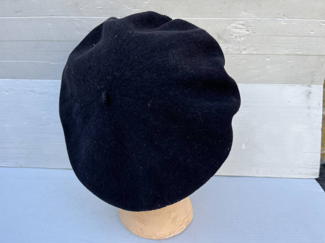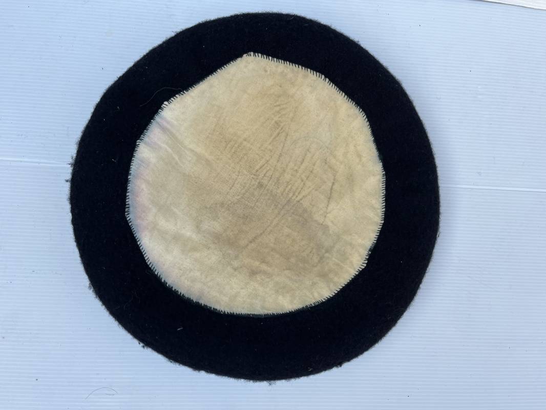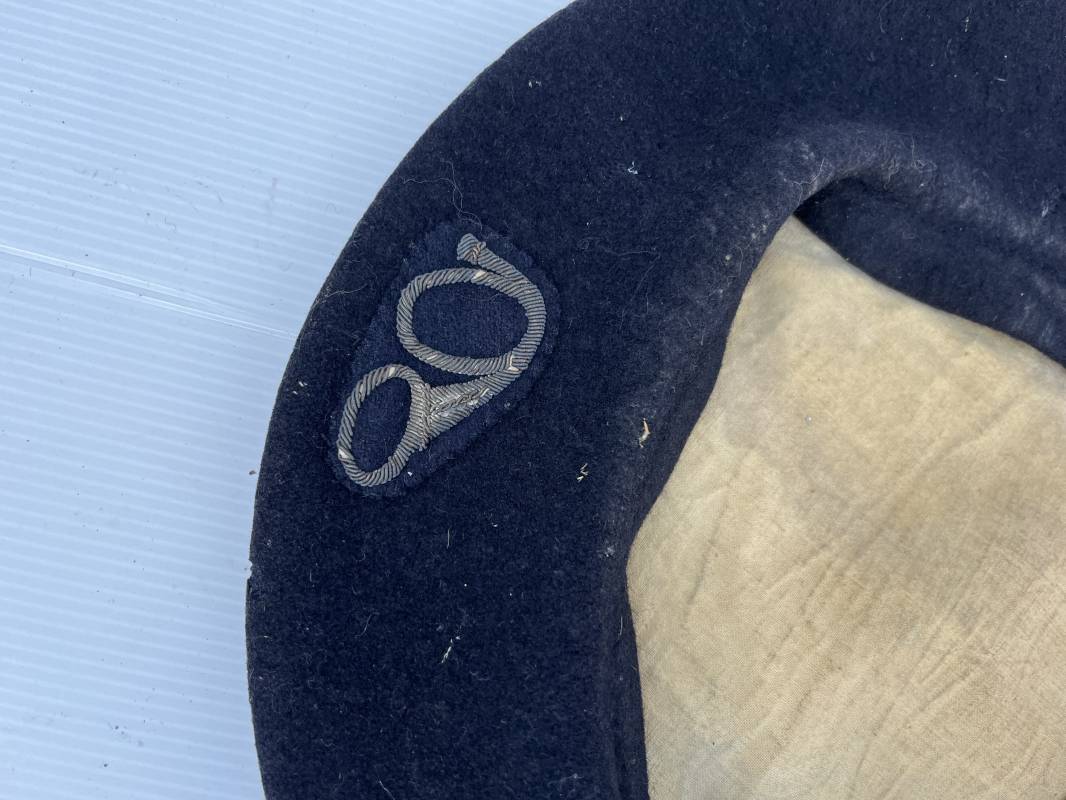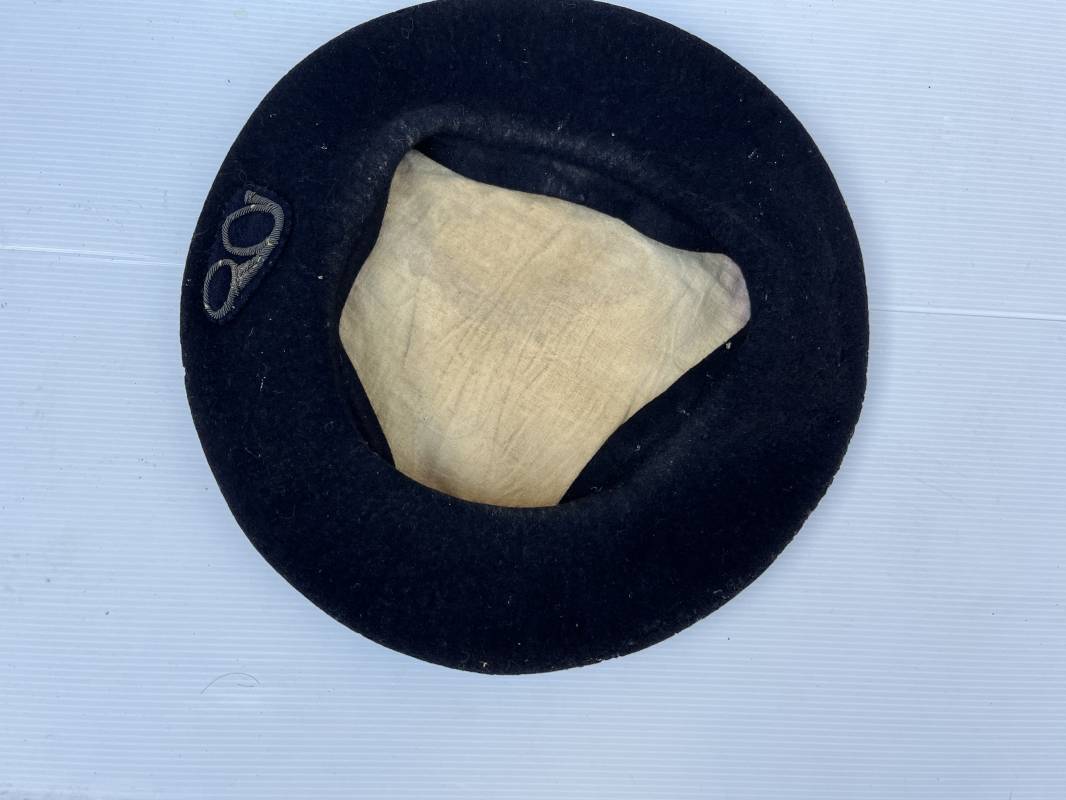 Trés belle tarte d un chasseur alpin . Tarte de dotation en drap de laine bleu nuit Diametre 32 cm . Cor de chasse brodé en cannetille argent cousu d origne pour cadre ( officier ou sous officier ) . Intérieur doublé en coton blanc . Tampon rond encre noir fabricant difficilement lisible Taille 59 . Légérement porté en tres bel état 1935/40 Ref 19827
