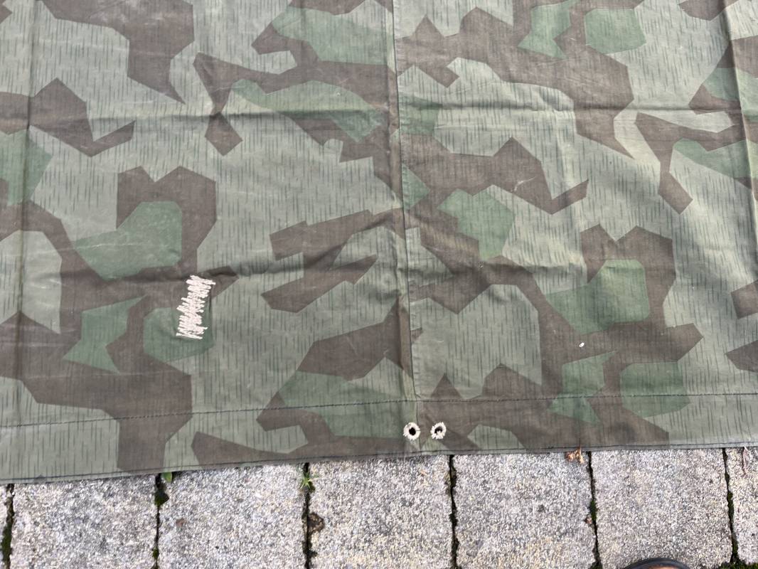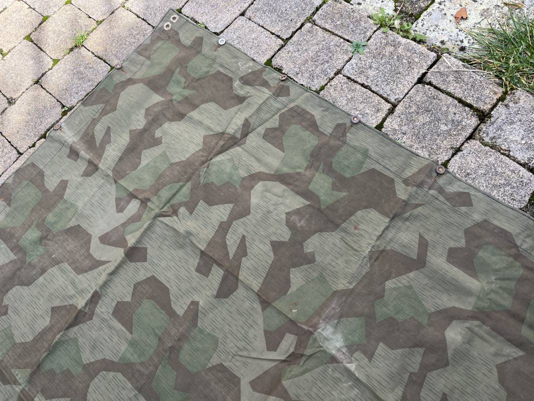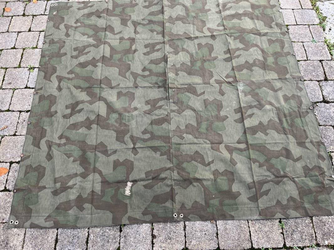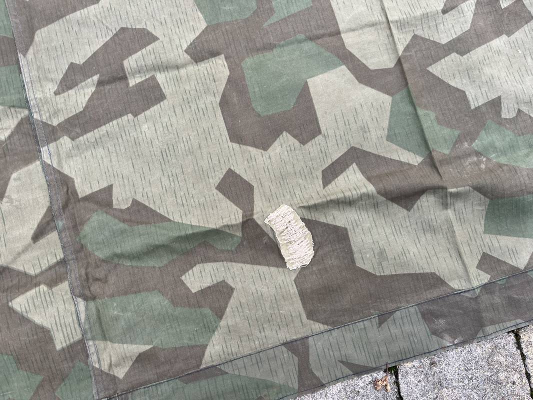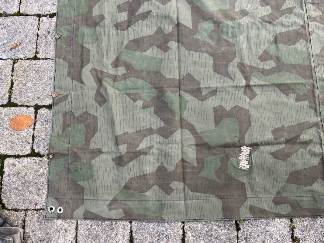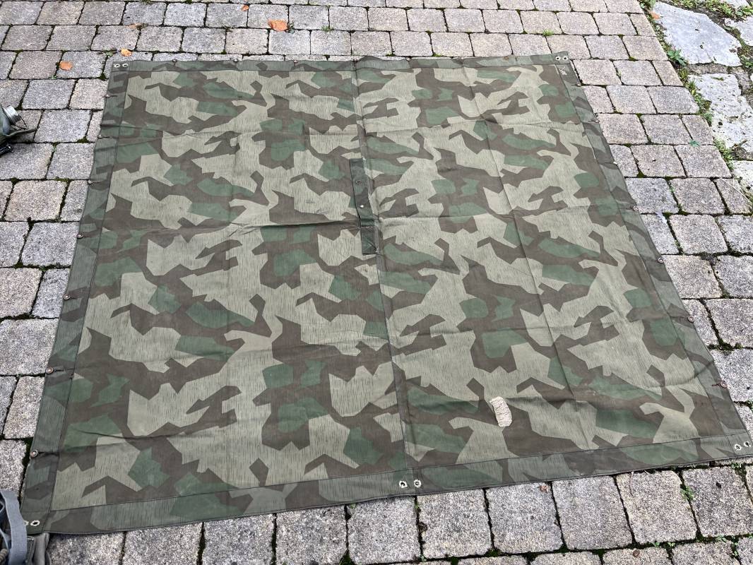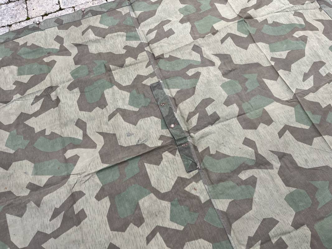 Rare toile de tente individuelle mdle 1935 de l Armee francaise réalisée des 1945 dans de la toile de récupération de la Wehrmacht modele 1931 . Oeillets surfilés en coton , boutons cuvettes alleands en fer , passage de tente en son centre . Belles couleurs de camouflage réversible . Légérement utilisé en parfait état 1945/50 Ref 21213