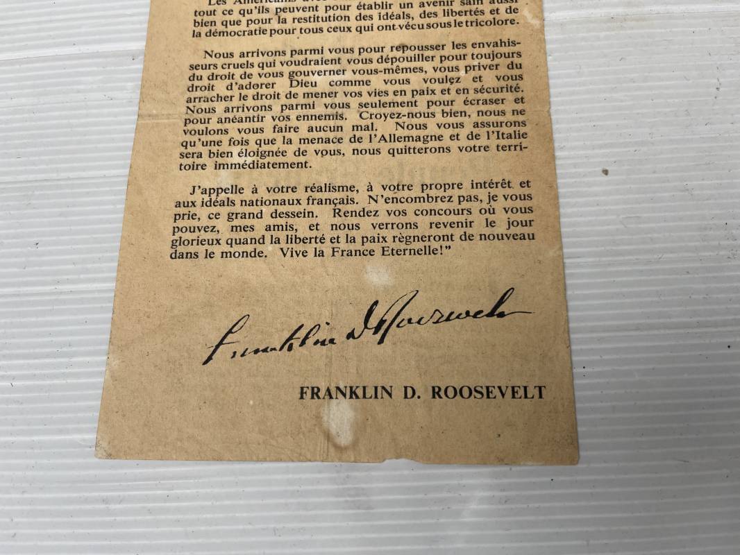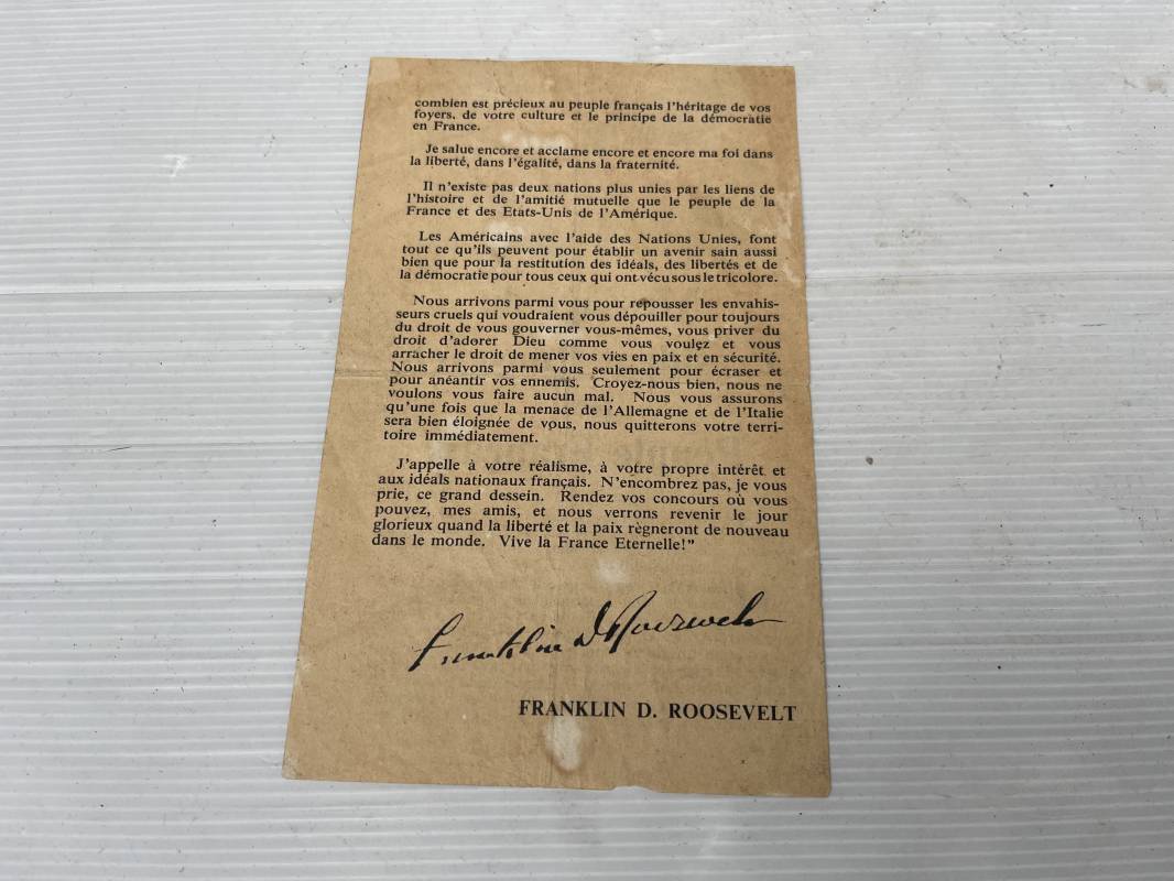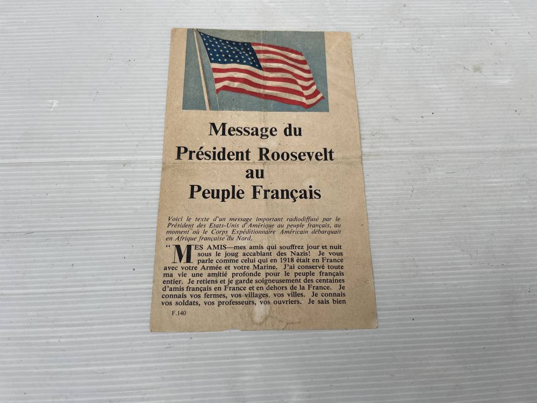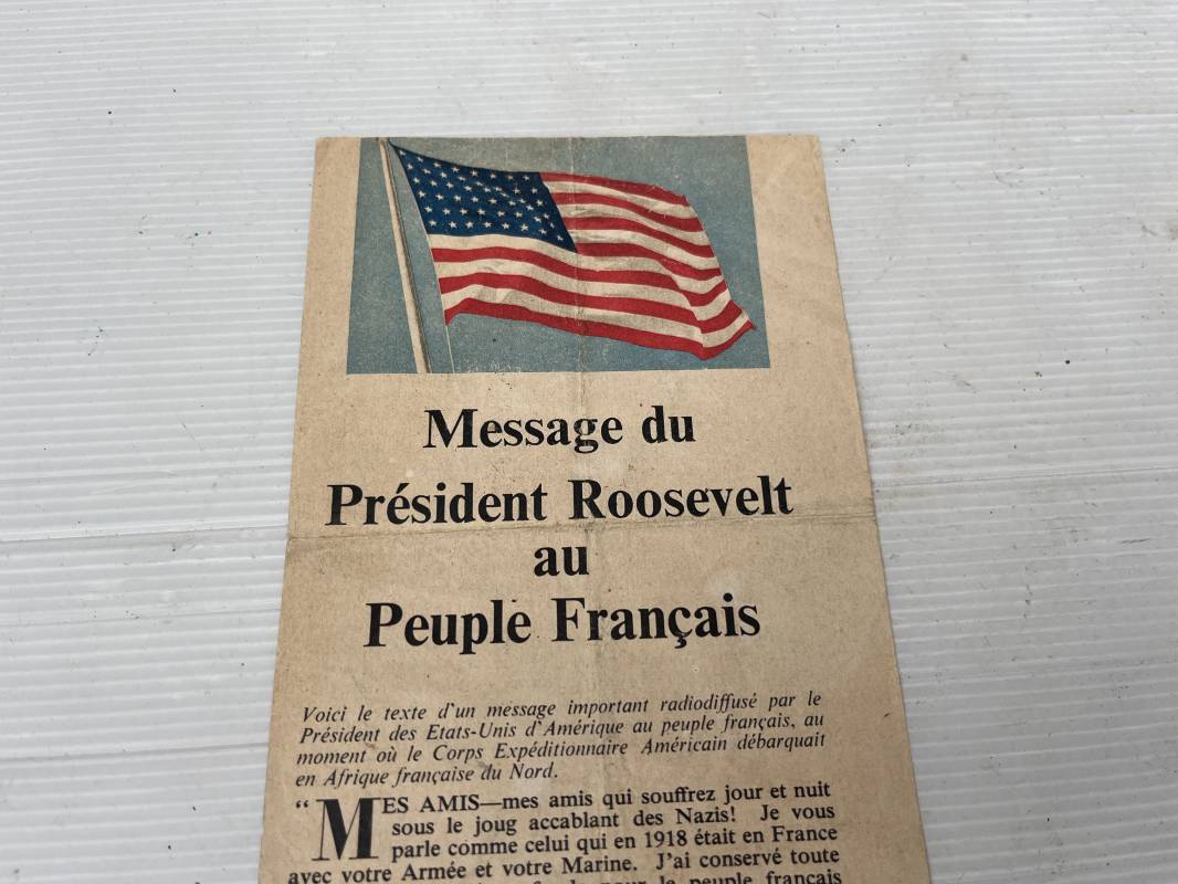 Rare tract Américain adressé au peuple français occupé par l'envahisseur Allemand en France métropolitaine . Tract adressé durant l'été 1944. Tract 13x21cm. Parfait état. Rare document historique. Ref 19101