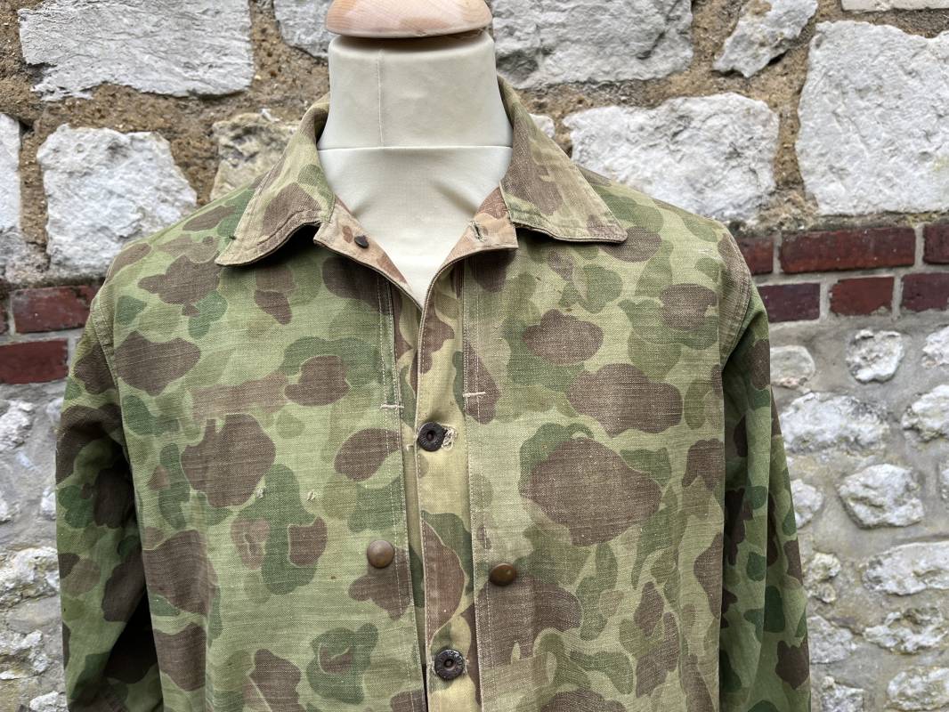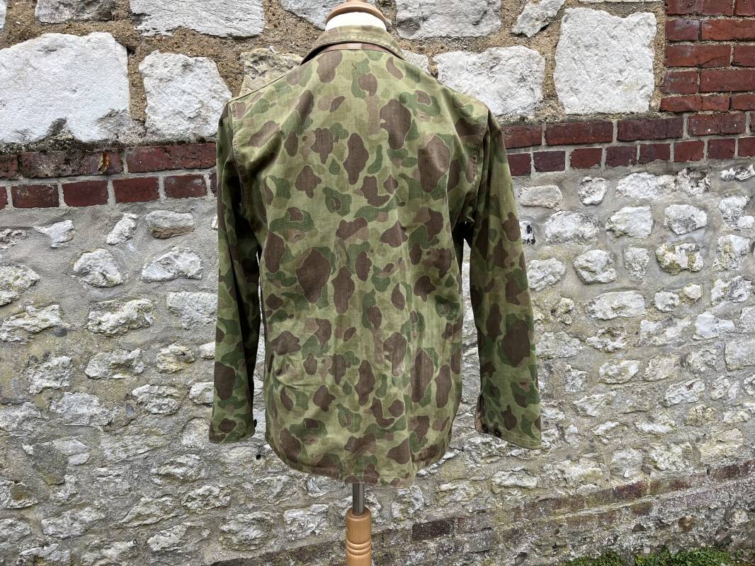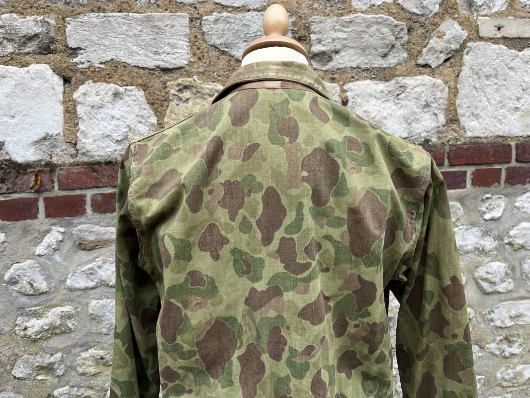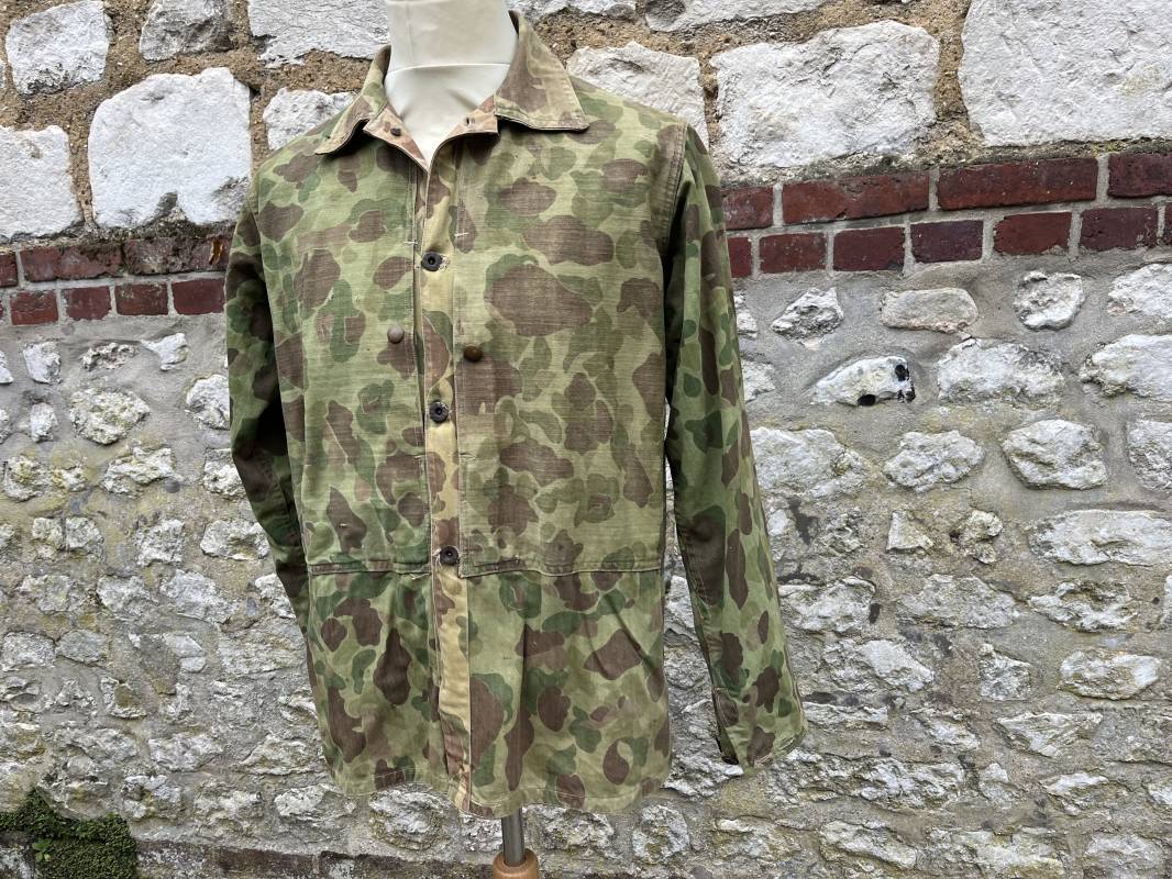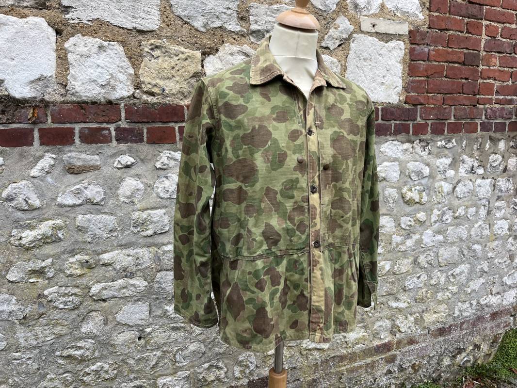 Rare veste modéle 1944 de l USMC en tissu HBT camouflé . Fermeture frontale à ' boutons métalliques rivetes du modele US Marine Corps . Deux poches de poitrine a fermeture par pression . Boutons des manches a fermeture boutons métallique . Camouflage réversible Vert et marron . Marquage encre de la taille 36 . Veste portée en bel état . Couleurs vives . Trés belle patine générale . Veste portée par l 'armee americaine dans le pacifique en 1944/45 ( Okinawa , Iwojima) . Cette veste est également tres paortée par les parachutistes francais en extréme Orient 1945/54 . Cette rare veste a été trouvée en brocante dans le sud de la France . Taile 36 . Largeur épaule 45 cm , longueur 75 cm , manche 61 cm . Rrae veste typique des parachutistes coloniaux francais en Extrème Orient Ref 21227