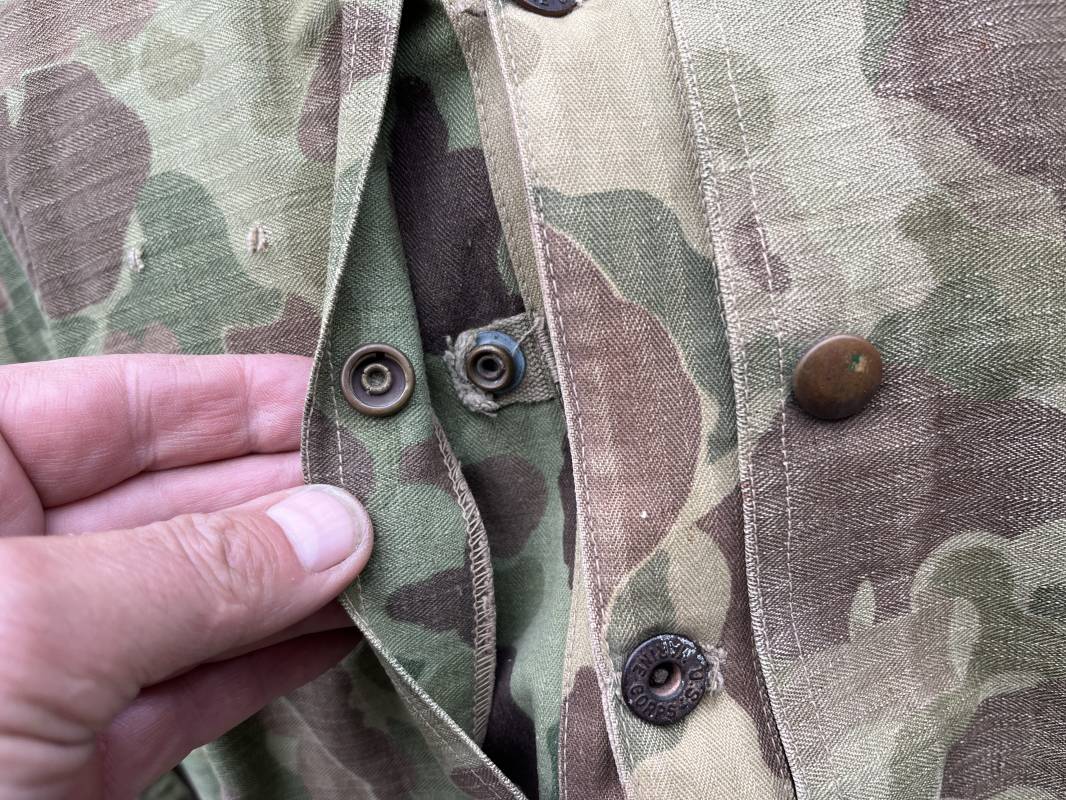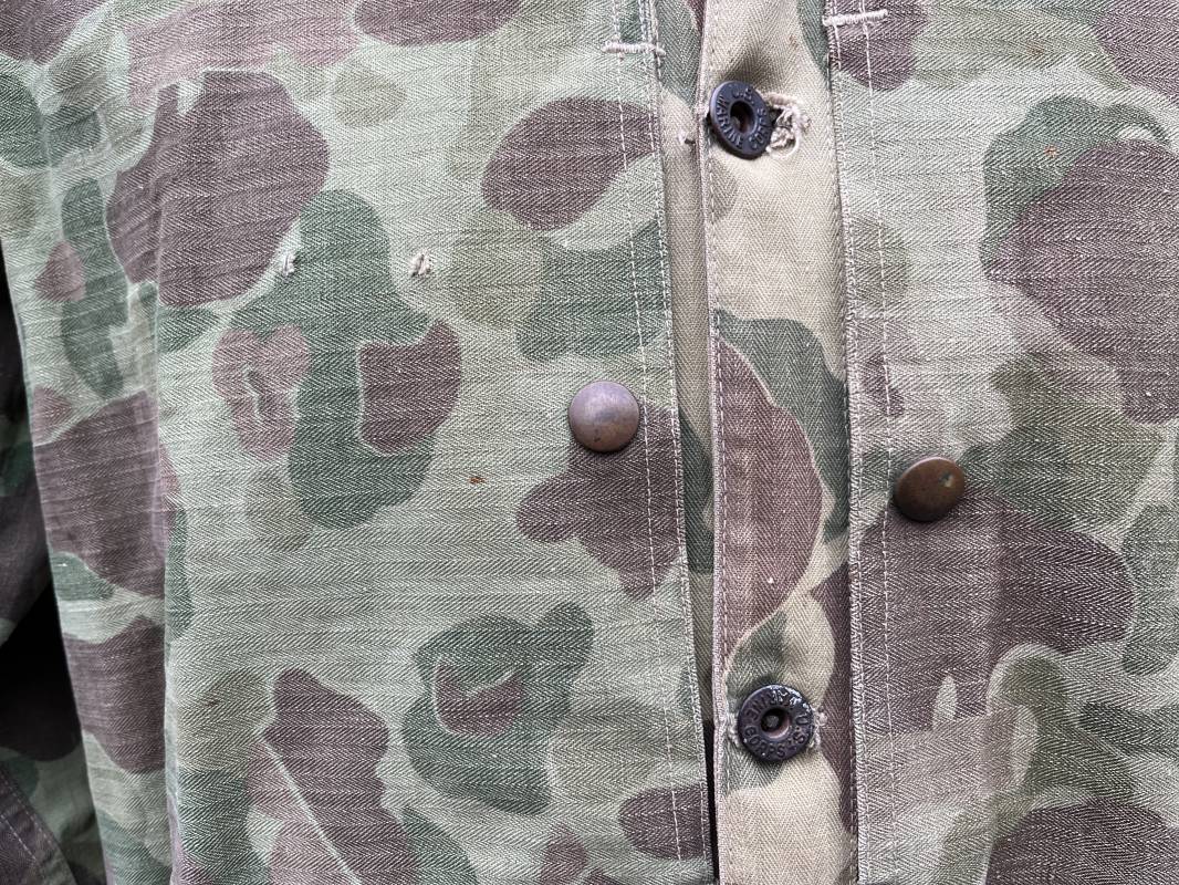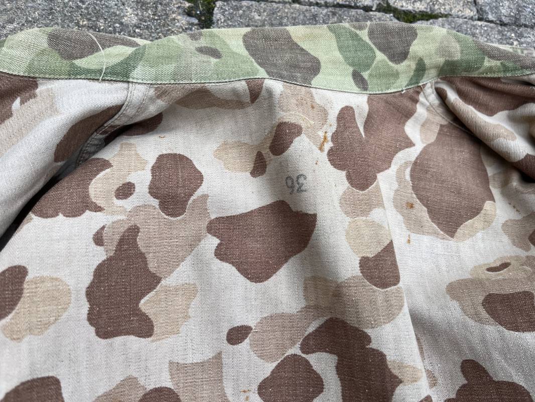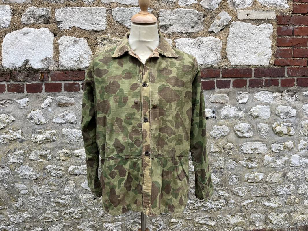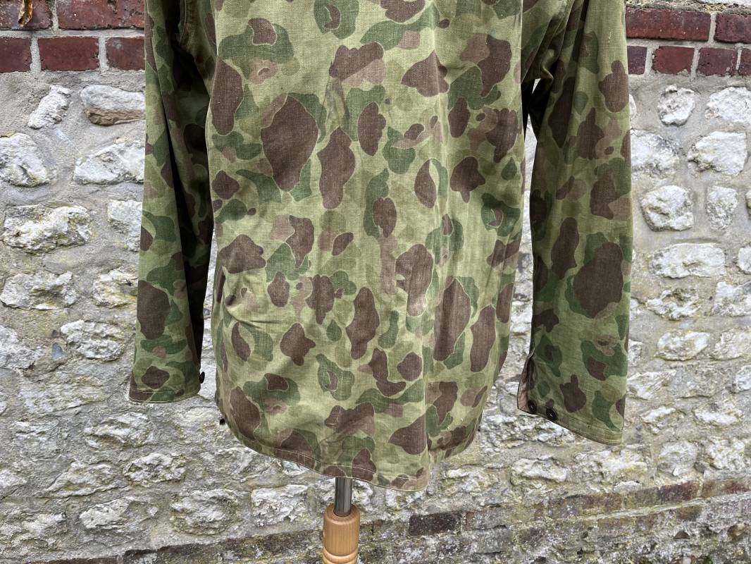 Rare veste modéle 1944 de l USMC en tissu HBT camouflé . Fermeture frontale à ' boutons métalliques rivetes du modele US Marine Corps . Deux poches de poitrine a fermeture par pression . Boutons des manches a fermeture boutons métallique . Camouflage réversible Vert et marron . Marquage encre de la taille 36 . Veste portée en bel état . Couleurs vives . Trés belle patine générale . Veste portée par l 'armee americaine dans le pacifique en 1944/45 ( Okinawa , Iwojima) . Cette veste est également tres paortée par les parachutistes francais en extréme Orient 1945/54 . Cette rare veste a été trouvée en brocante dans le sud de la France . Taile 36 . Largeur épaule 45 cm , longueur 75 cm , manche 61 cm . Rrae veste typique des parachutistes coloniaux francais en Extrème Orient Ref 21227