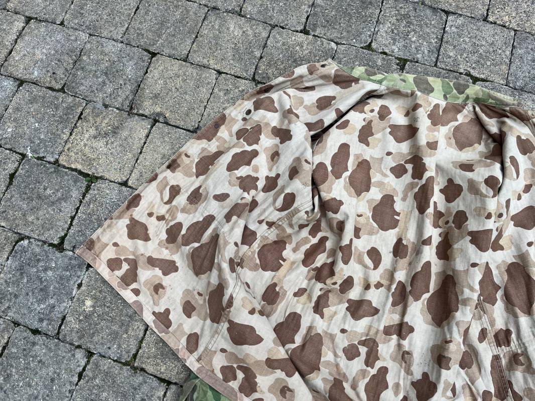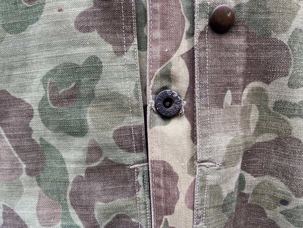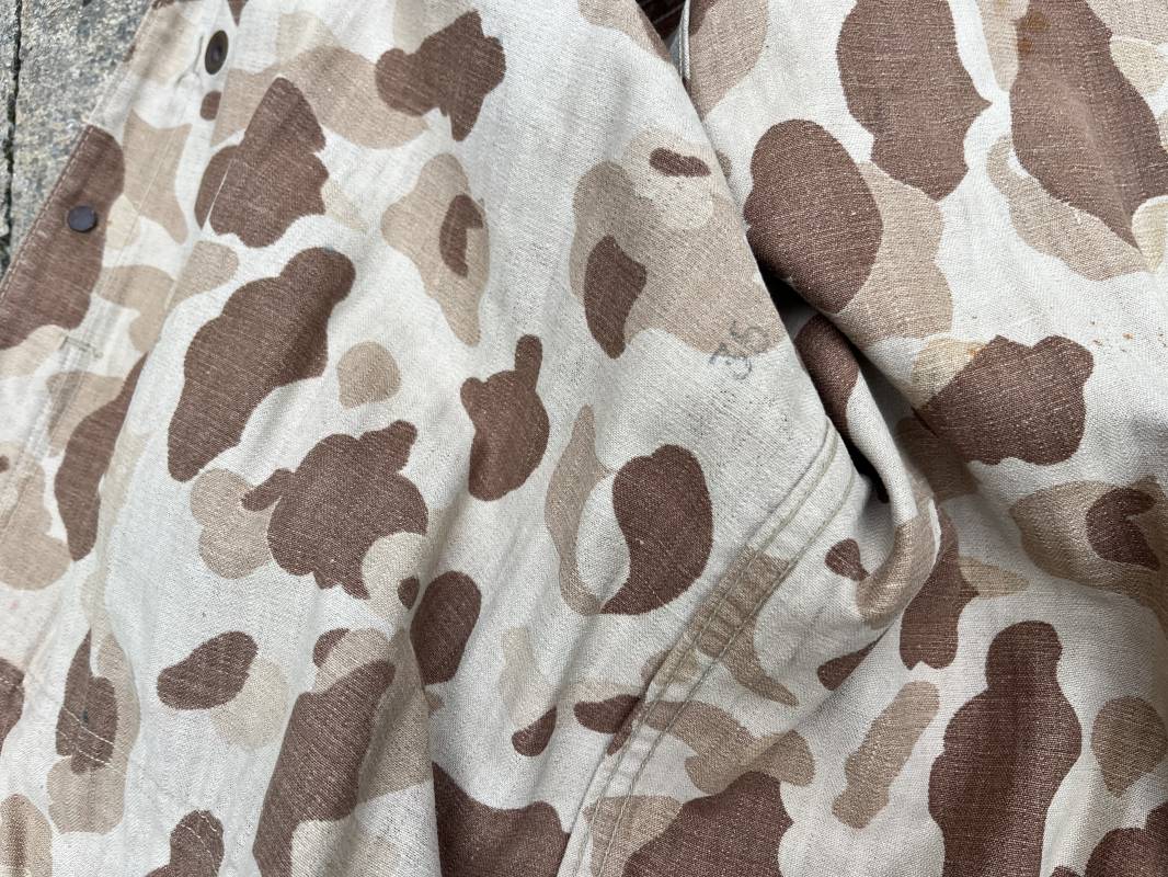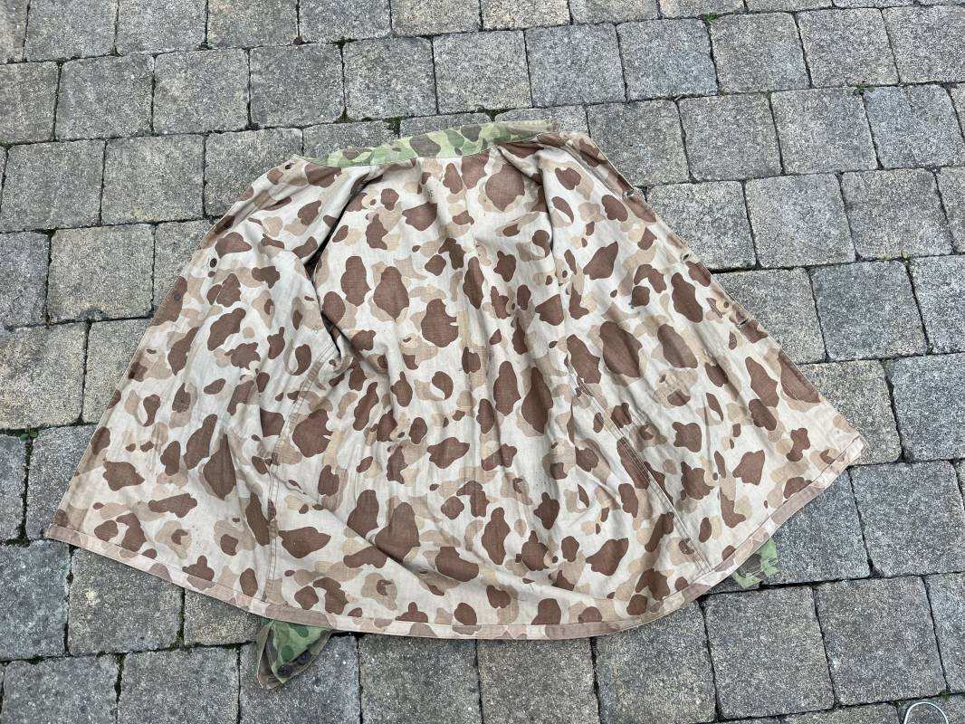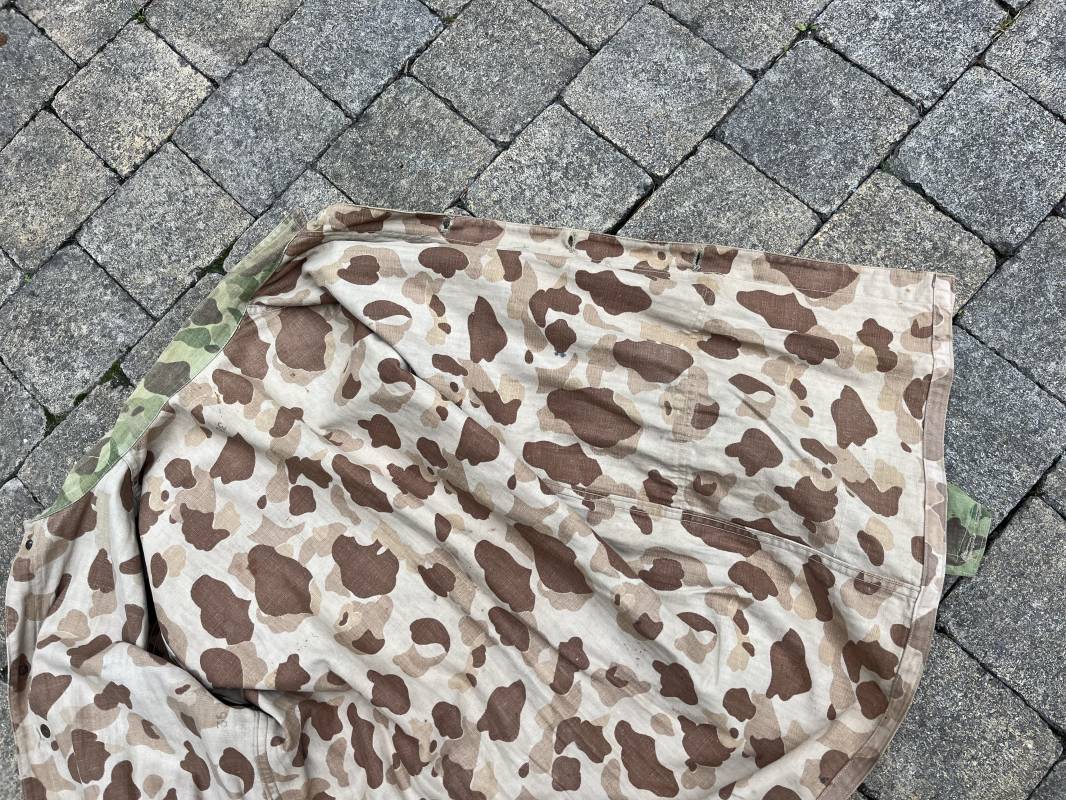 Rare veste modéle 1944 de l USMC en tissu HBT camouflé . Fermeture frontale à ' boutons métalliques rivetes du modele US Marine Corps . Deux poches de poitrine a fermeture par pression . Boutons des manches a fermeture boutons métallique . Camouflage réversible Vert et marron . Marquage encre de la taille 36 . Veste portée en bel état . Couleurs vives . Trés belle patine générale . Veste portée par l 'armee americaine dans le pacifique en 1944/45 ( Okinawa , Iwojima) . Cette veste est également tres paortée par les parachutistes francais en extréme Orient 1945/54 . Cette rare veste a été trouvée en brocante dans le sud de la France . Taile 36 . Largeur épaule 45 cm , longueur 75 cm , manche 61 cm . Rrae veste typique des parachutistes coloniaux francais en Extrème Orient Ref 21227