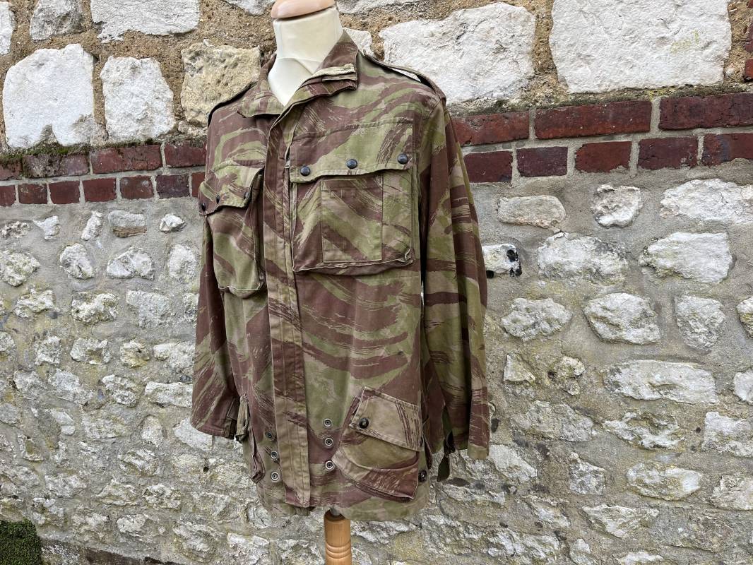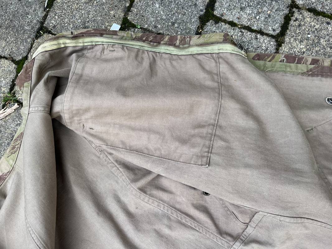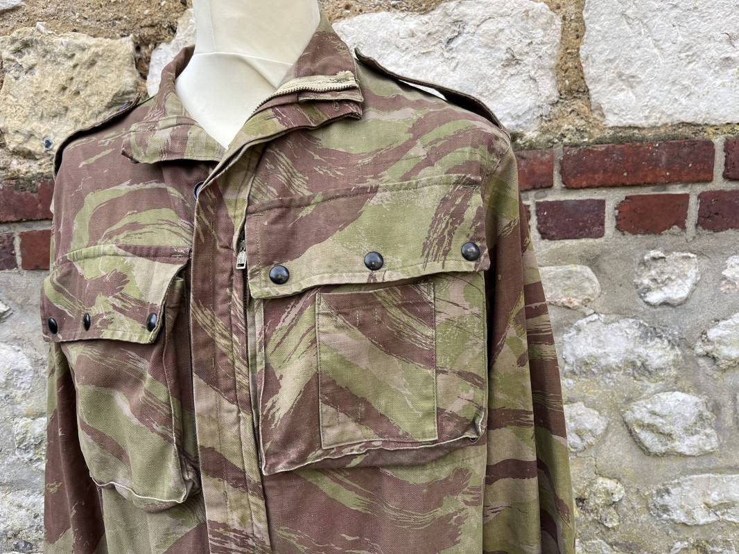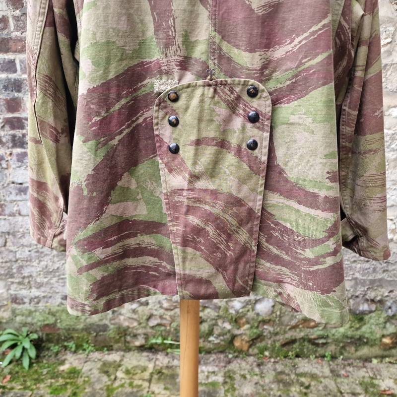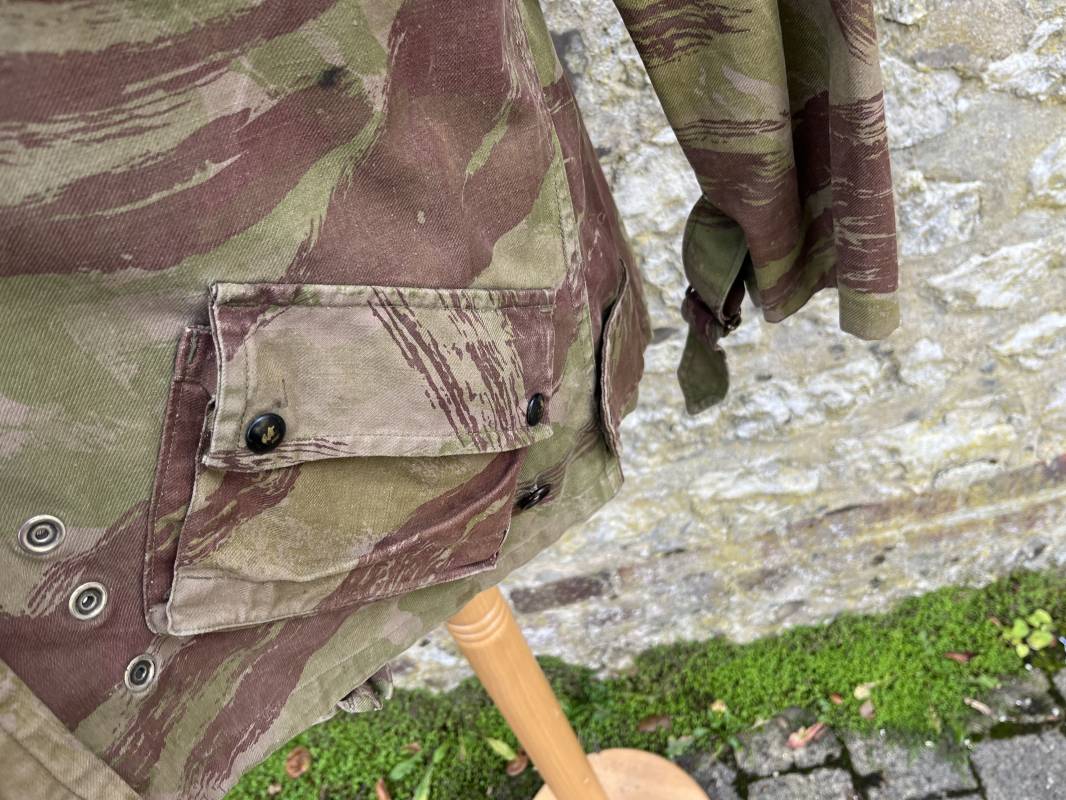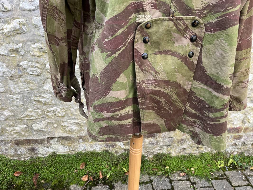 Rare Veste de saut Parachutiste Modèle TAP 1947/52 , fermeture frontale à huit boutons et glissière d'origine et fonctionnelle fabricant AILEE . Quatre poches à pression dont une à glissière fonctionnelle et d'origine fabricant AILEE . Pattes de serrage en bouts de manches avec larges boucles en métal anodizé . Pattes d épaules . Oeillets de ventilation sous les aisselles . Marquage fabricant 'S.I.A. Jouet les tours '. Taille E 1 L . Queue de castor avec pressions . Largeur épaules 50 cm , logueur 80 cm , manches 58 cm . Veste légèrement portée en parfait état . Trés belle patine générale . Rare veste typique de la bataille de Dien bien Phu . Veste définitive en collection para indo . Rare Ref 21425