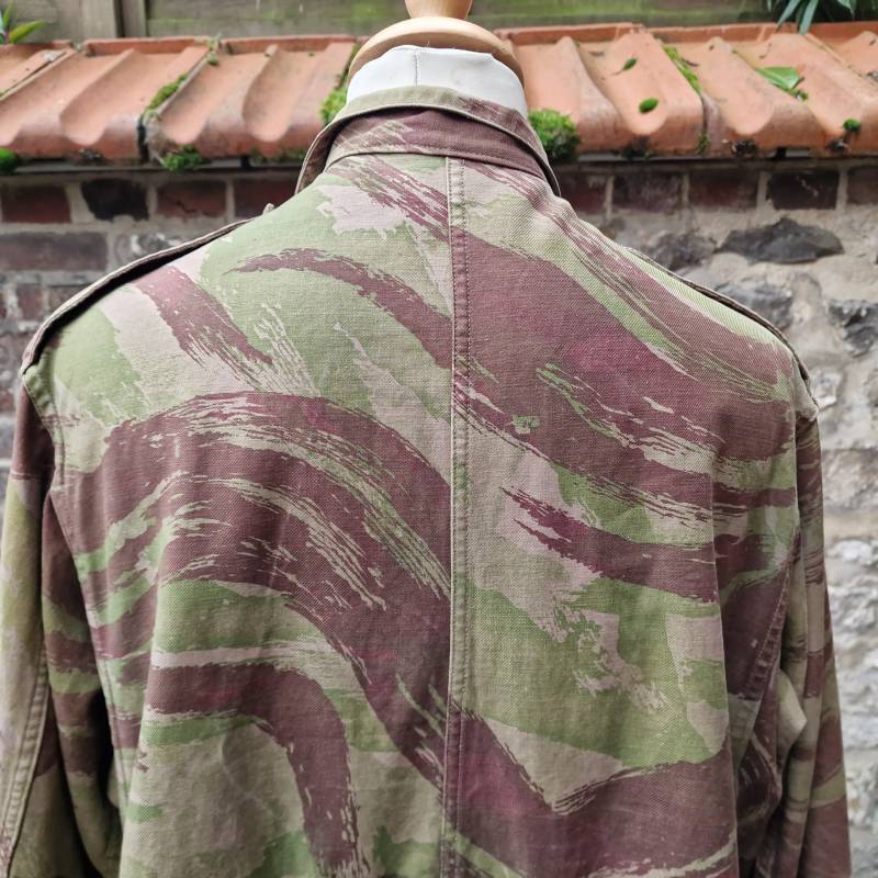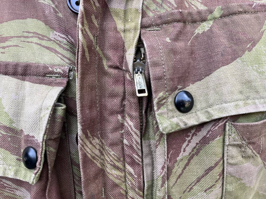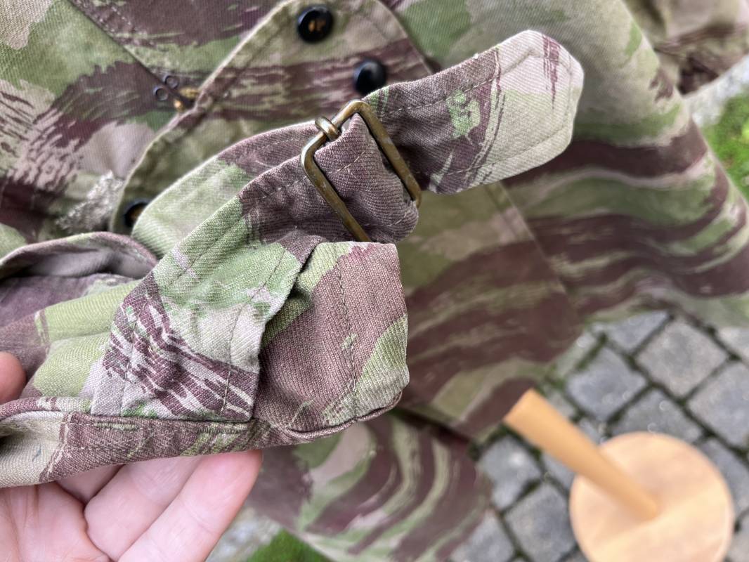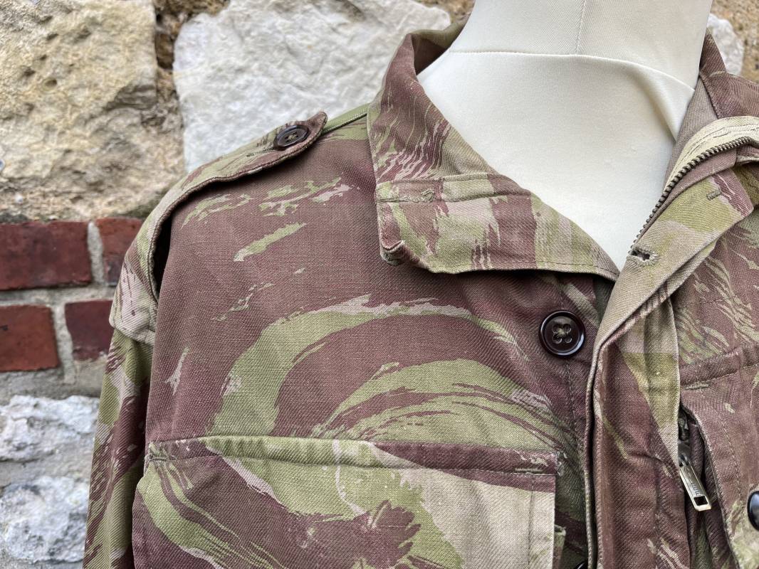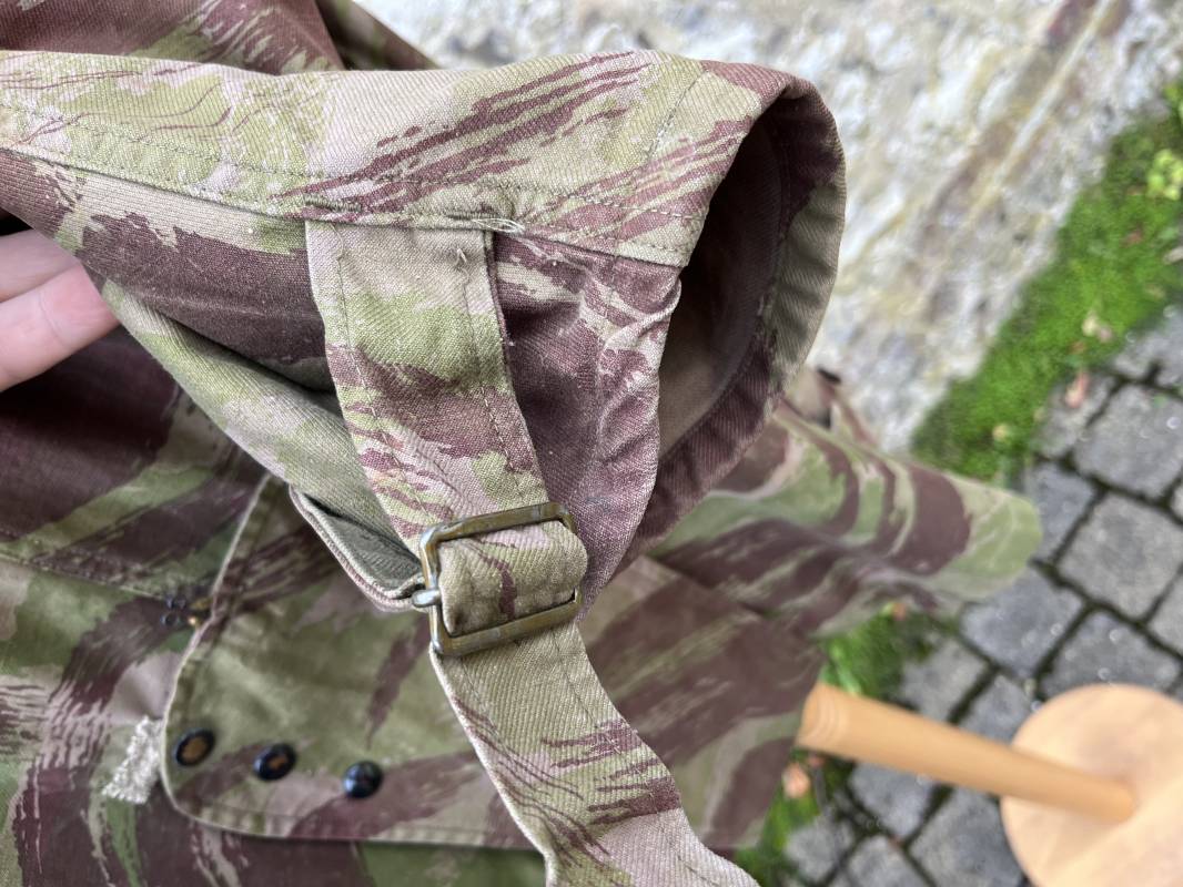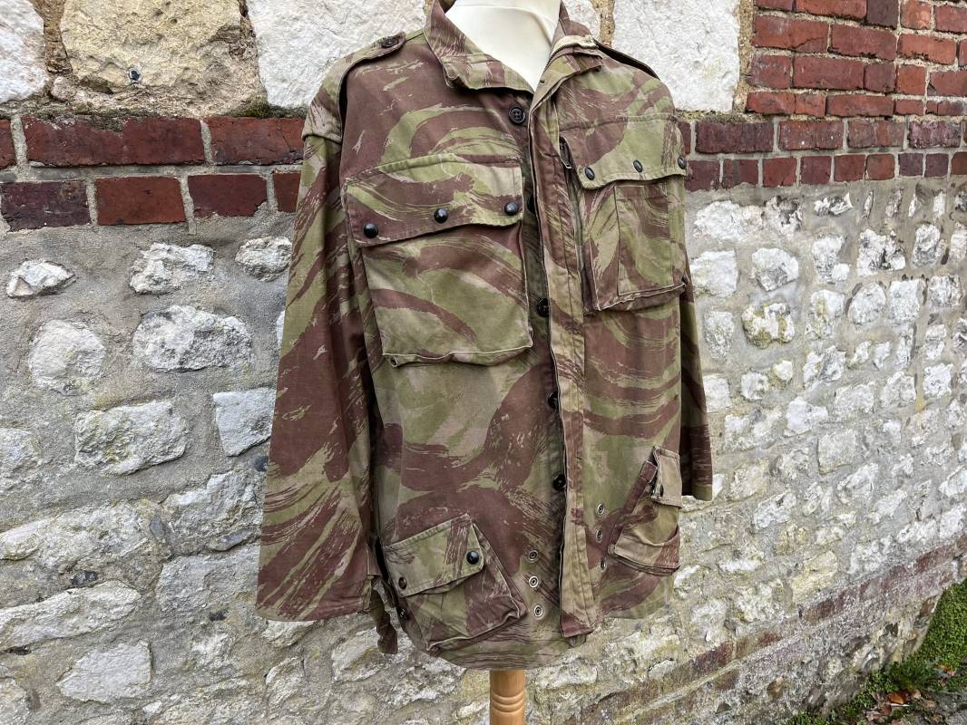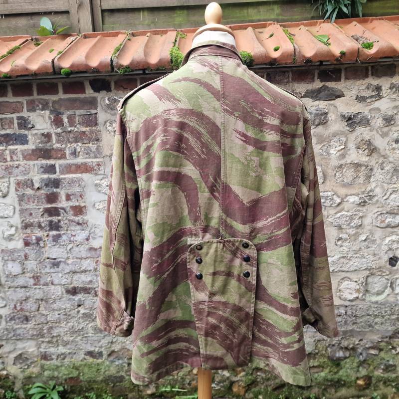 Rare Veste de saut Parachutiste Modèle TAP 1947/52 , fermeture frontale à huit boutons et glissière d'origine et fonctionnelle fabricant AILEE . Quatre poches à pression dont une à glissière fonctionnelle et d'origine fabricant AILEE . Pattes de serrage en bouts de manches avec larges boucles en métal anodizé . Pattes d épaules . Oeillets de ventilation sous les aisselles . Marquage fabricant 'S.I.A. Jouet les tours '. Taille E 1 L . Queue de castor avec pressions . Largeur épaules 50 cm , logueur 80 cm , manches 58 cm . Veste légèrement portée en parfait état . Trés belle patine générale . Rare veste typique de la bataille de Dien bien Phu . Veste définitive en collection para indo . Rare Ref 21425