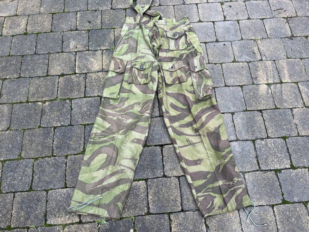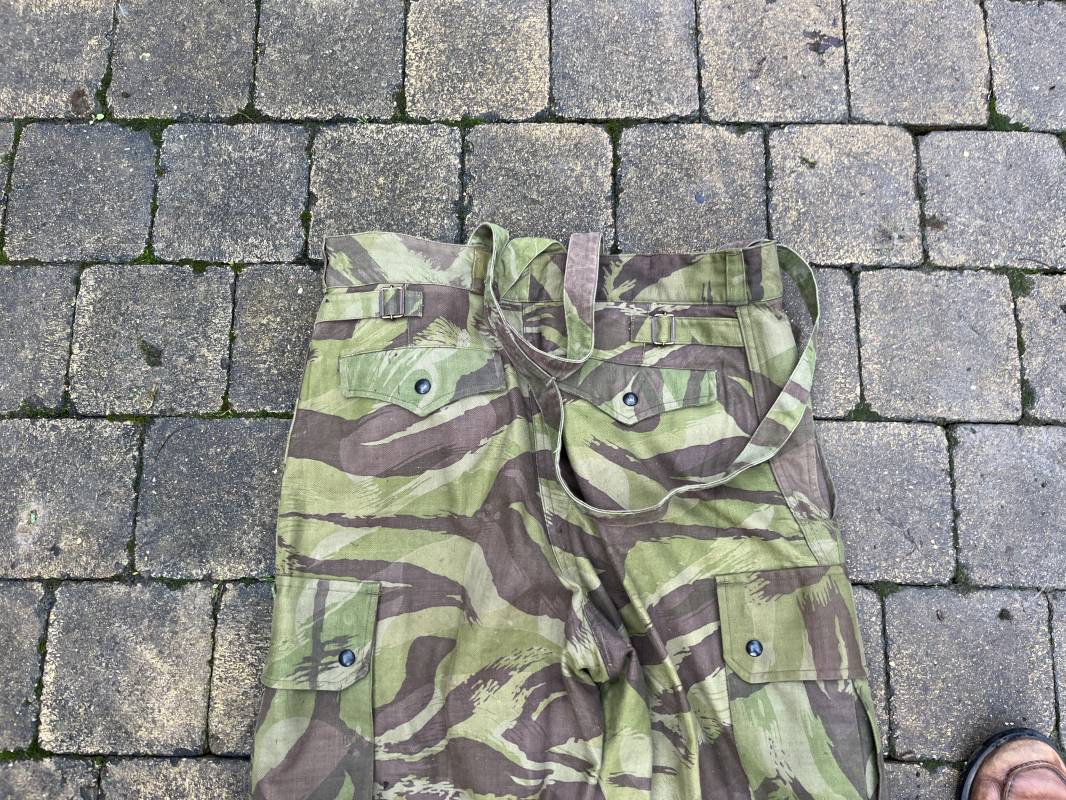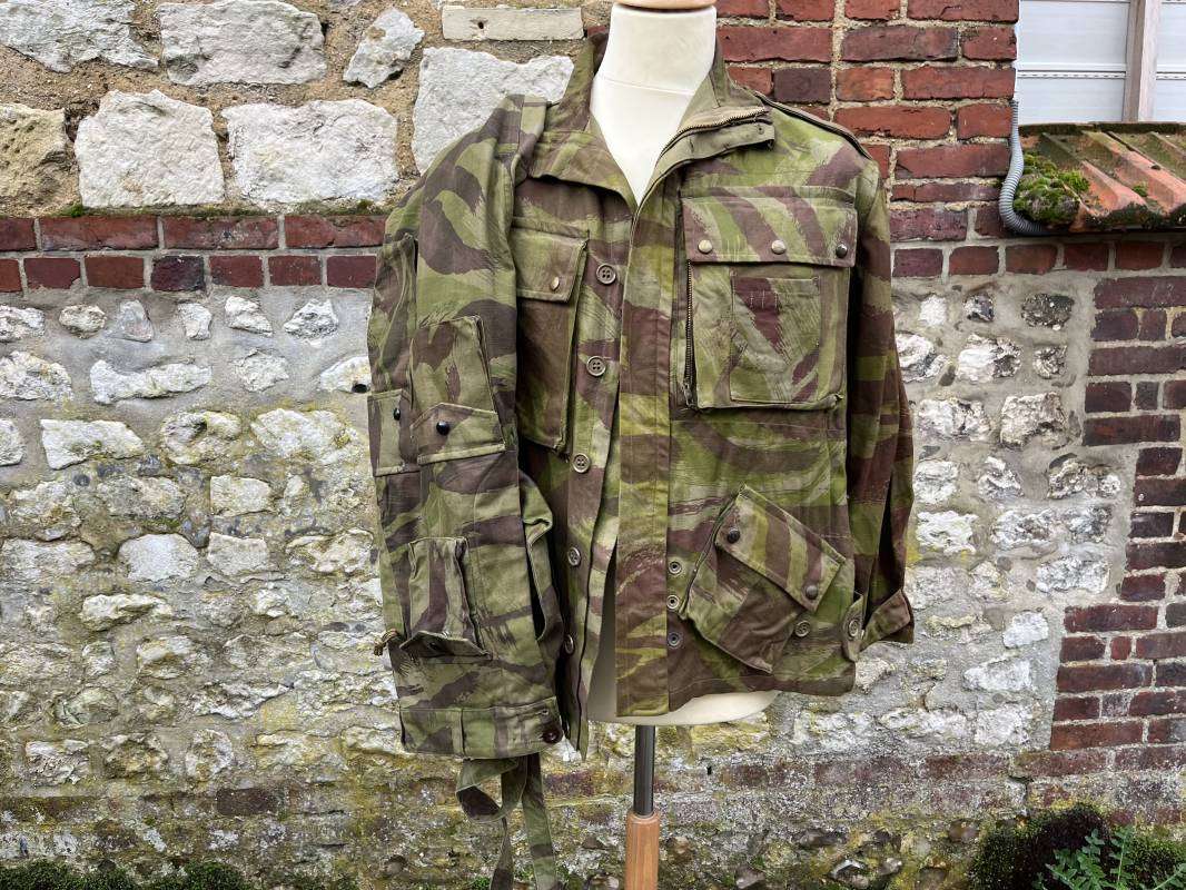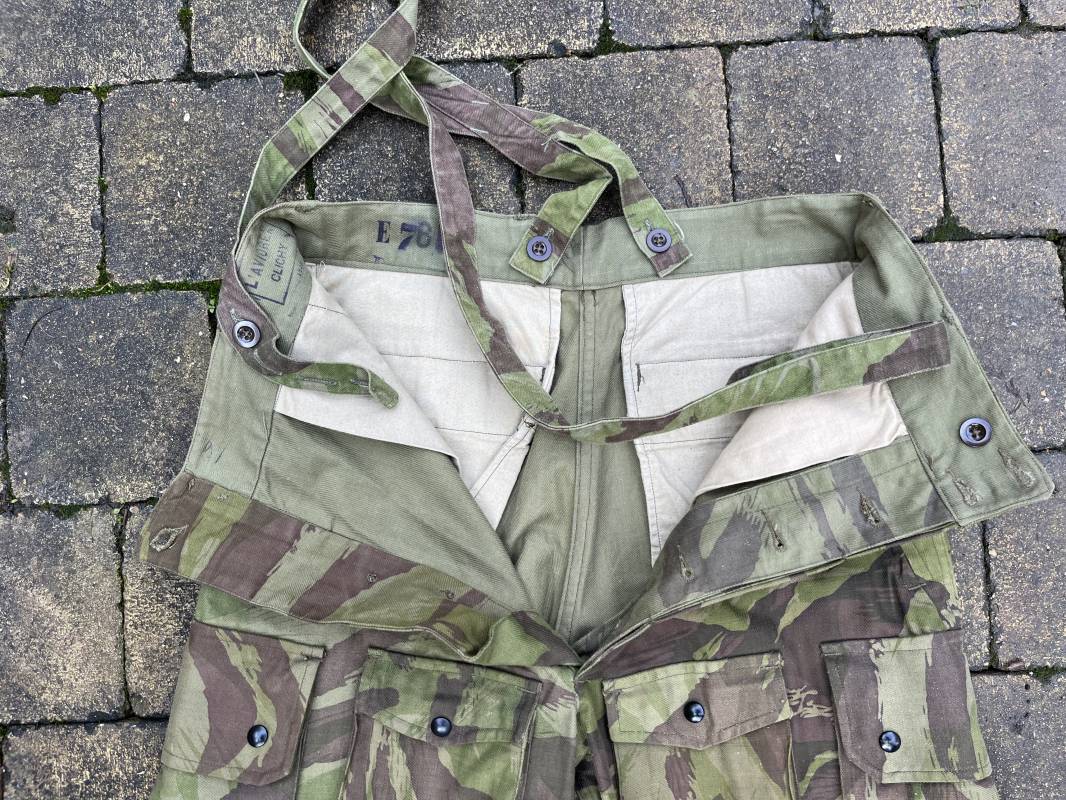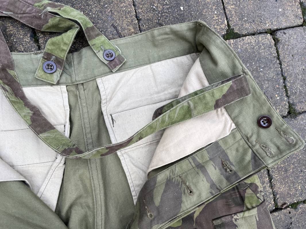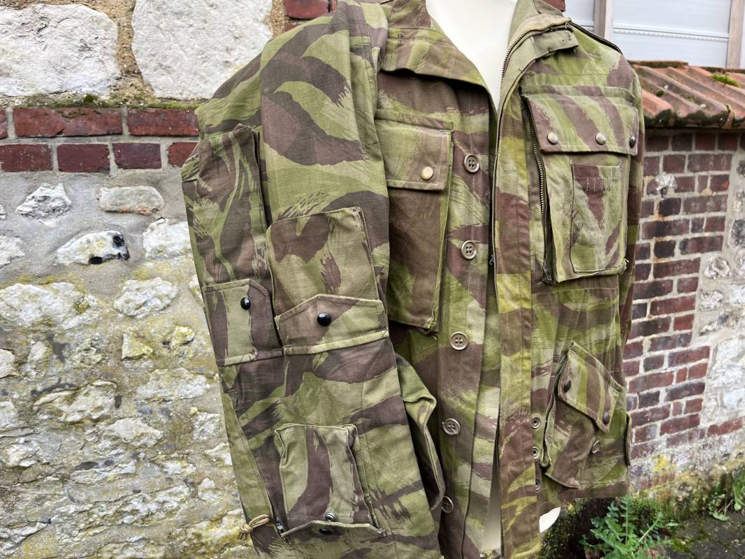 Rare tenue de saut de parachutiste ( veste et pantalon ) TAP Modéle 1947/52 . Veste de saut Parachutiste Modèle TAP 1947/52 en coton croisé camouflé , fermeture frontale à huit boutons et glissière d'origine et fonctionnelle fabricant AILEE . Quatre poches avec rabats a trois pressions dont une à glissière fonctionnelle et d'origine fabricant SIFER . Pattes de serrage en bouts de manches avec larges boucles en métal anodizé . Pattes d épaules . Oeillets de ventilation sous les aisselles . Marquage fabricant 'DAVIERE PARIS CALAIS '. Taille I 1 C . Queue de castor avec pressions . Largeur épaules 50 cm , longueur 73 cm , manche 55 cm . Rare Pantalon de saut camouflé pour parachutiste modéle TAP 47/52 . Deux poches cargo et trois poches à grenades avec rabats à boutons pression . Quatre poches dont deux fessières ,glissière sur une poche d'origine et fonctionnelle fabricant LFF avec tirette en coton ( suspente parachute) . . Deux pattes de serrage latérales avec boucles métalliques . Bas de jambes à lacets . Boutons plastique cousus d'origine . Passants tissu de ceinturon Marquage fabricant L AVIOREX CLICHY 1953 Taille E 76 L Taille 40 longueur 110 cm .Paire de bretelles en toile camouflée . Veste et pantalon en superbe état . Rare tenue typique de la bataille de Dien bien Phu . Tenue définitive en collection Ref 20232