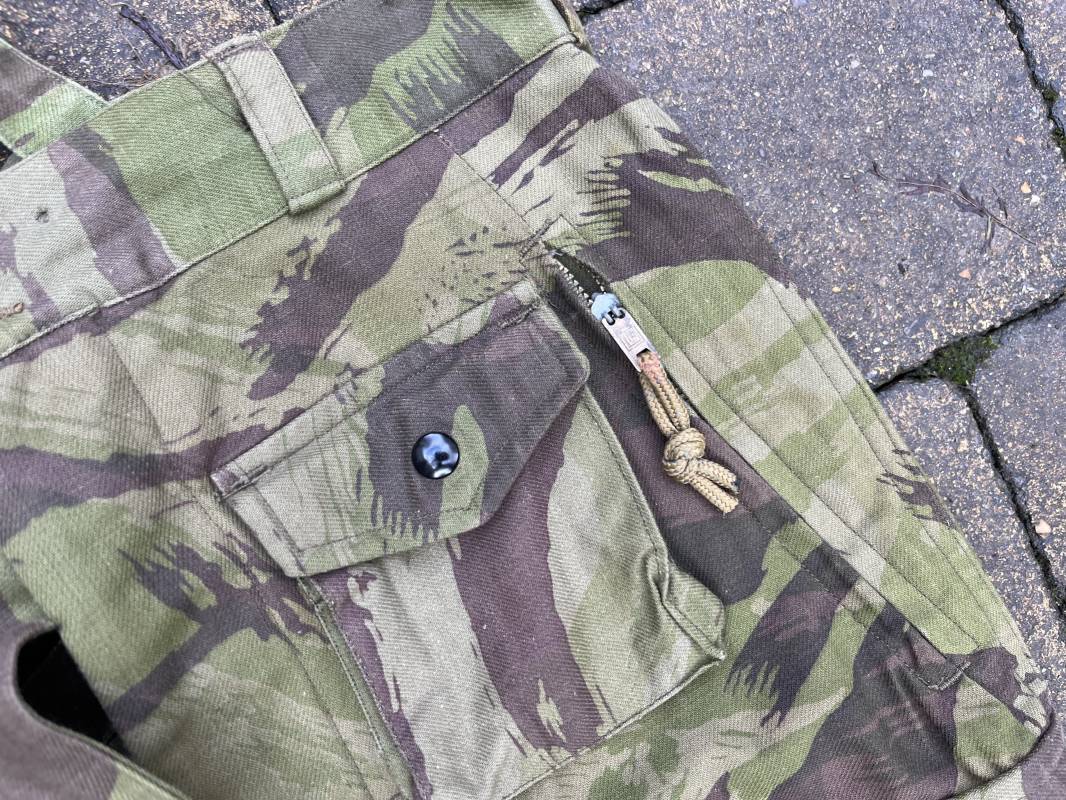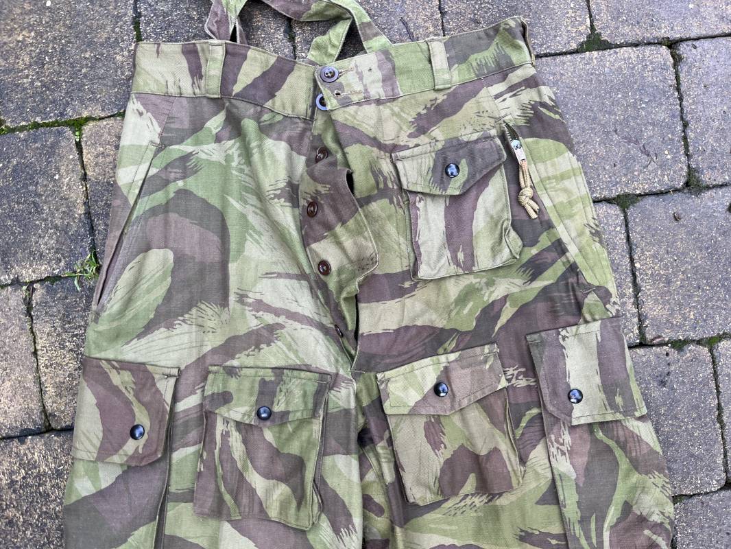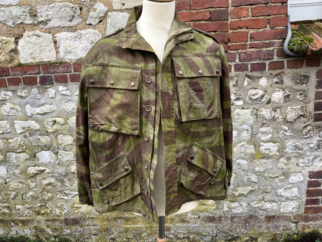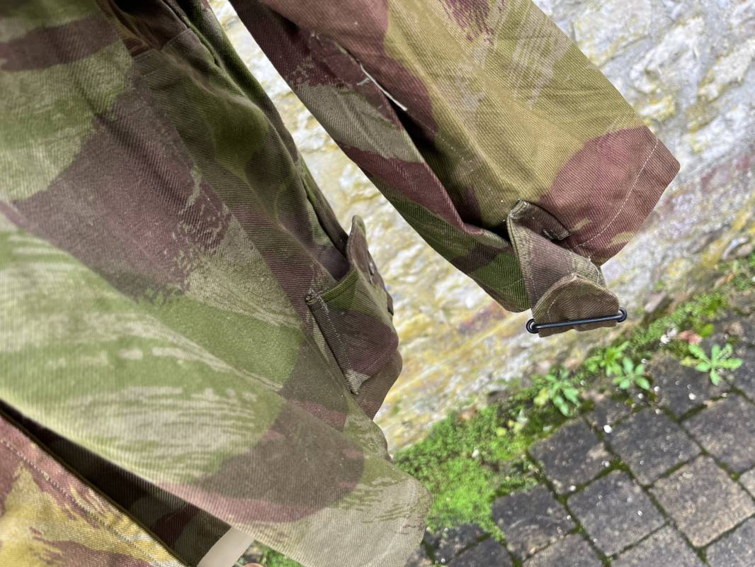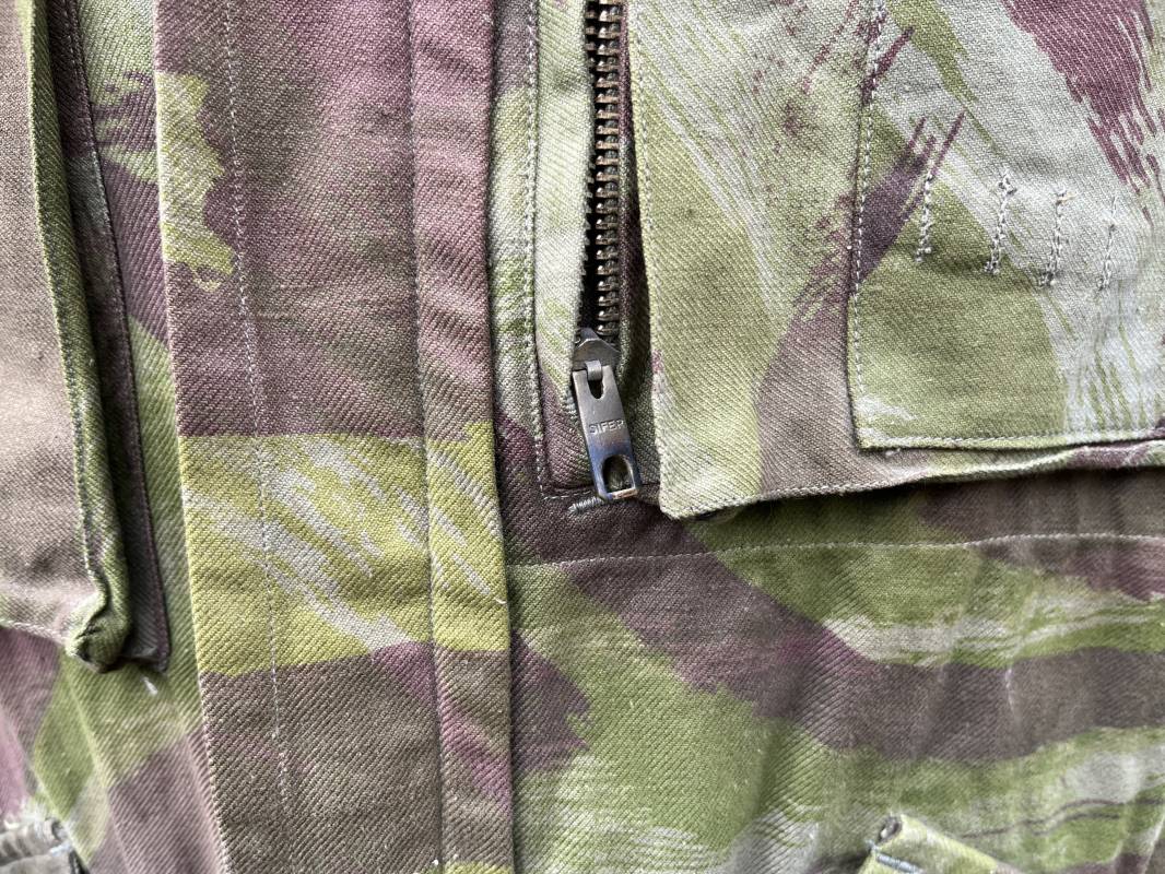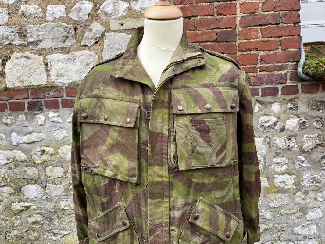 Rare tenue de saut de parachutiste ( veste et pantalon ) TAP Modéle 1947/52 . Veste de saut Parachutiste Modèle TAP 1947/52 en coton croisé camouflé , fermeture frontale à huit boutons et glissière d'origine et fonctionnelle fabricant AILEE . Quatre poches avec rabats a trois pressions dont une à glissière fonctionnelle et d'origine fabricant SIFER . Pattes de serrage en bouts de manches avec larges boucles en métal anodizé . Pattes d épaules . Oeillets de ventilation sous les aisselles . Marquage fabricant 'DAVIERE PARIS CALAIS '. Taille I 1 C . Queue de castor avec pressions . Largeur épaules 50 cm , longueur 73 cm , manche 55 cm . Rare Pantalon de saut camouflé pour parachutiste modéle TAP 47/52 . Deux poches cargo et trois poches à grenades avec rabats à boutons pression . Quatre poches dont deux fessières ,glissière sur une poche d'origine et fonctionnelle fabricant LFF avec tirette en coton ( suspente parachute) . . Deux pattes de serrage latérales avec boucles métalliques . Bas de jambes à lacets . Boutons plastique cousus d'origine . Passants tissu de ceinturon Marquage fabricant L AVIOREX CLICHY 1953 Taille E 76 L Taille 40 longueur 110 cm .Paire de bretelles en toile camouflée . Veste et pantalon en superbe état . Rare tenue typique de la bataille de Dien bien Phu . Tenue définitive en collection Ref 20232
