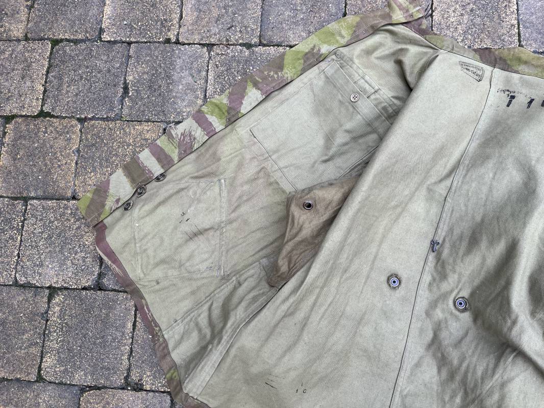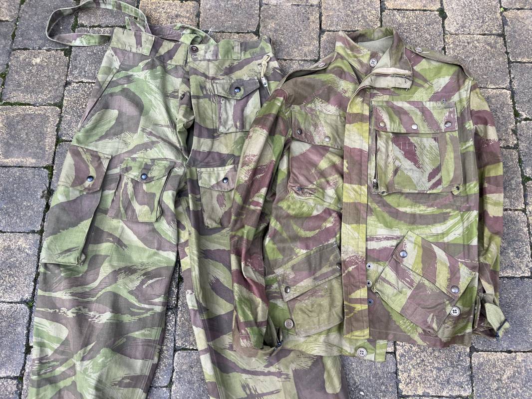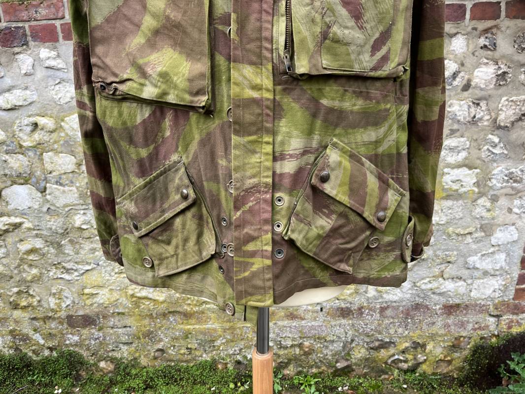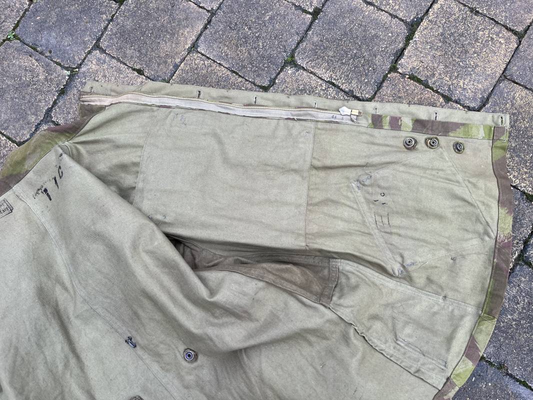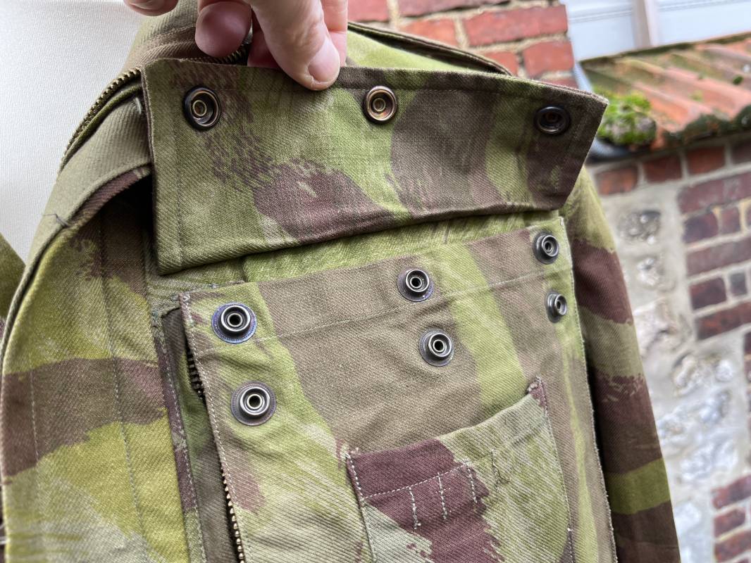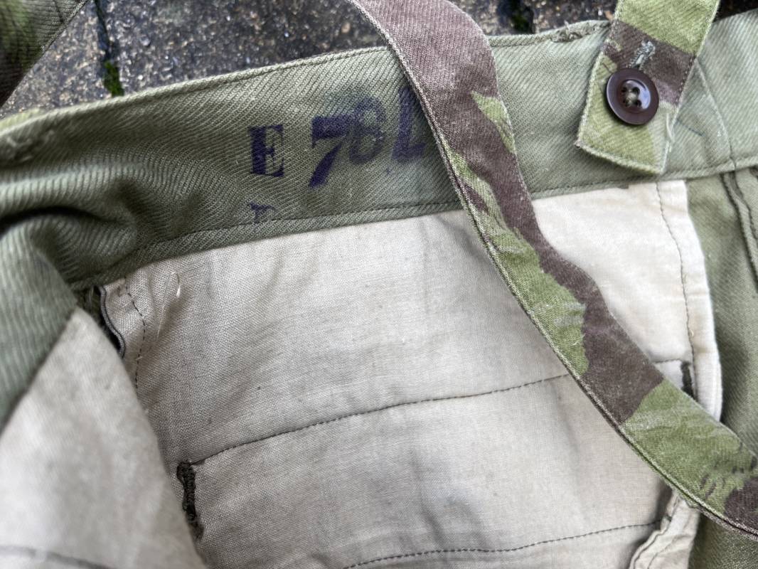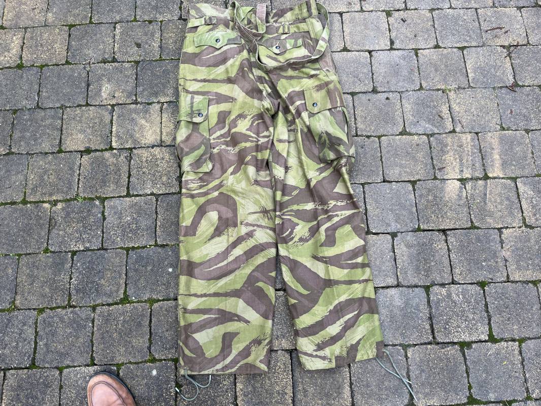 Rare tenue de saut de parachutiste ( veste et pantalon ) TAP Modéle 1947/52 . Veste de saut Parachutiste Modèle TAP 1947/52 en coton croisé camouflé , fermeture frontale à huit boutons et glissière d'origine et fonctionnelle fabricant AILEE . Quatre poches avec rabats a trois pressions dont une à glissière fonctionnelle et d'origine fabricant SIFER . Pattes de serrage en bouts de manches avec larges boucles en métal anodizé . Pattes d épaules . Oeillets de ventilation sous les aisselles . Marquage fabricant 'DAVIERE PARIS CALAIS '. Taille I 1 C . Queue de castor avec pressions . Largeur épaules 50 cm , longueur 73 cm , manche 55 cm . Rare Pantalon de saut camouflé pour parachutiste modéle TAP 47/52 . Deux poches cargo et trois poches à grenades avec rabats à boutons pression . Quatre poches dont deux fessières ,glissière sur une poche d'origine et fonctionnelle fabricant LFF avec tirette en coton ( suspente parachute) . . Deux pattes de serrage latérales avec boucles métalliques . Bas de jambes à lacets . Boutons plastique cousus d'origine . Passants tissu de ceinturon Marquage fabricant L AVIOREX CLICHY 1953 Taille E 76 L Taille 40 longueur 110 cm .Paire de bretelles en toile camouflée . Veste et pantalon en superbe état . Rare tenue typique de la bataille de Dien bien Phu . Tenue définitive en collection Ref 20232