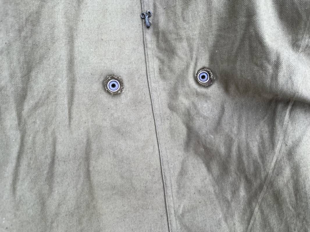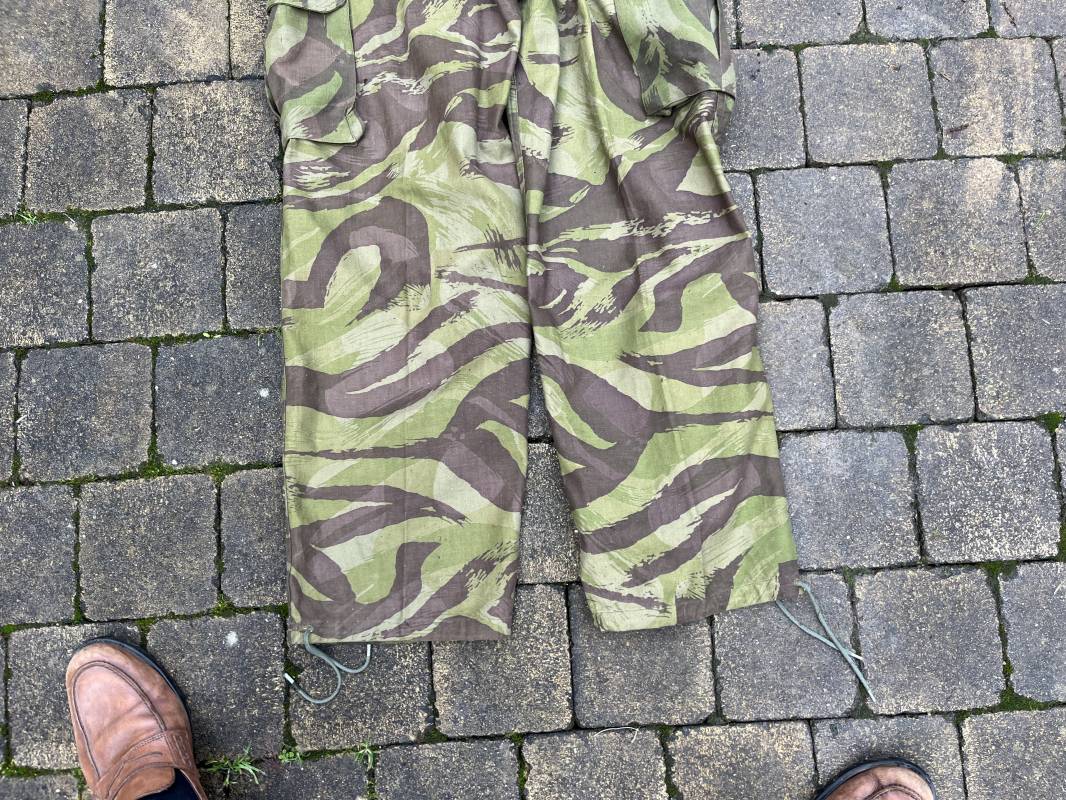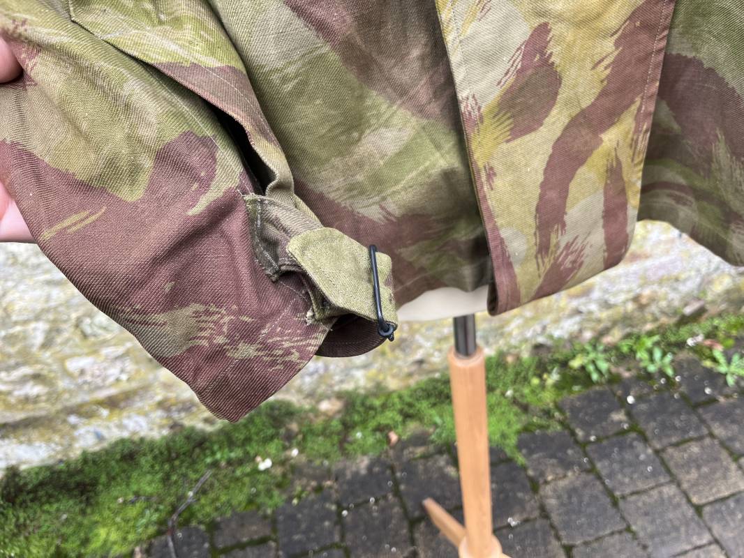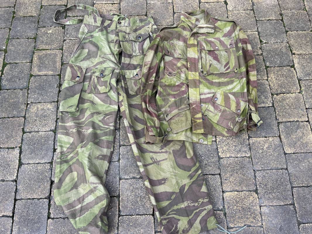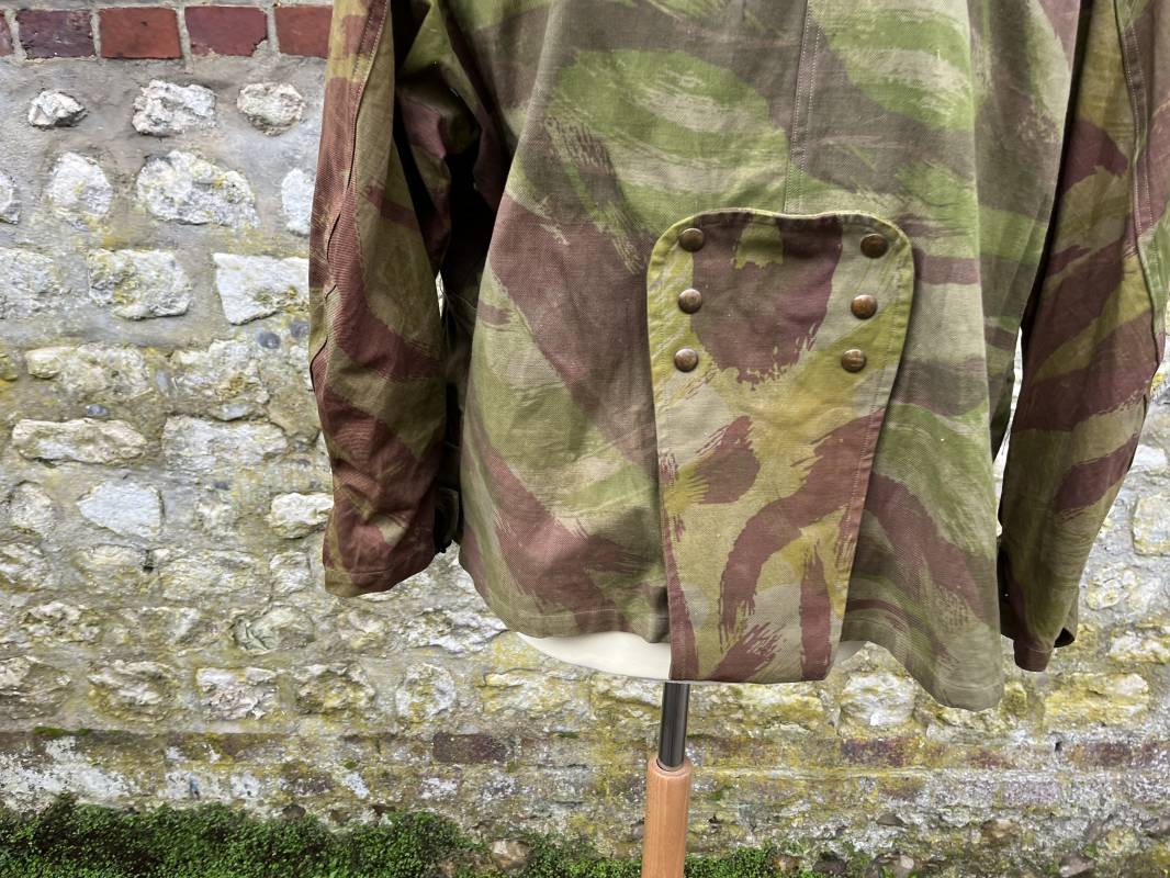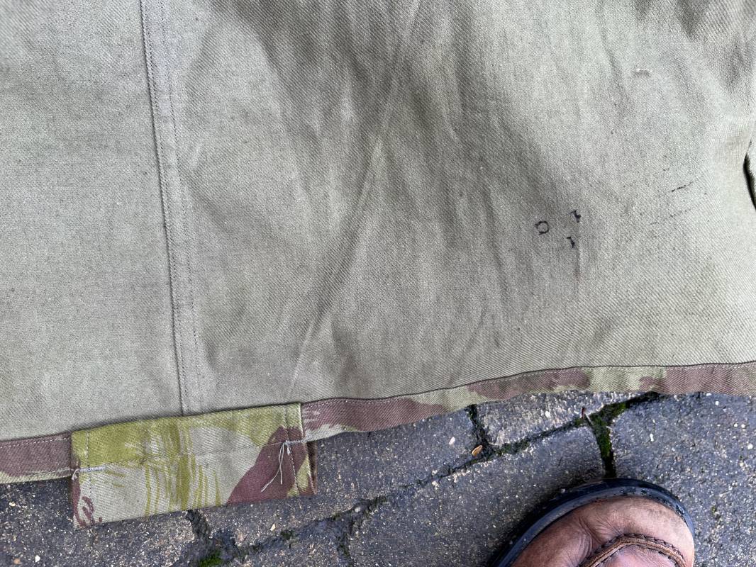 Rare tenue de saut de parachutiste ( veste et pantalon ) TAP Modéle 1947/52 . Veste de saut Parachutiste Modèle TAP 1947/52 en coton croisé camouflé , fermeture frontale à huit boutons et glissière d'origine et fonctionnelle fabricant AILEE . Quatre poches avec rabats a trois pressions dont une à glissière fonctionnelle et d'origine fabricant SIFER . Pattes de serrage en bouts de manches avec larges boucles en métal anodizé . Pattes d épaules . Oeillets de ventilation sous les aisselles . Marquage fabricant 'DAVIERE PARIS CALAIS '. Taille I 1 C . Queue de castor avec pressions . Largeur épaules 50 cm , longueur 73 cm , manche 55 cm . Rare Pantalon de saut camouflé pour parachutiste modéle TAP 47/52 . Deux poches cargo et trois poches à grenades avec rabats à boutons pression . Quatre poches dont deux fessières ,glissière sur une poche d'origine et fonctionnelle fabricant LFF avec tirette en coton ( suspente parachute) . . Deux pattes de serrage latérales avec boucles métalliques . Bas de jambes à lacets . Boutons plastique cousus d'origine . Passants tissu de ceinturon Marquage fabricant L AVIOREX CLICHY 1953 Taille E 76 L Taille 40 longueur 110 cm .Paire de bretelles en toile camouflée . Veste et pantalon en superbe état . Rare tenue typique de la bataille de Dien bien Phu . Tenue définitive en collection Ref 20232