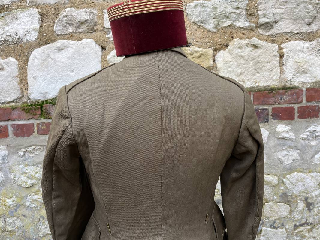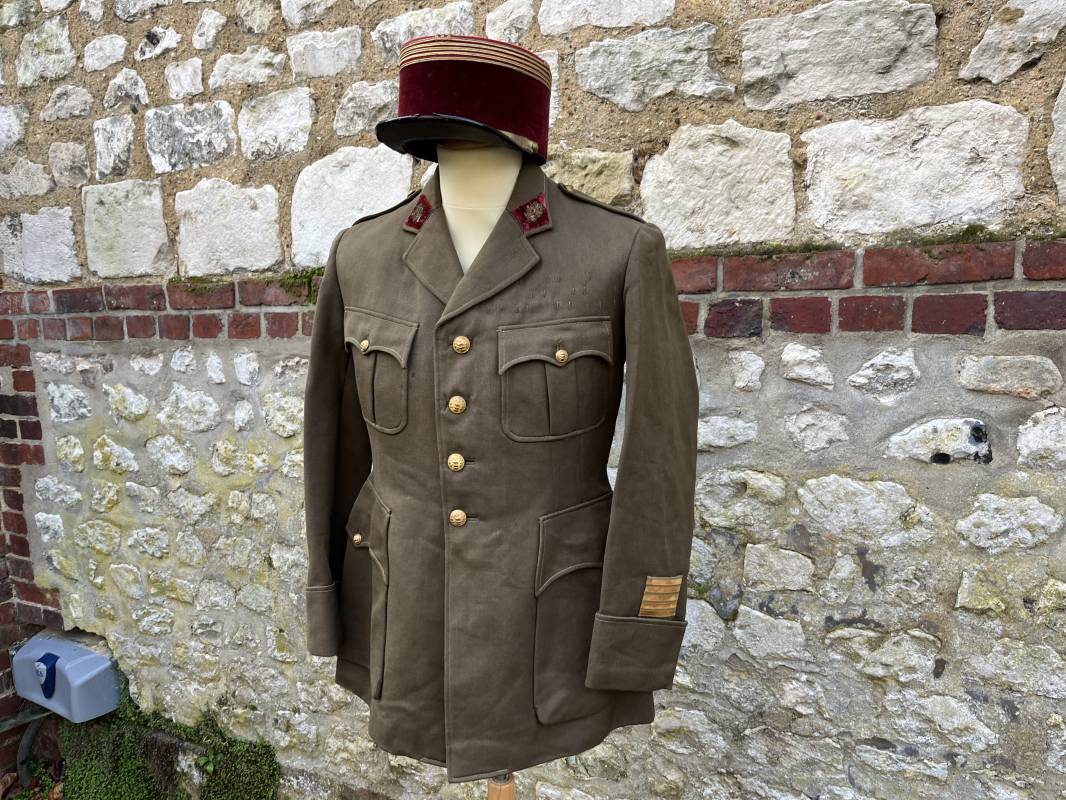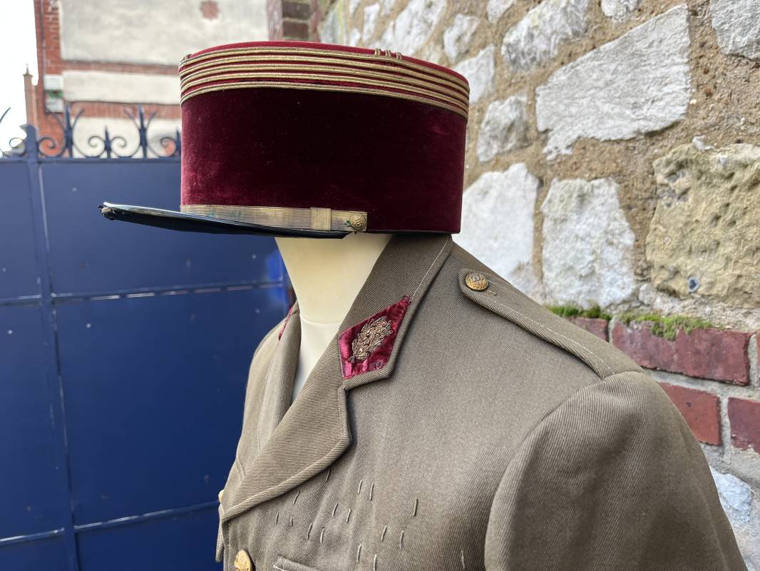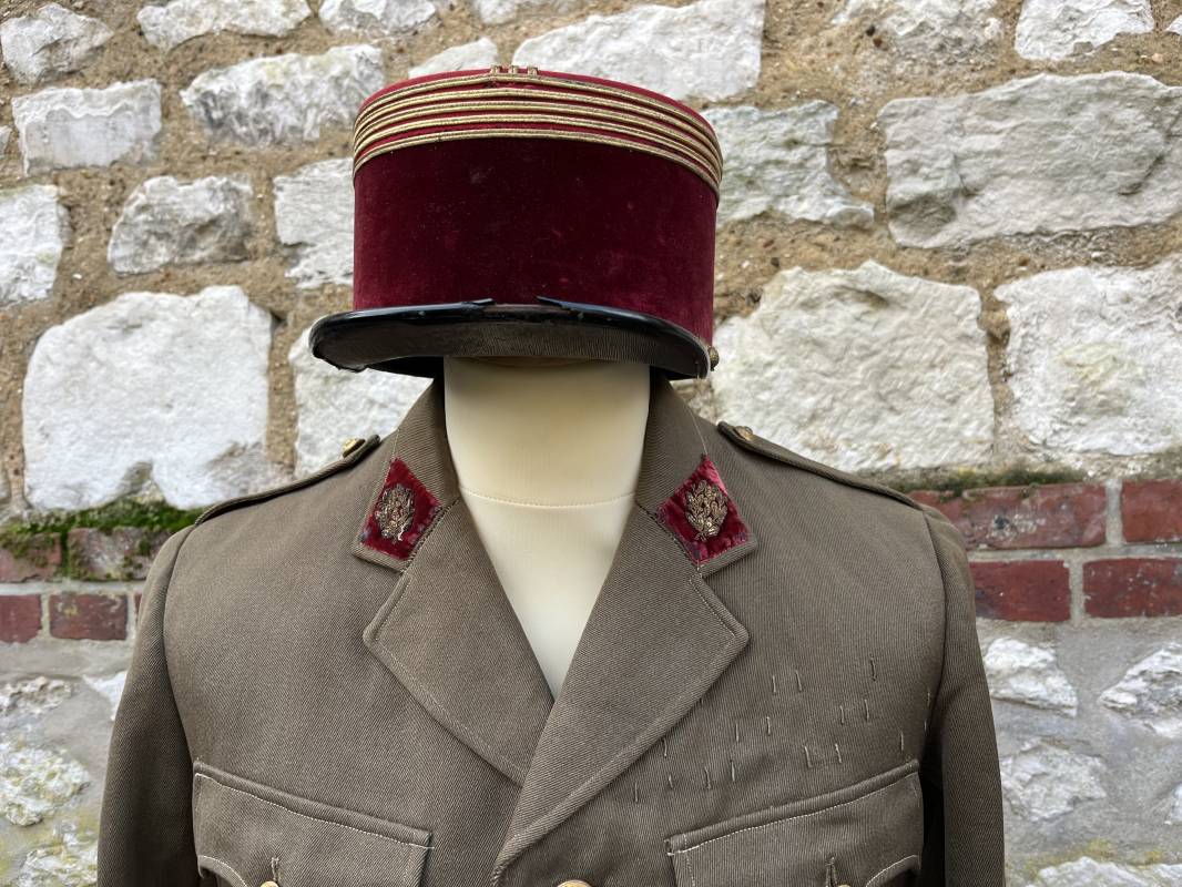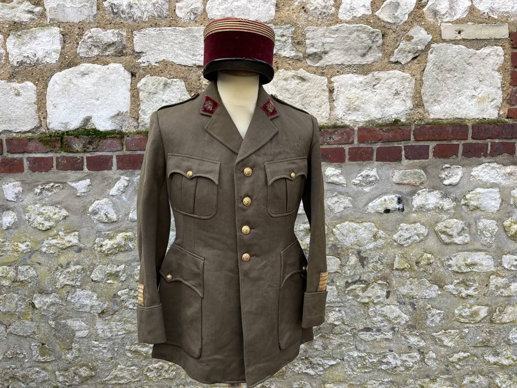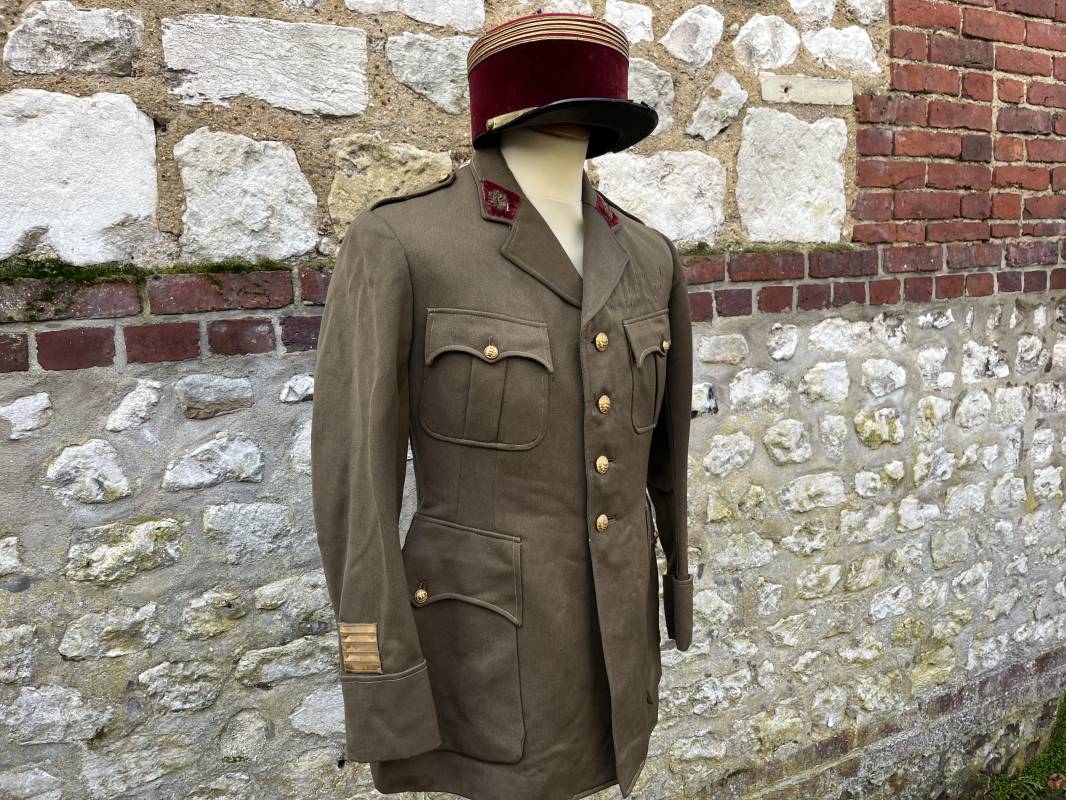 Veste et kepi d un officier au grade de colonel médecin . Veste modéle 1939 en gabardine kaki . Col ouvert , boutons dorés a caducé , quatre poches a rabats boutonnés , deux crochets métalliques de ceinturon . Pattes épaules en gabardine Pattes de col a fond velours cramoisi et caducé brodé cannetille dorée . Grades de manches de colonel .Nombreuses brides de decorations sur le haut de la poitrine gauche . Interieur doublé en satinette kaki , deux poches interieures Etiquette tailleur militaire a Paris . Nominette illisible . Largeur epaules 41 cm , longueur 78 cm , manches 61 cm . Beau képi modéle 1931 d un officier colonel médecin . Bandeau de velours cramoisi , galons dorés , fausse jugulaire et petits boutons dorés du service de santé .. Hauteur kepi 103 mm . Visière en cuir noir , petit jonc sur le pourtour . Intérieur doublé en satinette noire , bandeau de coiffe intérieur en cuir noir taille 58 . . Bel ensemble porté en bel état 1939/40 Ref 21644