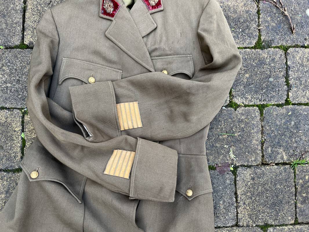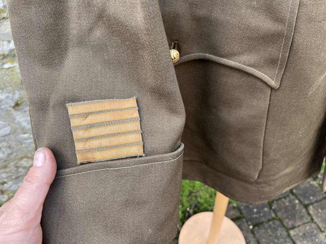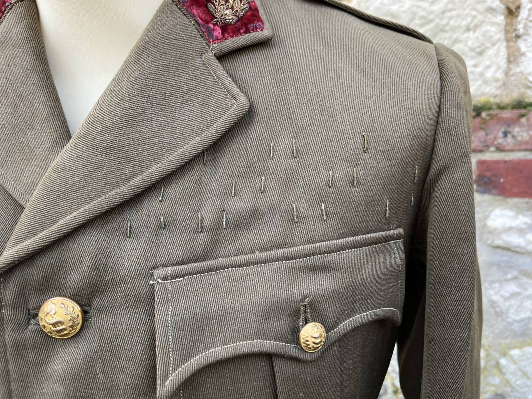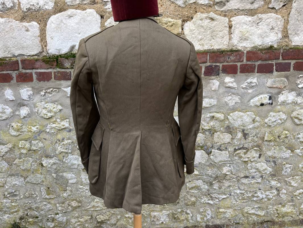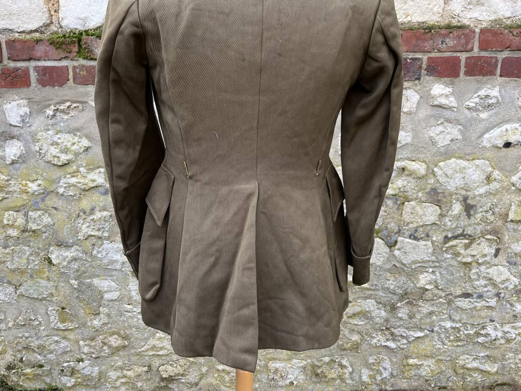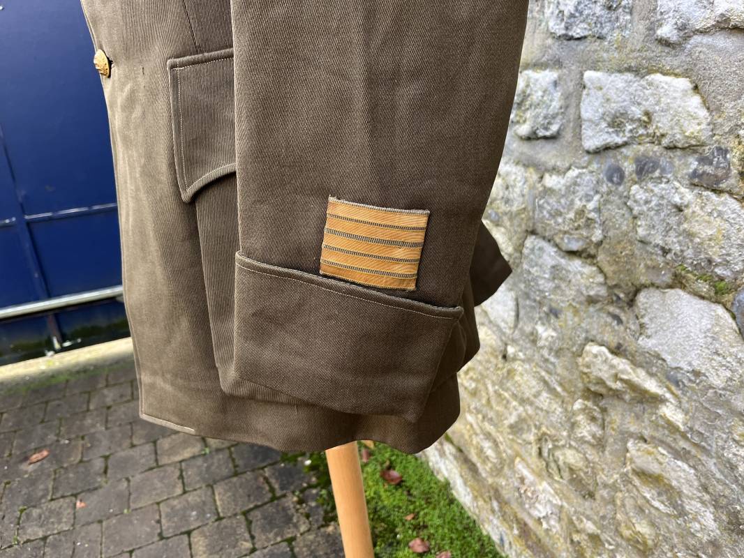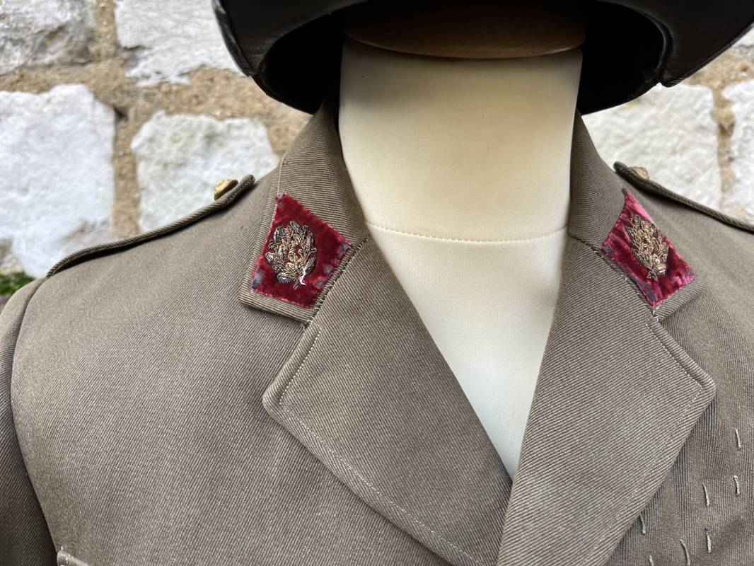 Veste et kepi d un officier au grade de colonel médecin . Veste modéle 1939 en gabardine kaki . Col ouvert , boutons dorés a caducé , quatre poches a rabats boutonnés , deux crochets métalliques de ceinturon . Pattes épaules en gabardine Pattes de col a fond velours cramoisi et caducé brodé cannetille dorée . Grades de manches de colonel .Nombreuses brides de decorations sur le haut de la poitrine gauche . Interieur doublé en satinette kaki , deux poches interieures Etiquette tailleur militaire a Paris . Nominette illisible . Largeur epaules 41 cm , longueur 78 cm , manches 61 cm . Beau képi modéle 1931 d un officier colonel médecin . Bandeau de velours cramoisi , galons dorés , fausse jugulaire et petits boutons dorés du service de santé .. Hauteur kepi 103 mm . Visière en cuir noir , petit jonc sur le pourtour . Intérieur doublé en satinette noire , bandeau de coiffe intérieur en cuir noir taille 58 . . Bel ensemble porté en bel état 1939/40 Ref 21644