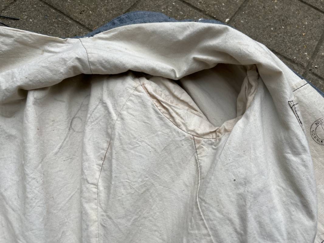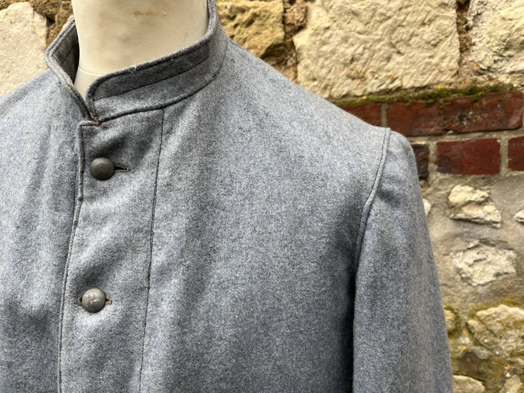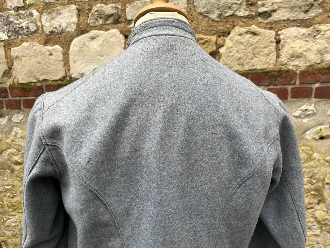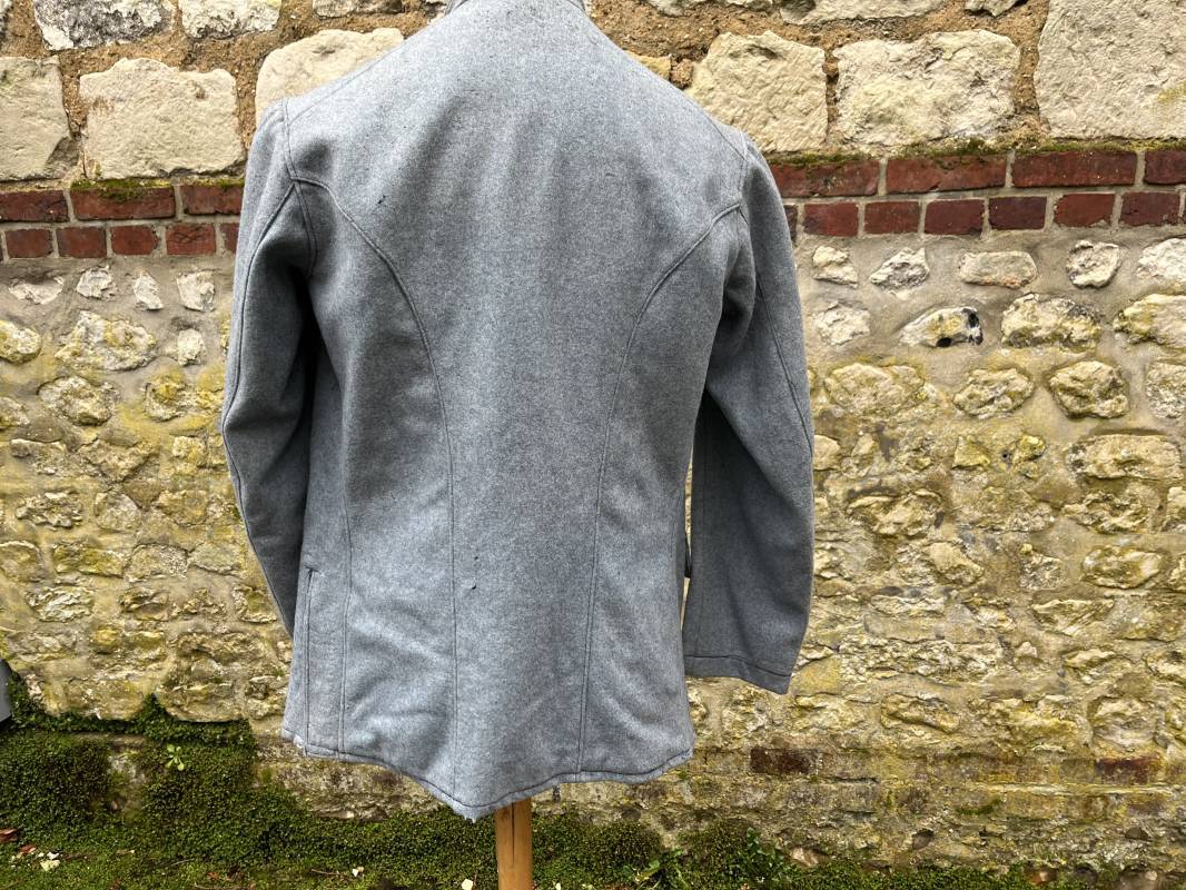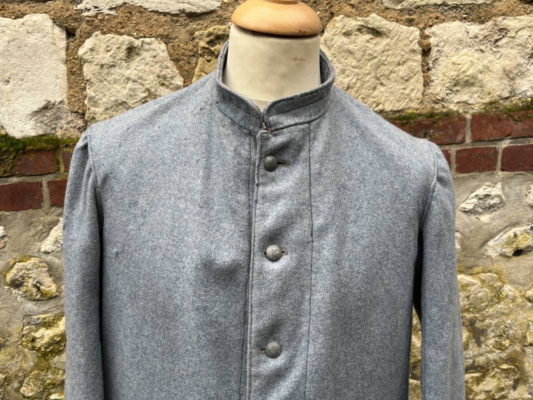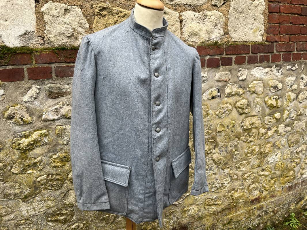 Rare veste troupe modèle 1914 en drap bleu clair typique des fabrications précoces ( 1915) . Veste réglementaire, col droit. Crochet métallique de fermeture au col . Fermeture frontale à cinq boutons métallique rond du modele toute arme . Deux poches basses plaquées en drap à rabat .Pas de patte de ceinturon , il ne semble y en avoir jamais eu de monter . Intèrieur doublé en toile de coton blanc. Tampon oval de réception daté 1915 . Veste légèrement portée en parfait état . Drap trés frais . . Largeur d'épaules 45cm. Longueur totale 78cm. Manches 63 cm Rare veste modele 1914 typique de l'année 1915/16 .Modéle peu courant qui sera rapidement remplacé par le modéle 1915 Ref 19643