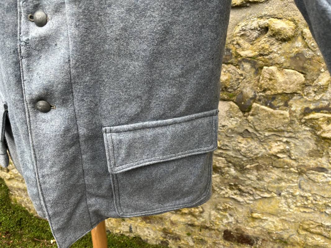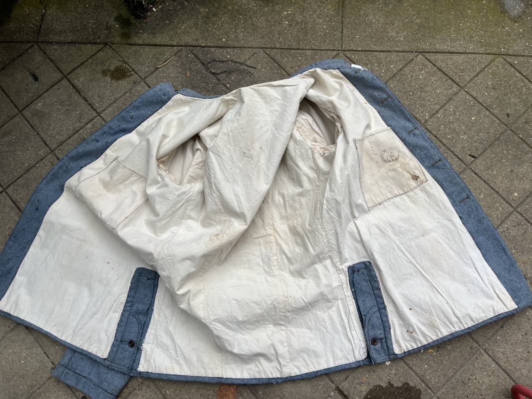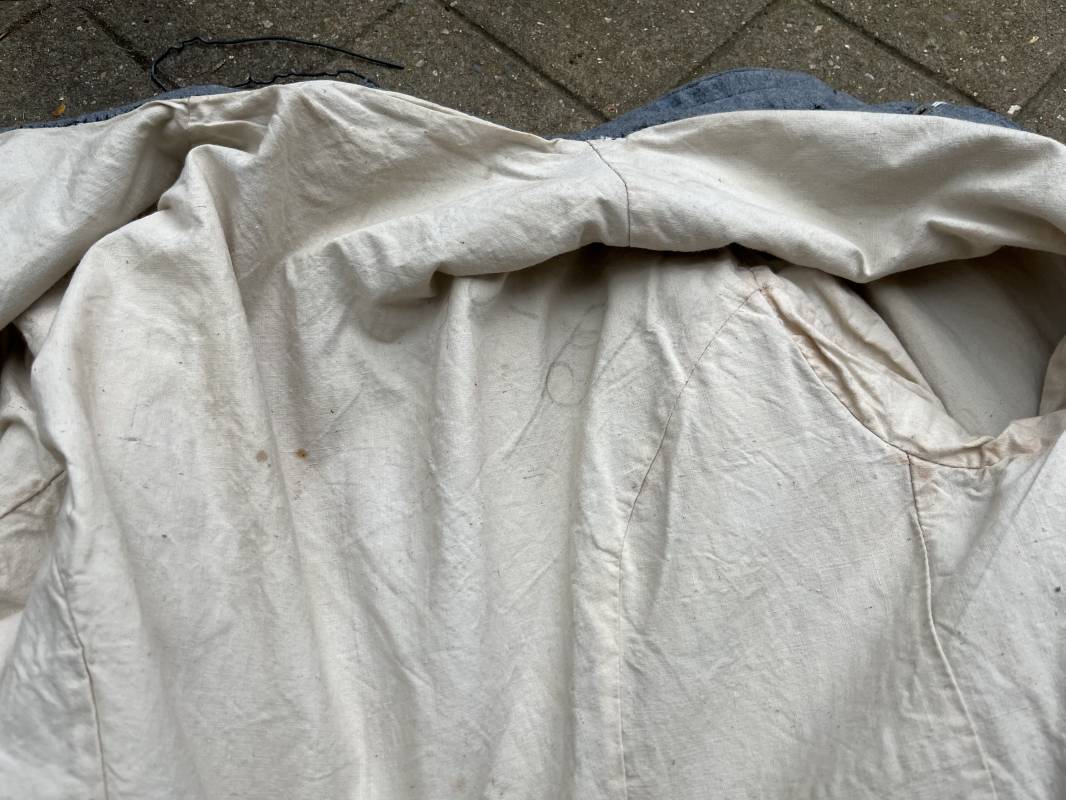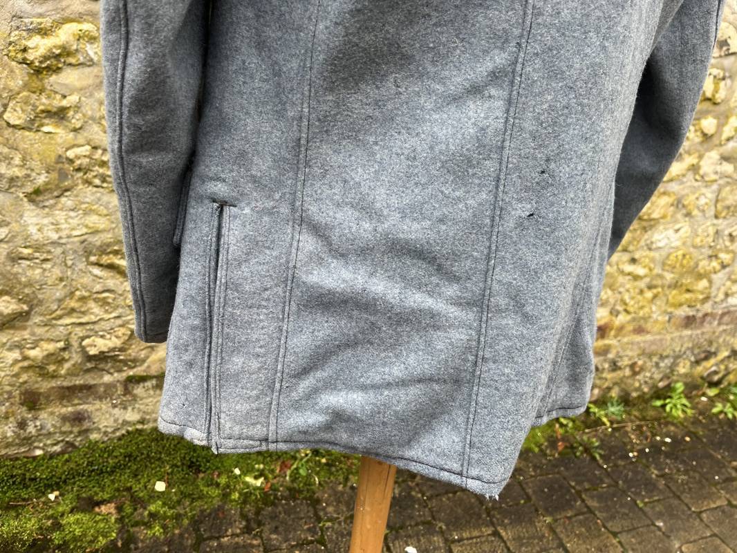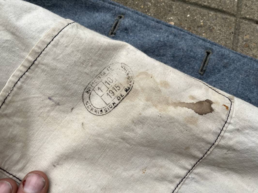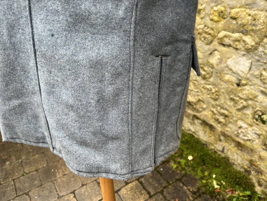 Rare veste troupe modèle 1914 en drap bleu clair typique des fabrications précoces ( 1915) . Veste réglementaire, col droit. Crochet métallique de fermeture au col . Fermeture frontale à cinq boutons métallique rond du modele toute arme . Deux poches basses plaquées en drap à rabat .Pas de patte de ceinturon , il ne semble y en avoir jamais eu de monter . Intèrieur doublé en toile de coton blanc. Tampon oval de réception daté 1915 . Veste légèrement portée en parfait état . Drap trés frais . . Largeur d'épaules 45cm. Longueur totale 78cm. Manches 63 cm Rare veste modele 1914 typique de l'année 1915/16 .Modéle peu courant qui sera rapidement remplacé par le modéle 1915 Ref 19643