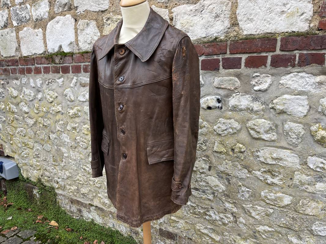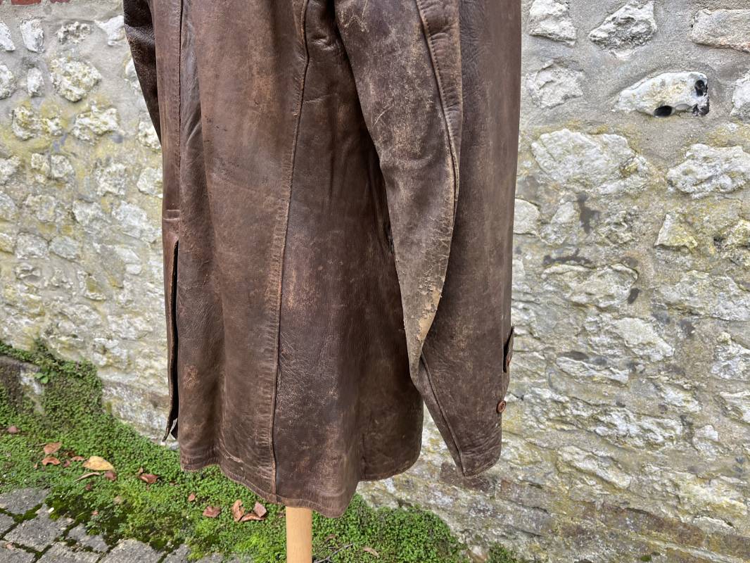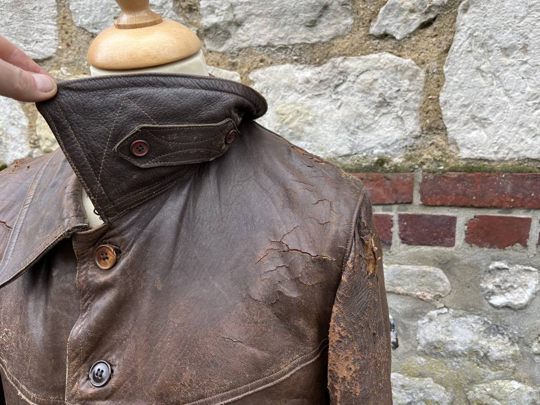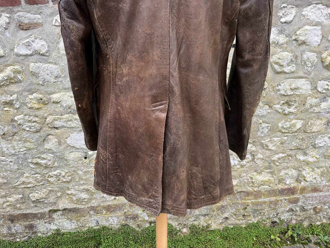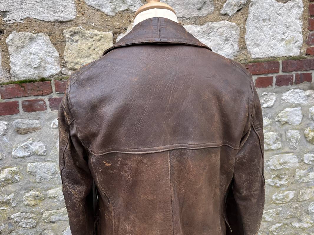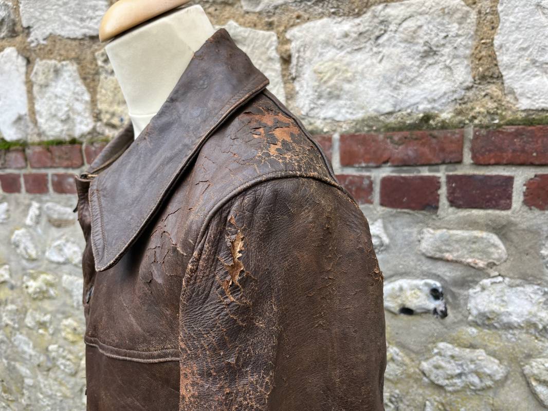 Rare veston modèle 1935 en cuir marron d'un tankiste . Col chevalière avec crochet métallique de fermeture , deux poches à rabats. Pattes de serrage en bouts de manches. Boutons en plastique marron cousus d'origine . . Intérieur doublé en laine grise , une poche intérieure , manches doublées en coton rayé . Tampon rond fabricant à l encre bleu illisible . Veston porté , cuir souple mais avec de nombreuses craquelures ( voir photos ) . Largeur épaules 45cm. Longueur 83 cm. Manches 62cm. Rare veston d'un tankiste français en Mai/Juin 1940. Trés belle patine 100 % nature et totalement intouché . Ref 21345
