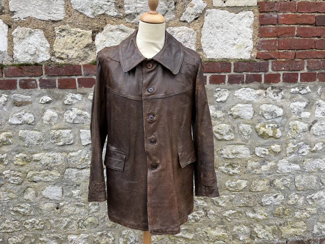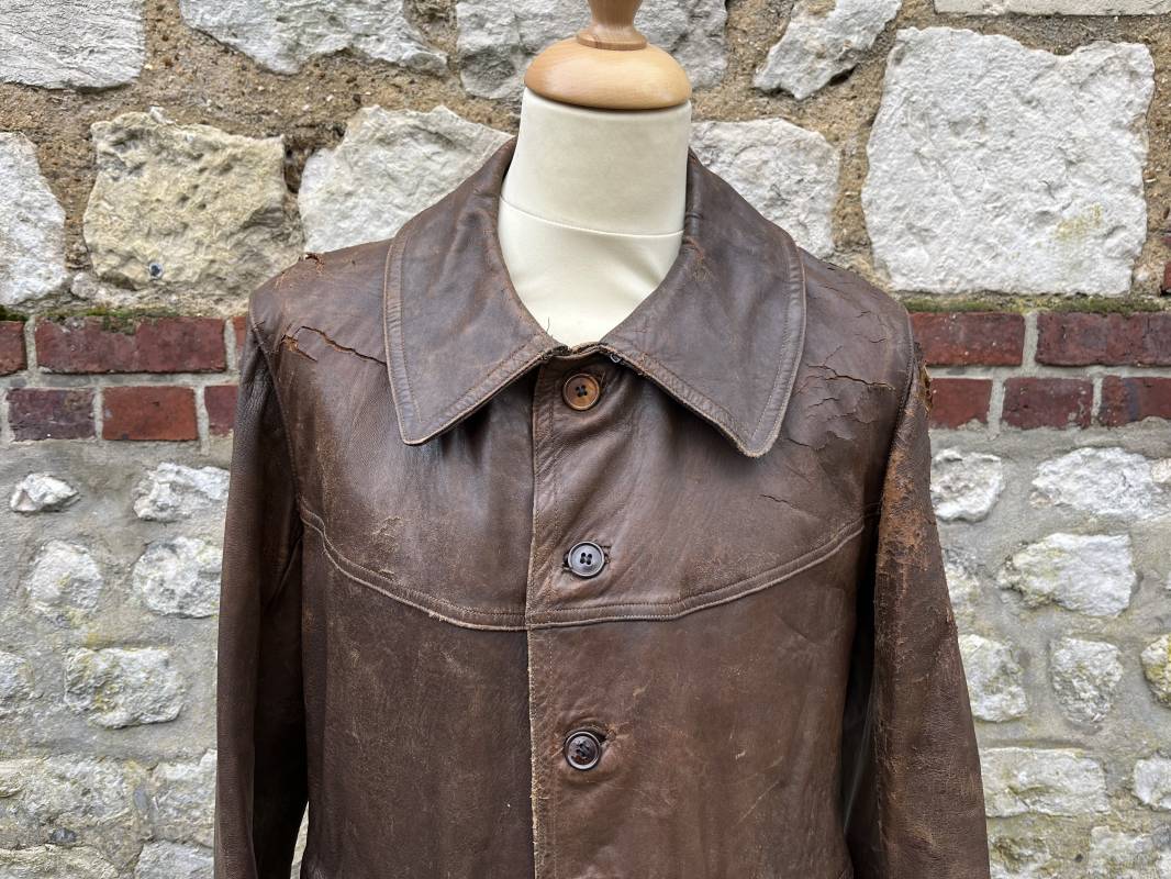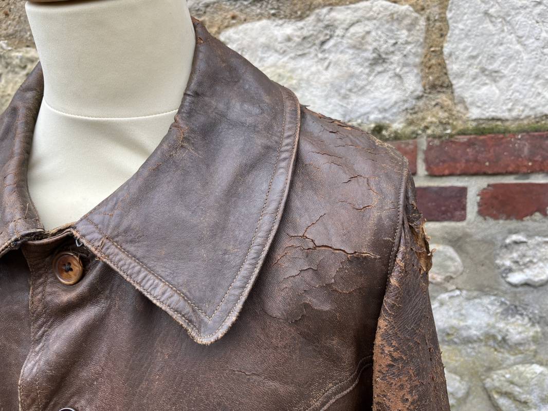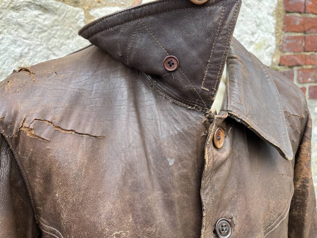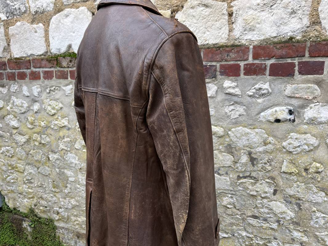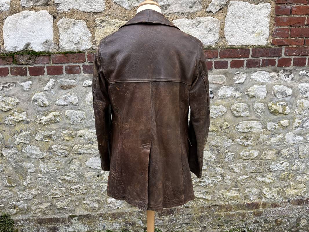 Rare veston modèle 1935 en cuir marron d'un tankiste . Col chevalière avec crochet métallique de fermeture , deux poches à rabats. Pattes de serrage en bouts de manches. Boutons en plastique marron cousus d'origine . . Intérieur doublé en laine grise , une poche intérieure , manches doublées en coton rayé . Tampon rond fabricant à l encre bleu illisible . Veston porté , cuir souple mais avec de nombreuses craquelures ( voir photos ) . Largeur épaules 45cm. Longueur 83 cm. Manches 62cm. Rare veston d'un tankiste français en Mai/Juin 1940. Trés belle patine 100 % nature et totalement intouché . Ref 21345