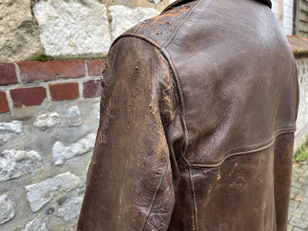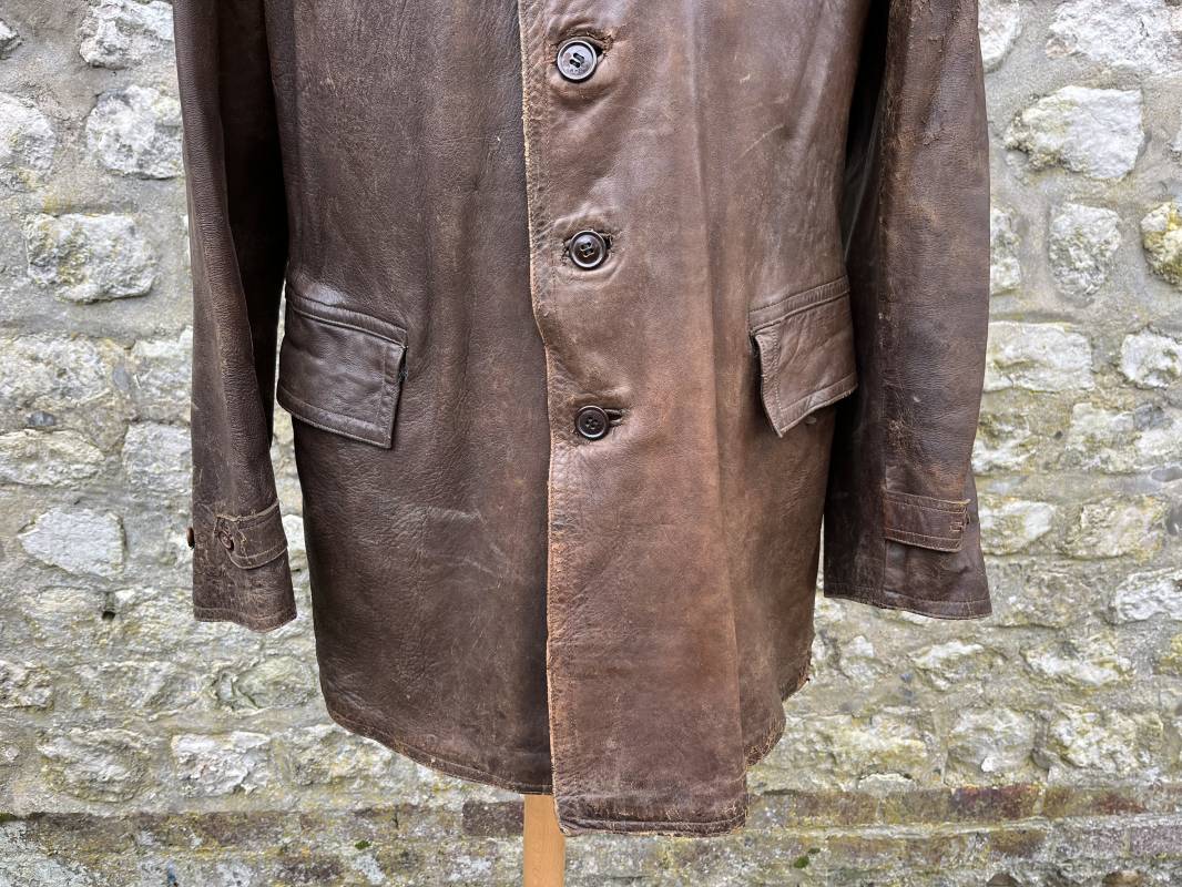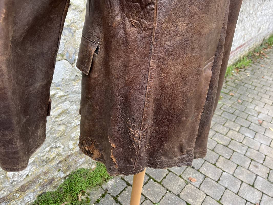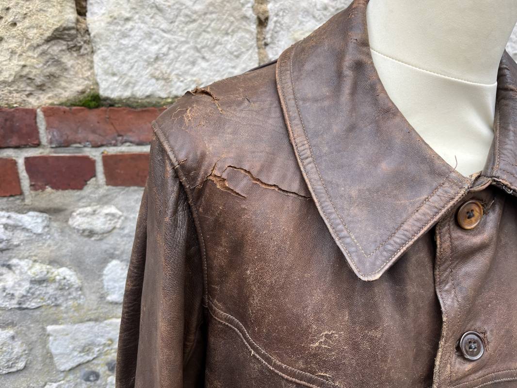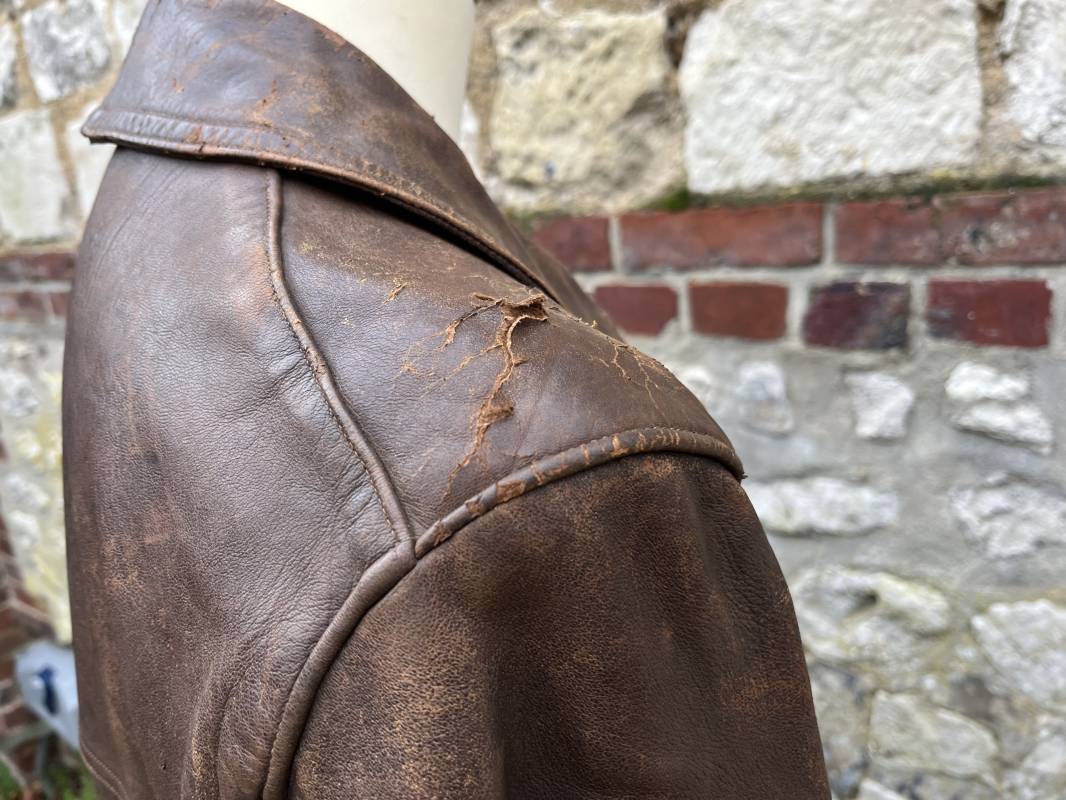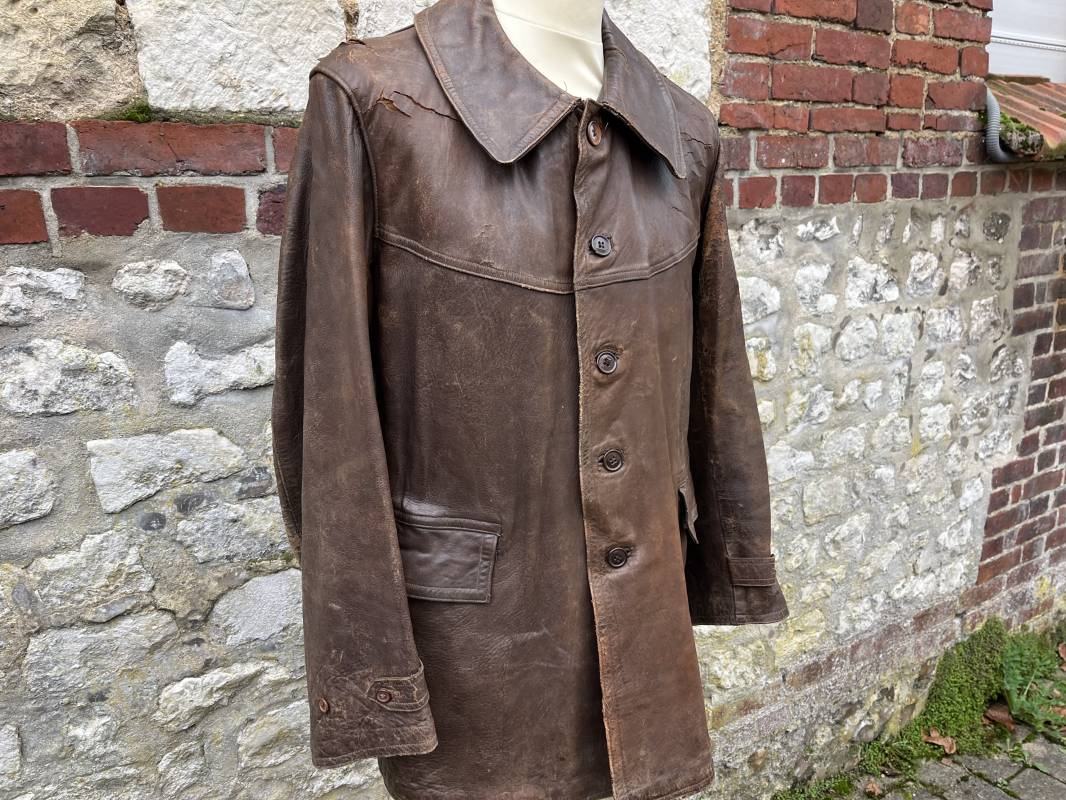 Rare veston modèle 1935 en cuir marron d'un tankiste . Col chevalière avec crochet métallique de fermeture , deux poches à rabats. Pattes de serrage en bouts de manches. Boutons en plastique marron cousus d'origine . . Intérieur doublé en laine grise , une poche intérieure , manches doublées en coton rayé . Tampon rond fabricant à l encre bleu illisible . Veston porté , cuir souple mais avec de nombreuses craquelures ( voir photos ) . Largeur épaules 45cm. Longueur 83 cm. Manches 62cm. Rare veston d'un tankiste français en Mai/Juin 1940. Trés belle patine 100 % nature et totalement intouché . Ref 21345