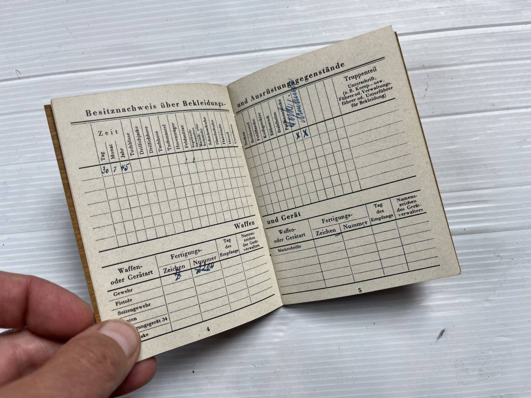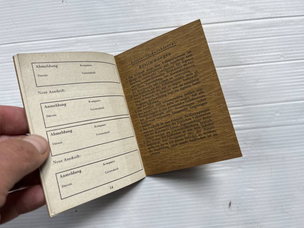 Rare livret militaire Soldbuch d'un combattant des Volksturm en 1945 . Rare livret individuel des combattants du peuple allemand des derniers mois du reich . Livret ouvert en fevrier 1945 Homme ne en 1905 . 40 ans en 1945 . Tampon encre Deutscher Volksturm Affectation a une unité de la Luftwaffe . . Livret en parfait état , complet avec toutes ses 14 pages et couverture cartonnée . Rare document Ref 21106