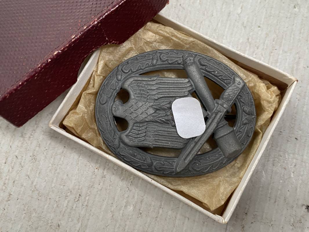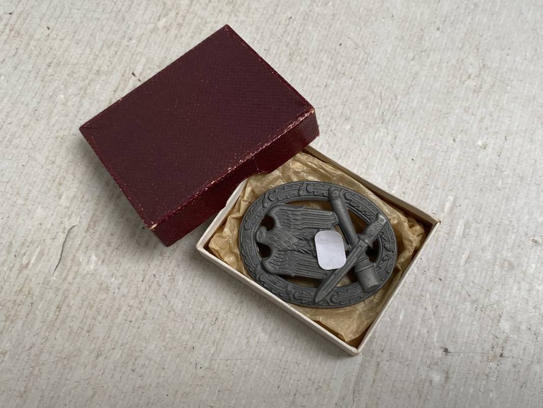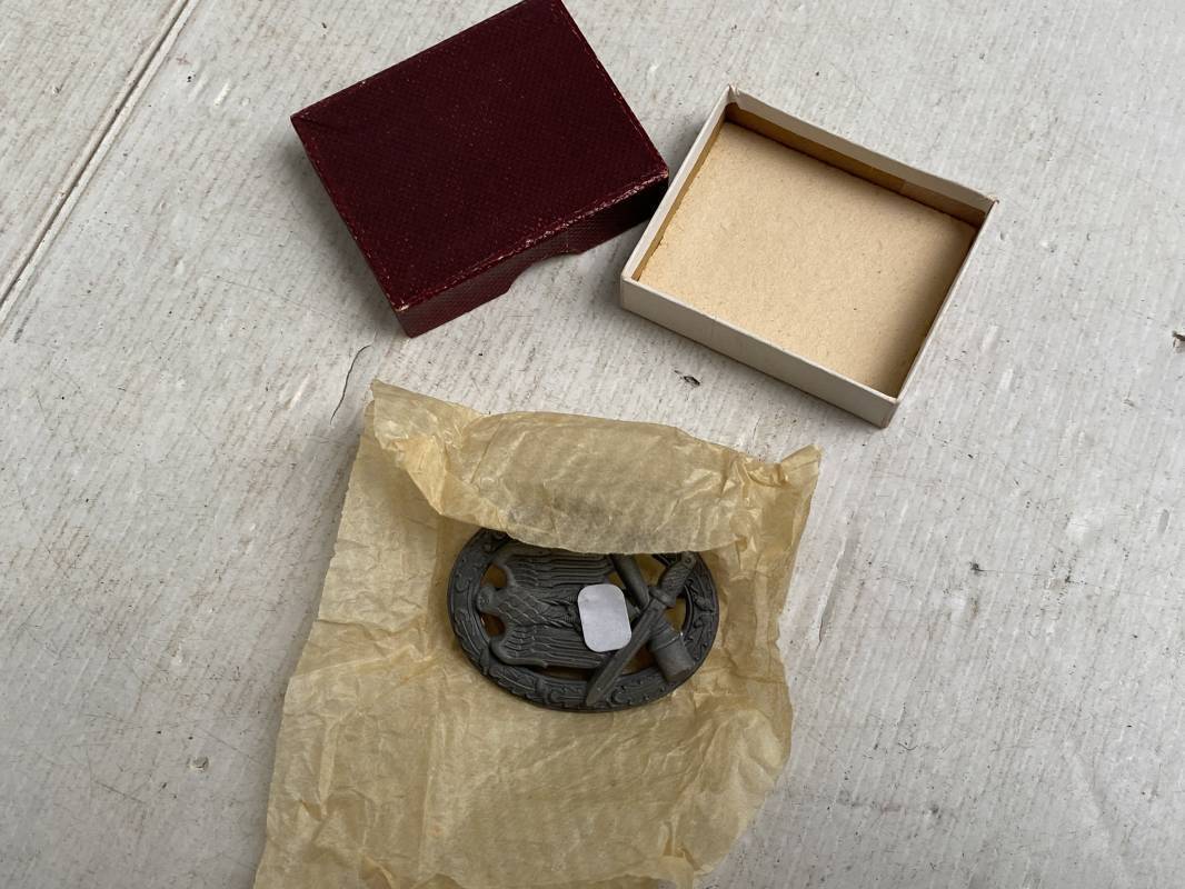 Très beau badge d'assaut général de la Wehrmacht. Très belle fabrication massive. Très beaux reliefs. Attache et crochet au dos. Marquage fabricant au dos GB 42 . Boitier en carton d'origine, papier soie d'origine. Trés bel ensemble en superbe état 1939/45 Ref 18936
