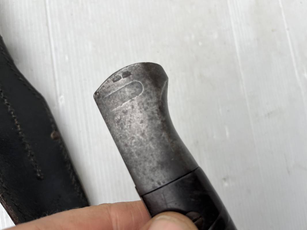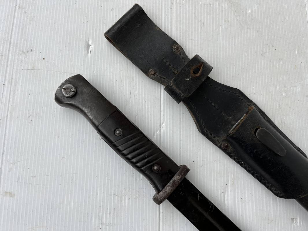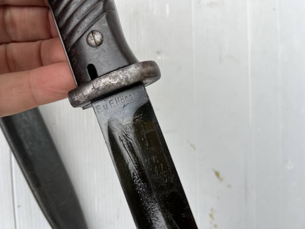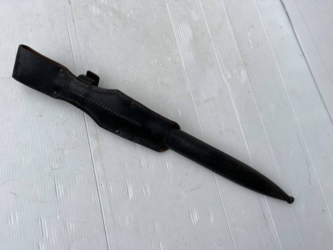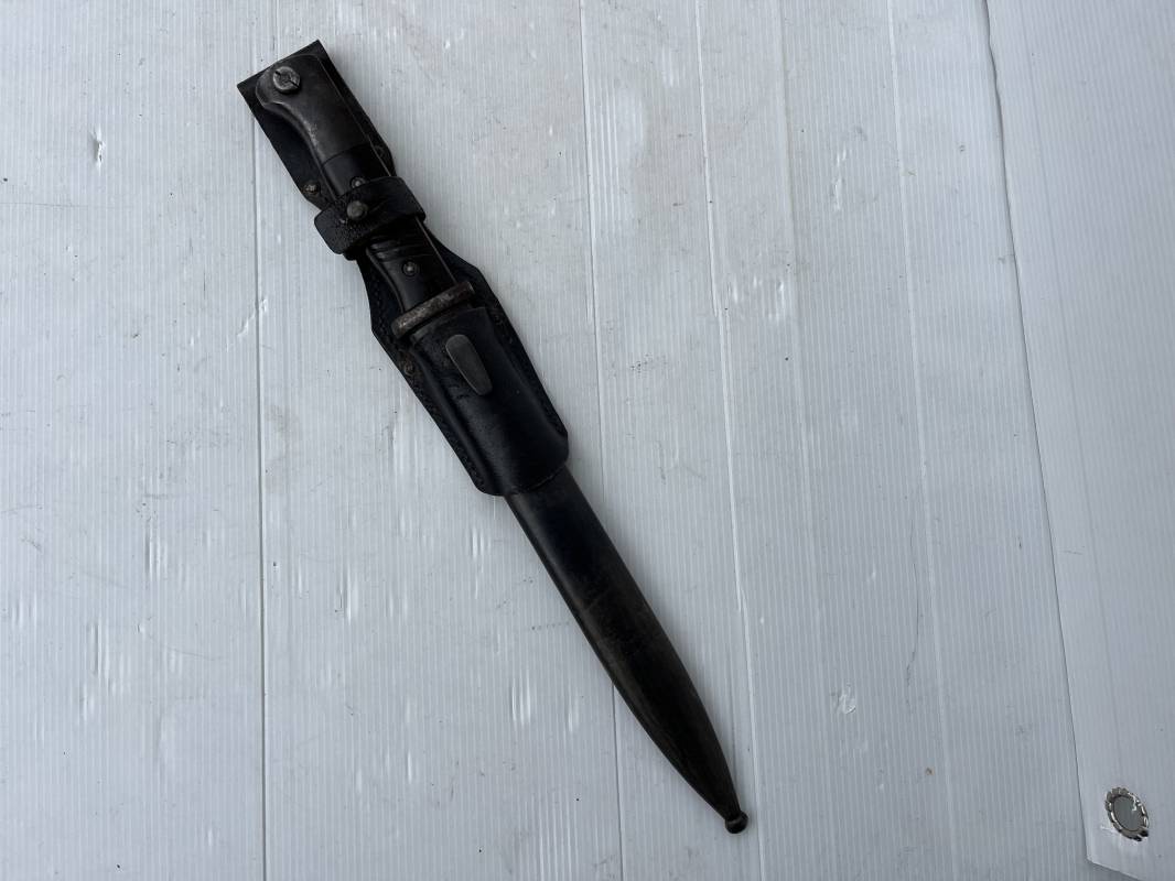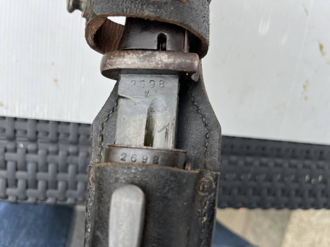 Trés belle Baionnette modèle 84/98 plaquettes bakélite marron foncé et son gousset en cuir noir . Baionnette aux mémes numéros . 2698 u sur fourreau et lame , marquage fabricant E.u.Fu Horster sur lame et fourreau et daté 39 sur tranche de la lame . Bouton poussoir sur pommeau.Aigle WaA sur bouterolle et pommeau . Belle lame bronzée d'origine Fourreau métallique bronzé. Pontet métallique de fixation du gousset. Gousset en cuir retourné noir avec rivets fer . Bel ensemble porté en bel état 100 % nature et intouché . Ref 17162