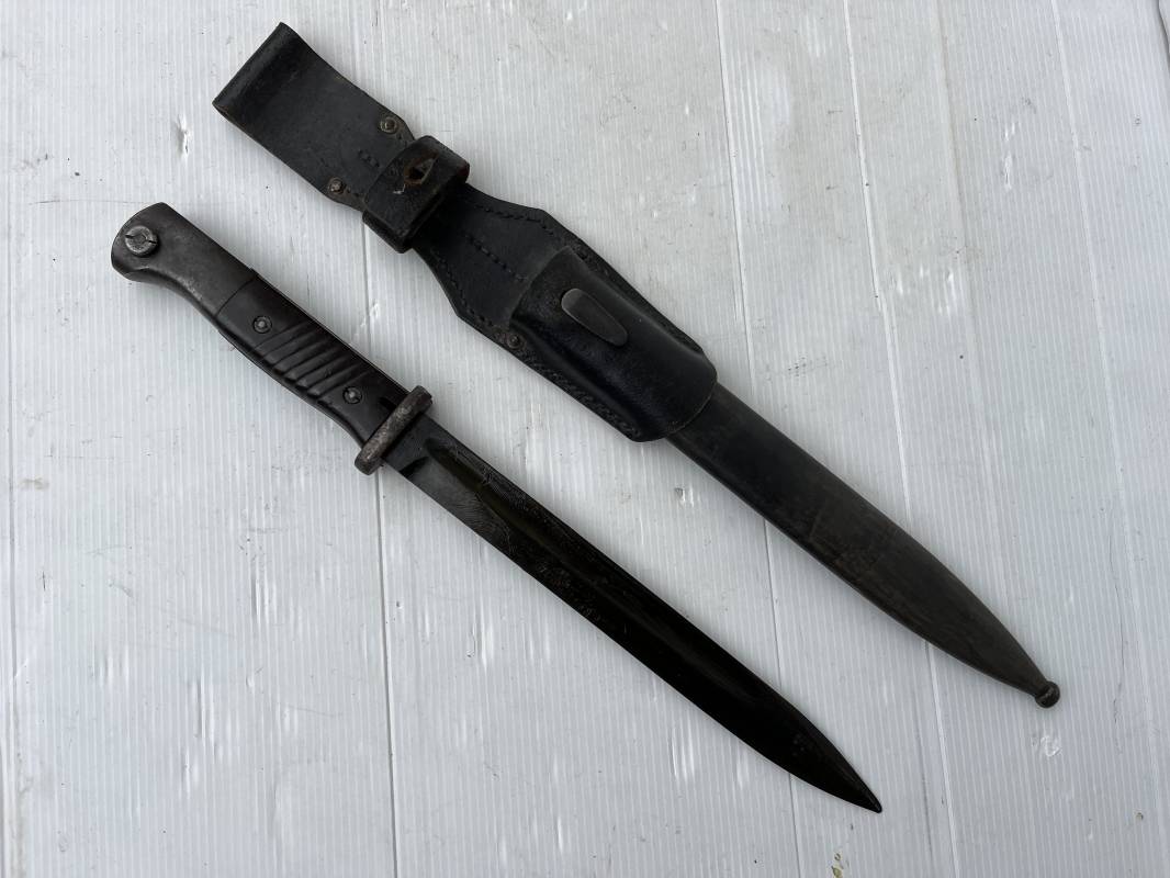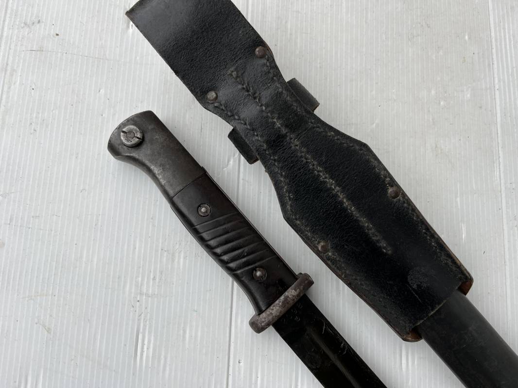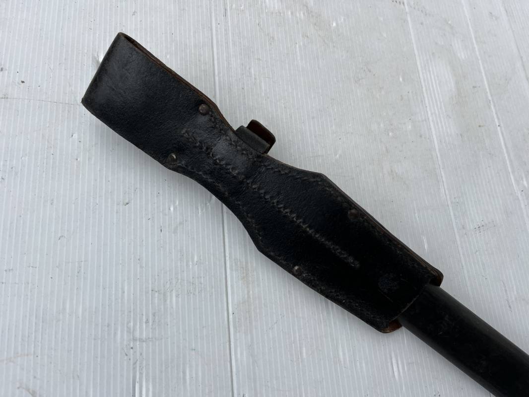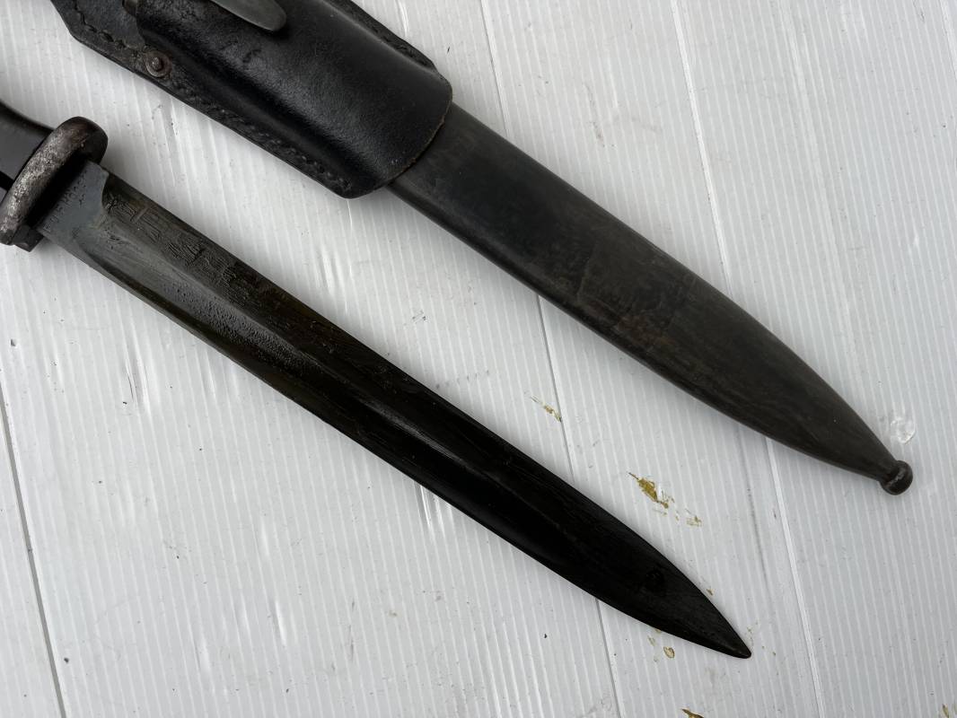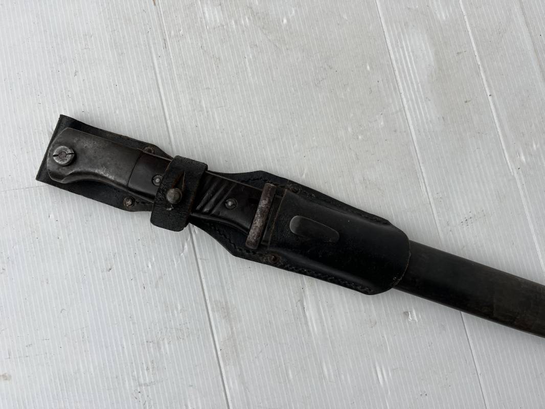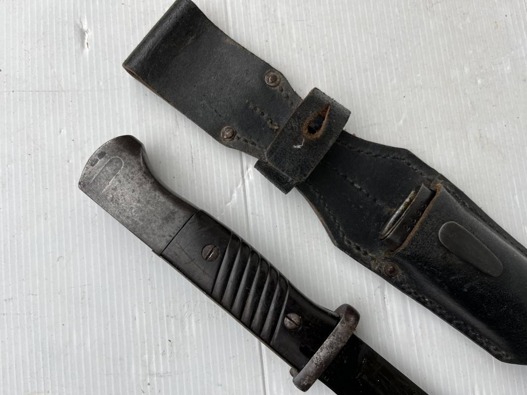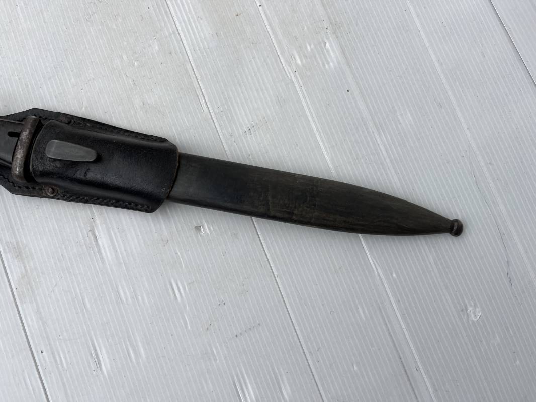 Trés belle Baionnette modèle 84/98 plaquettes bakélite marron foncé et son gousset en cuir noir . Baionnette aux mémes numéros . 2698 u sur fourreau et lame , marquage fabricant E.u.Fu Horster sur lame et fourreau et daté 39 sur tranche de la lame . Bouton poussoir sur pommeau.Aigle WaA sur bouterolle et pommeau . Belle lame bronzée d'origine Fourreau métallique bronzé. Pontet métallique de fixation du gousset. Gousset en cuir retourné noir avec rivets fer . Bel ensemble porté en bel état 100 % nature et intouché . Ref 17162