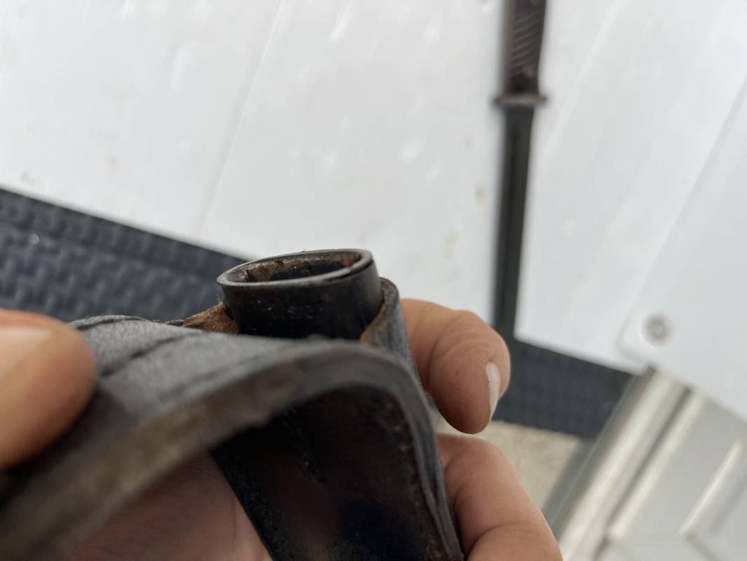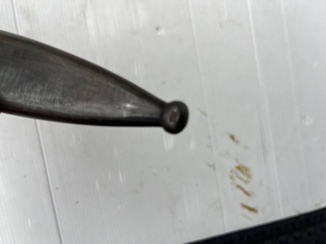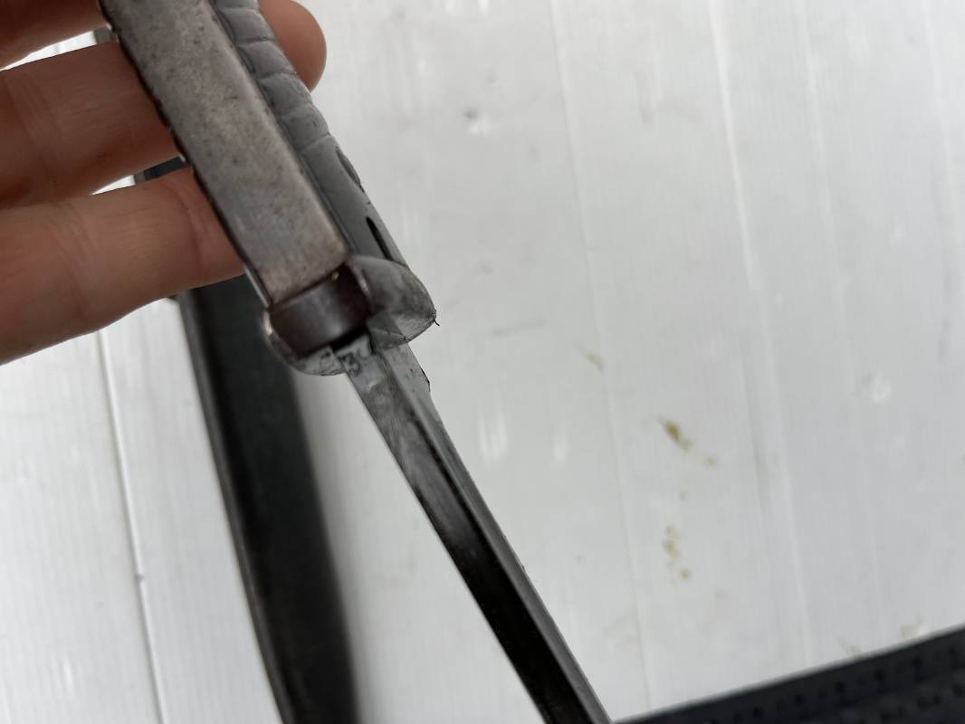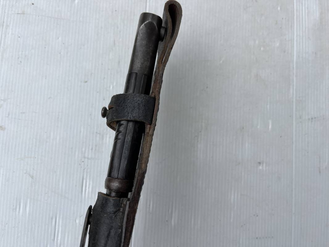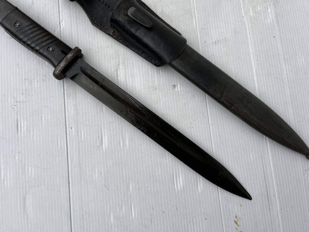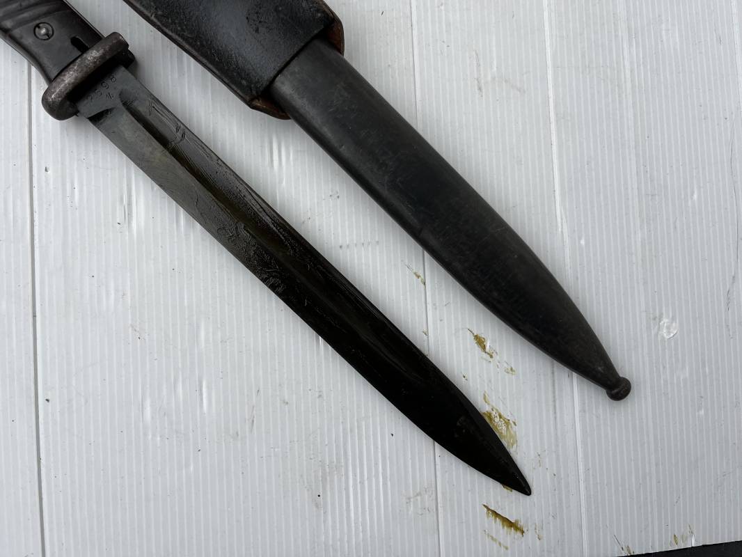 Trés belle Baionnette modèle 84/98 plaquettes bakélite marron foncé et son gousset en cuir noir . Baionnette aux mémes numéros . 2698 u sur fourreau et lame , marquage fabricant E.u.Fu Horster sur lame et fourreau et daté 39 sur tranche de la lame . Bouton poussoir sur pommeau.Aigle WaA sur bouterolle et pommeau . Belle lame bronzée d'origine Fourreau métallique bronzé. Pontet métallique de fixation du gousset. Gousset en cuir retourné noir avec rivets fer . Bel ensemble porté en bel état 100 % nature et intouché . Ref 17162
