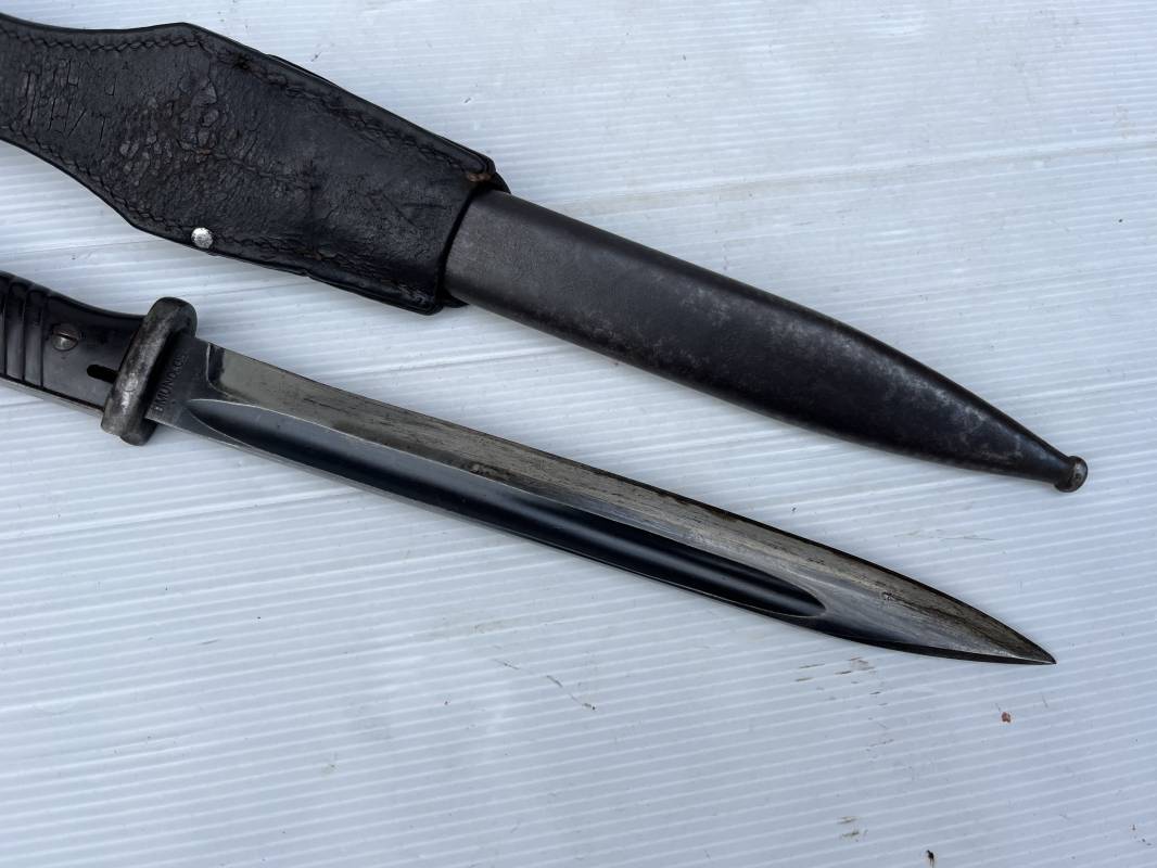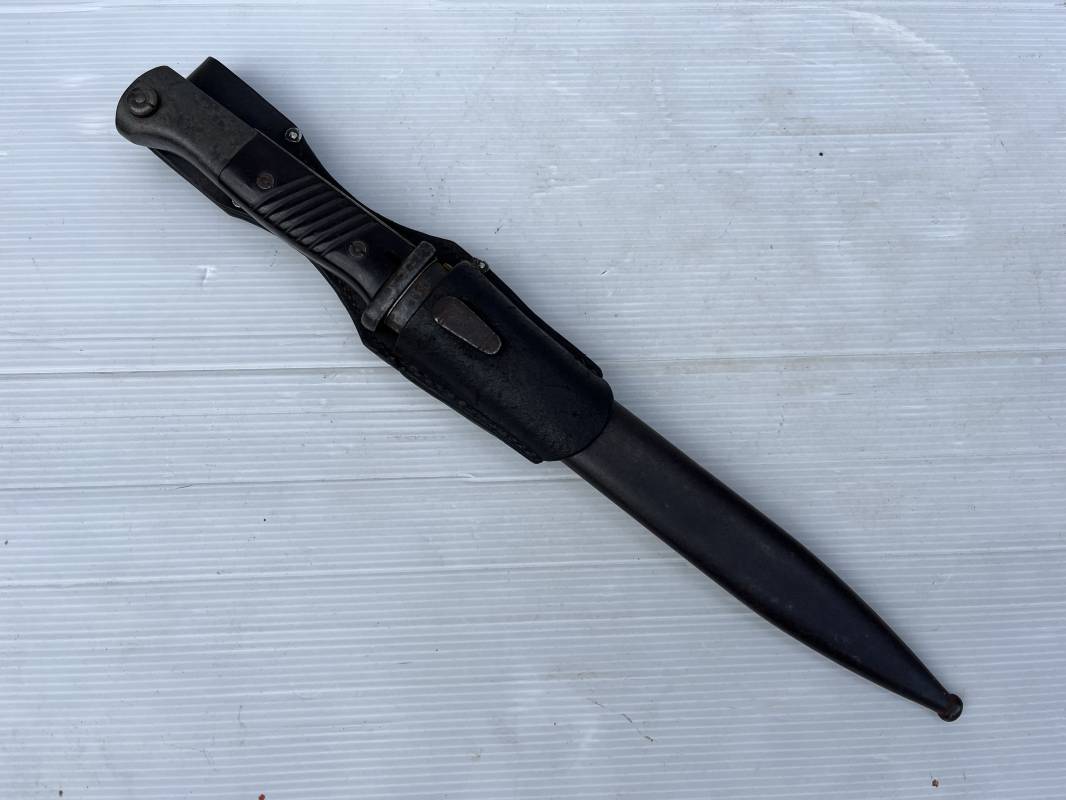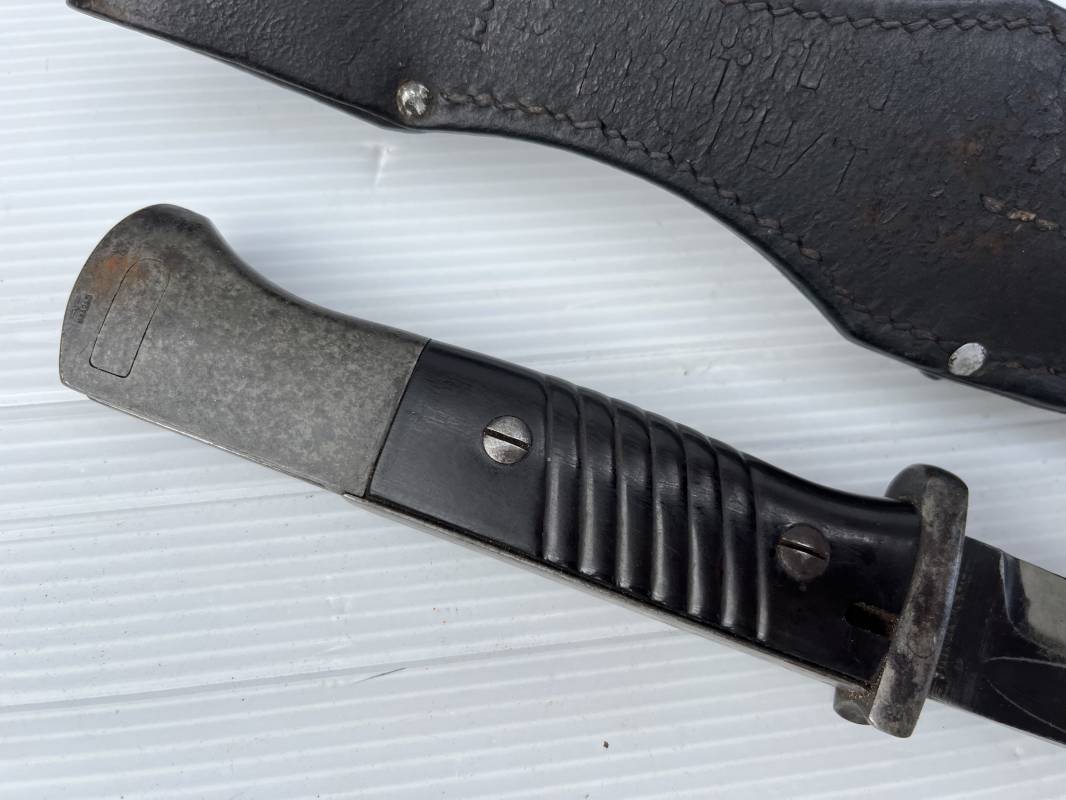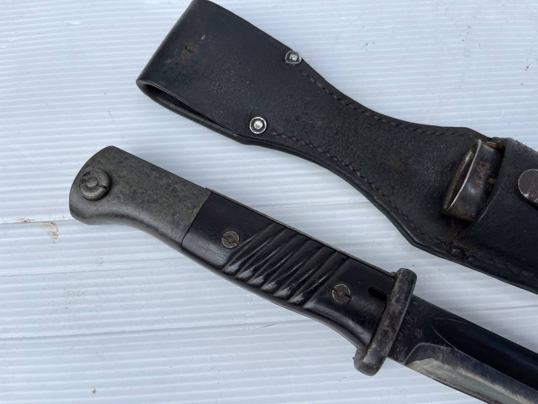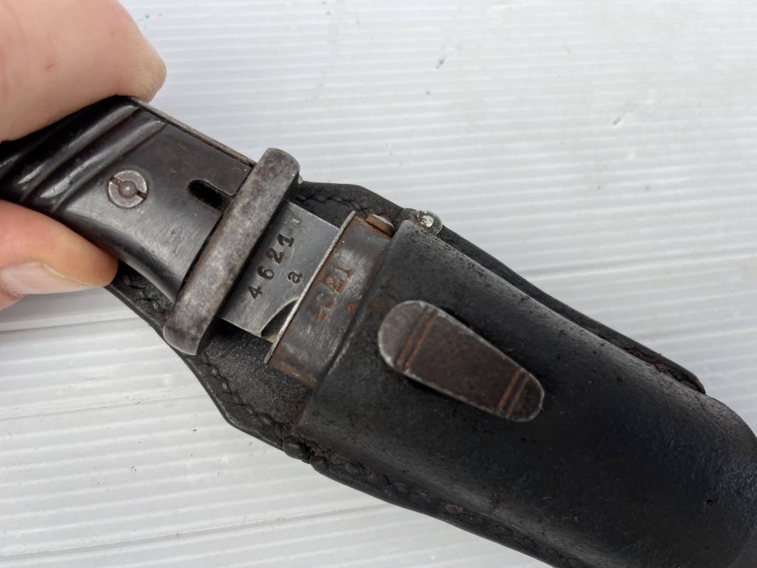 Trés belle Baionnette modèle 84/98 plaquettes bakélite marron foncé et son gousset en cuir noir retourné de la Luftwaffe affecté au Flak Reiment 9 . Bel ensemble trouvé telquel . Baionnette aux mémes numéros . 4621 a sur fourreau et lame , marquage fabricant Mundlos et daté 39 sur tranche de la lame . Bouton poussoir sur pommeau.Aigle WaA sur bouerolle et pommeau . Belle lame bronzée d'origine Fourreau métallique bronzé. Pontet métallique de fixation du gousset. Gousset en cuir retourné noir avec rivets alu Marquage fabricant et d affectation au I/Flak Rgt 9 réceptionné LBA daté 1939 . Bel ensemble porté en bel état 100 % nature et intouché . Ref 16828