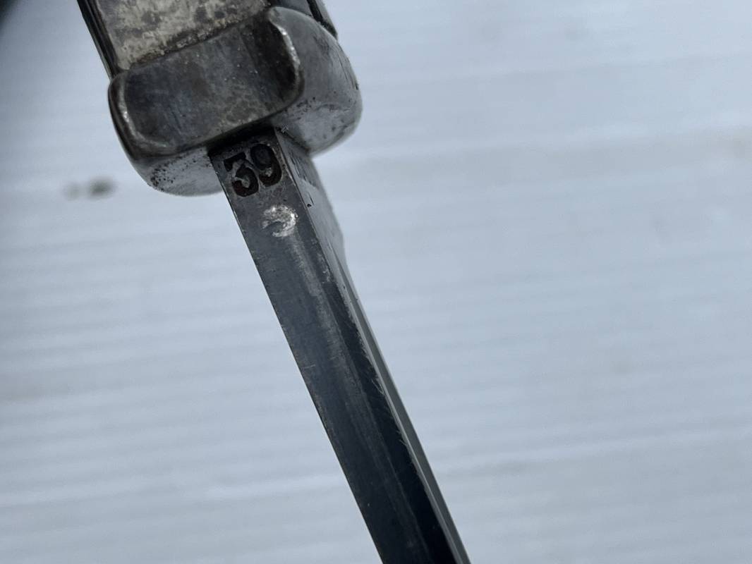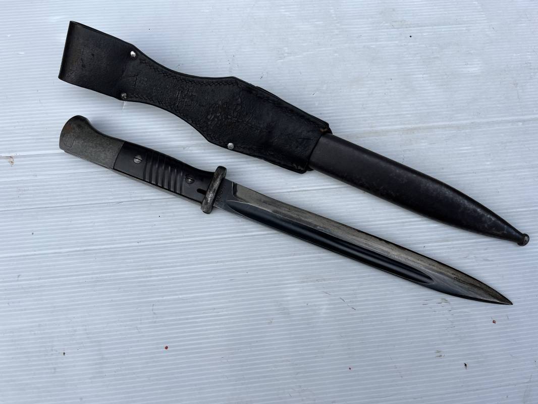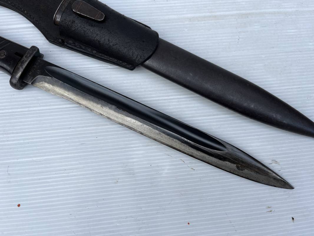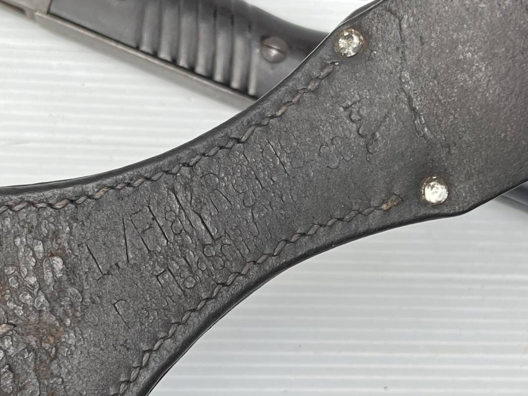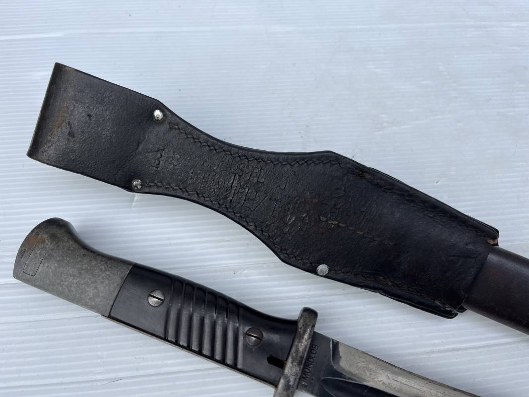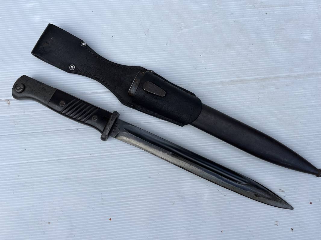 Trés belle Baionnette modèle 84/98 plaquettes bakélite marron foncé et son gousset en cuir noir retourné de la Luftwaffe affecté au Flak Reiment 9 . Bel ensemble trouvé telquel . Baionnette aux mémes numéros . 4621 a sur fourreau et lame , marquage fabricant Mundlos et daté 39 sur tranche de la lame . Bouton poussoir sur pommeau.Aigle WaA sur bouerolle et pommeau . Belle lame bronzée d'origine Fourreau métallique bronzé. Pontet métallique de fixation du gousset. Gousset en cuir retourné noir avec rivets alu Marquage fabricant et d affectation au I/Flak Rgt 9 réceptionné LBA daté 1939 . Bel ensemble porté en bel état 100 % nature et intouché . Ref 16828
