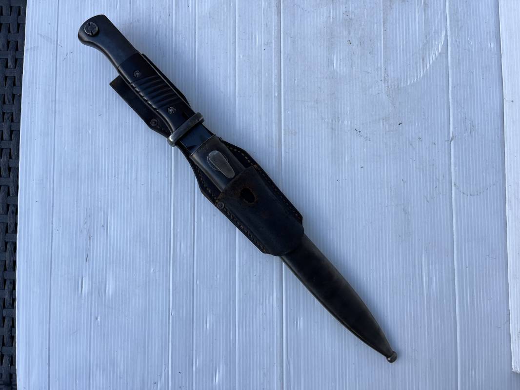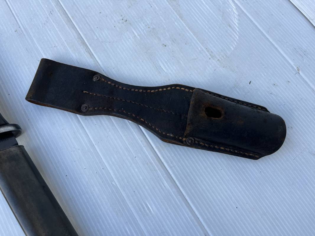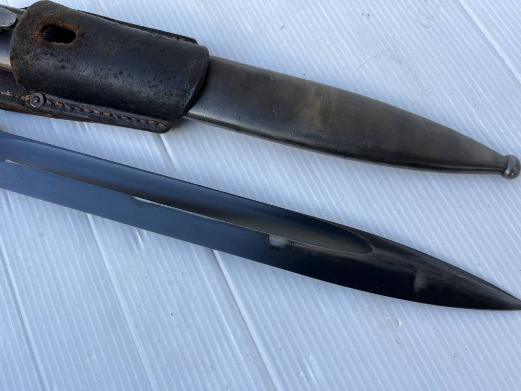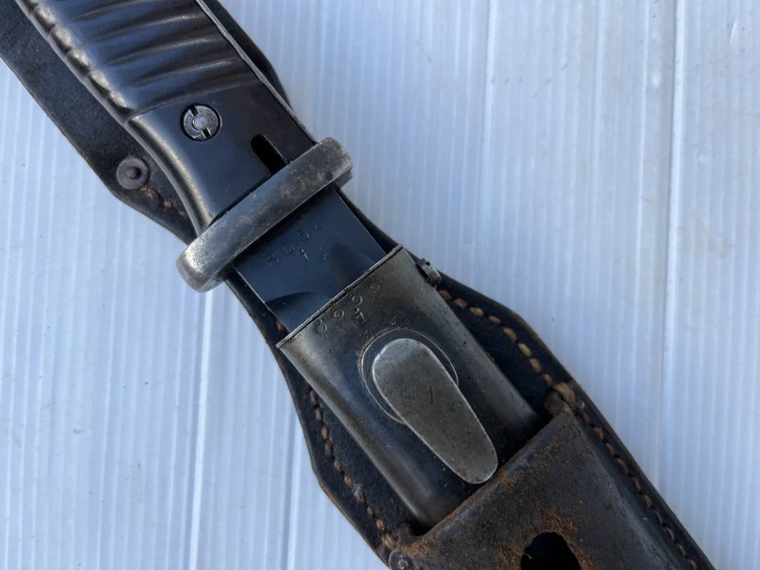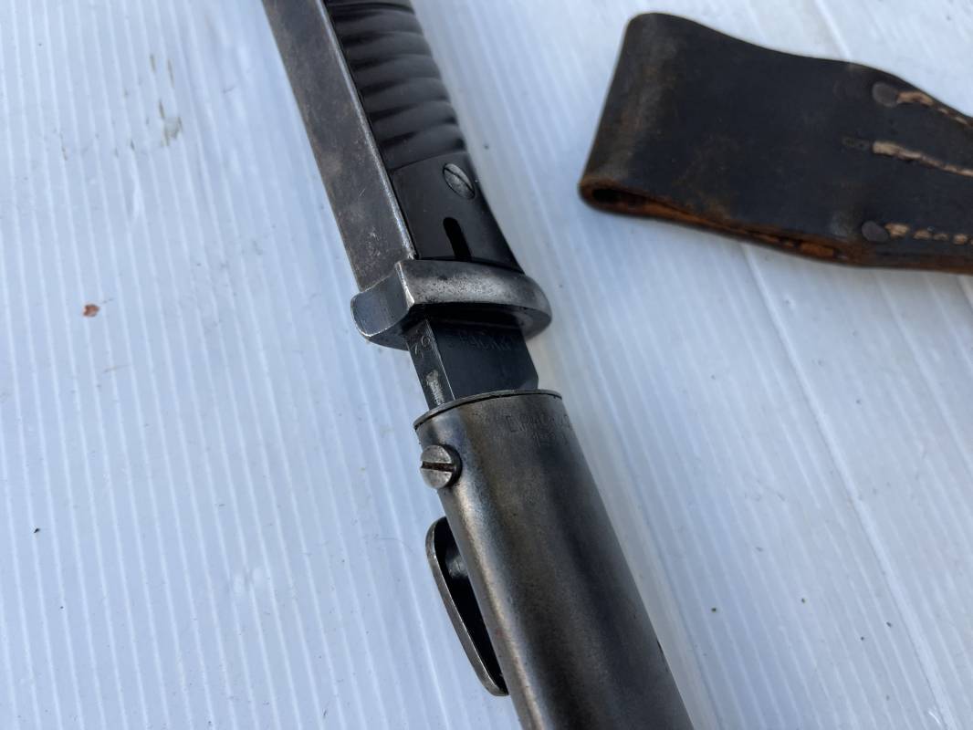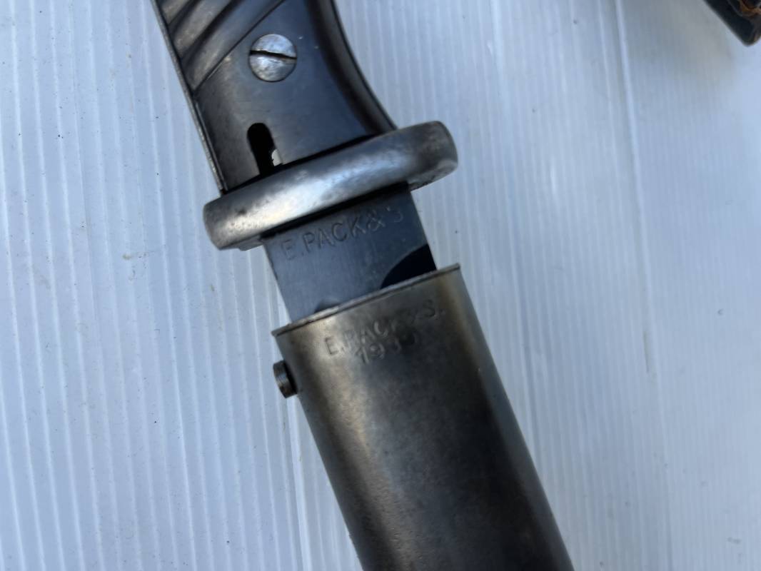 Trés belle Baionnette modèle 84/98 plaquettes bakélite marron foncé et son gousset en cuir noir retourné . Bel ensemble trouvé telquel . Baionnette aux mémes numéros . 8656 J sur fourreau et lame , marquage fabricant E.Pack & Sohn sur lame et fourreau et daté 39 sur tranche de la lame . Bouton poussoir sur pommeau.Aigle WaA sur bouterolle et pommeau . Belle lame bronzée d'origine Fourreau métallique bronzé. Pontet métallique de fixation du gousset. Gousset en cuir retourné noir avec rivets fer . Bel ensemble porté en bel état 100 % nature et intouché . Ref 21490
