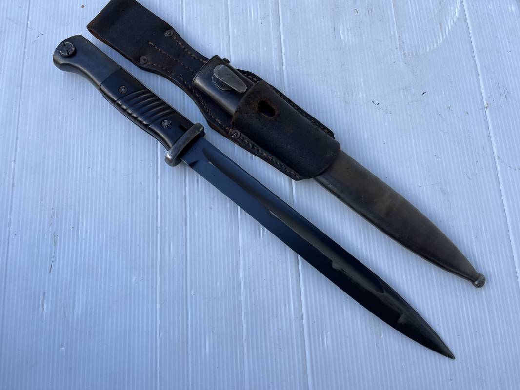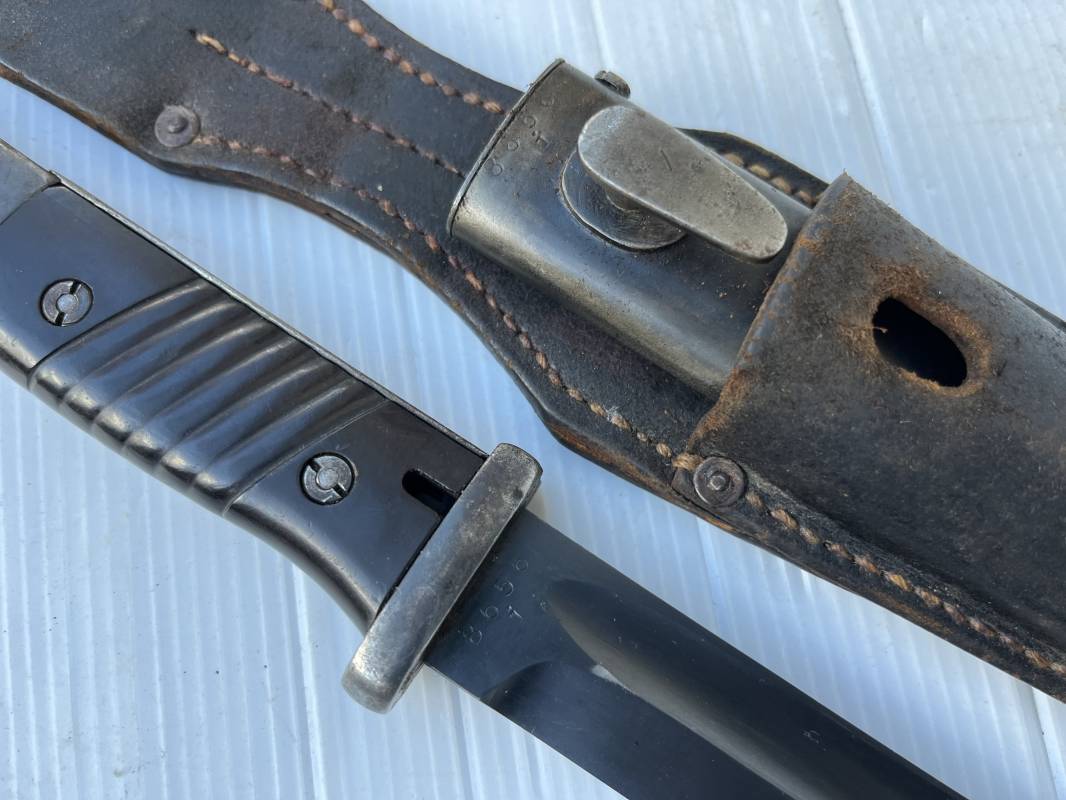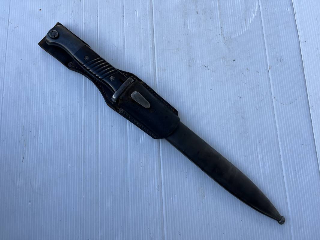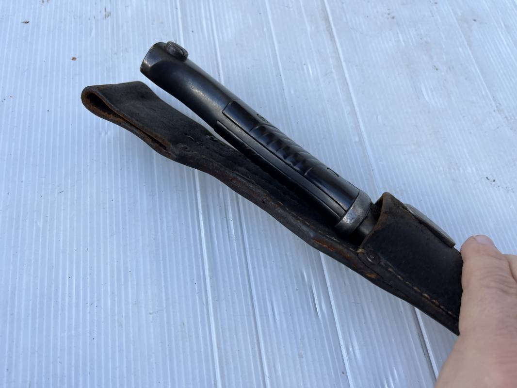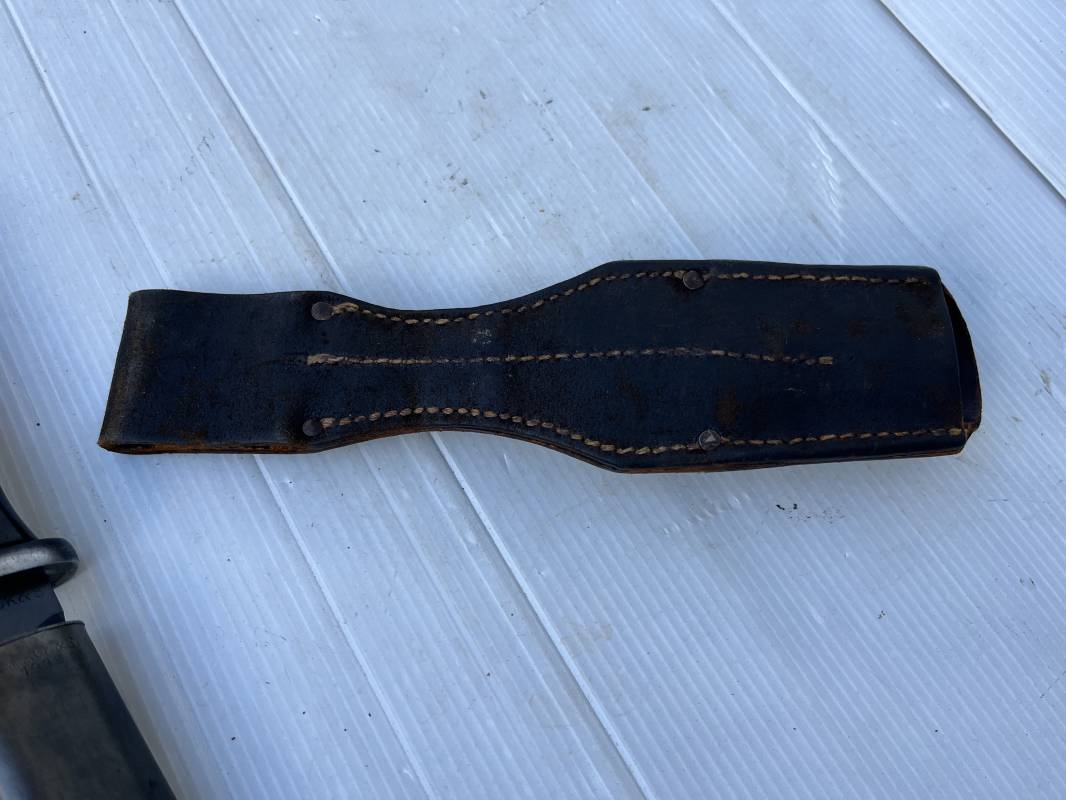 Trés belle Baionnette modèle 84/98 plaquettes bakélite marron foncé et son gousset en cuir noir retourné . Bel ensemble trouvé telquel . Baionnette aux mémes numéros . 8656 J sur fourreau et lame , marquage fabricant E.Pack & Sohn sur lame et fourreau et daté 39 sur tranche de la lame . Bouton poussoir sur pommeau.Aigle WaA sur bouterolle et pommeau . Belle lame bronzée d'origine Fourreau métallique bronzé. Pontet métallique de fixation du gousset. Gousset en cuir retourné noir avec rivets fer . Bel ensemble porté en bel état 100 % nature et intouché . Ref 21490