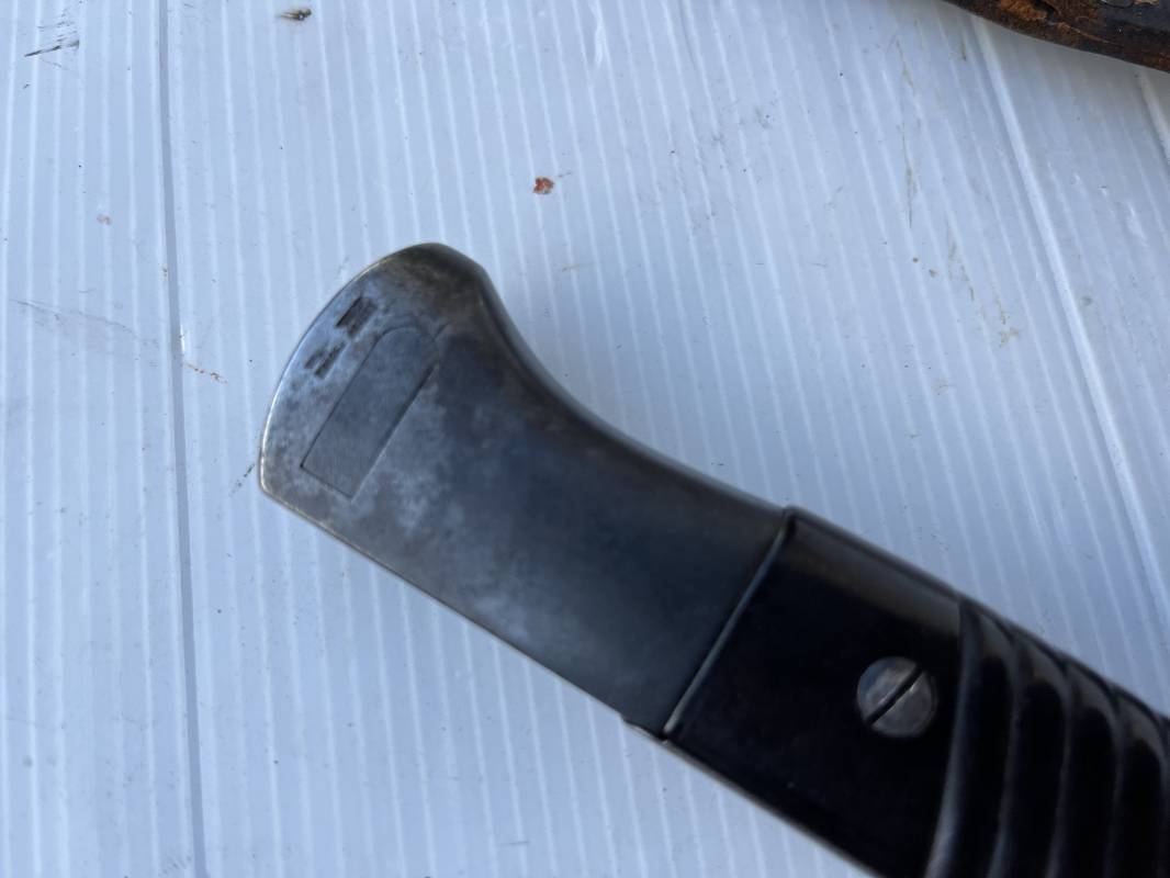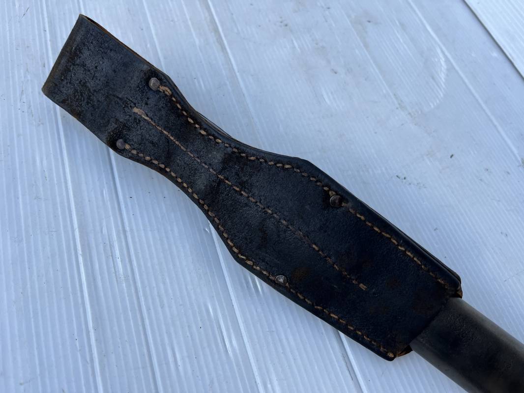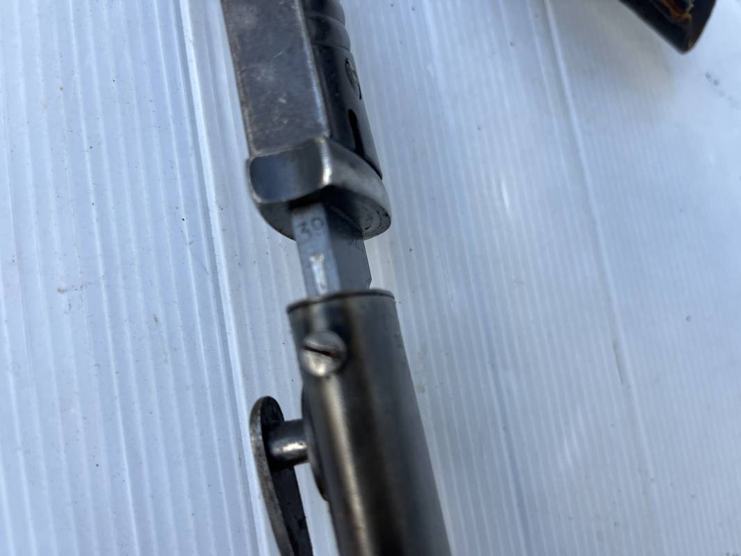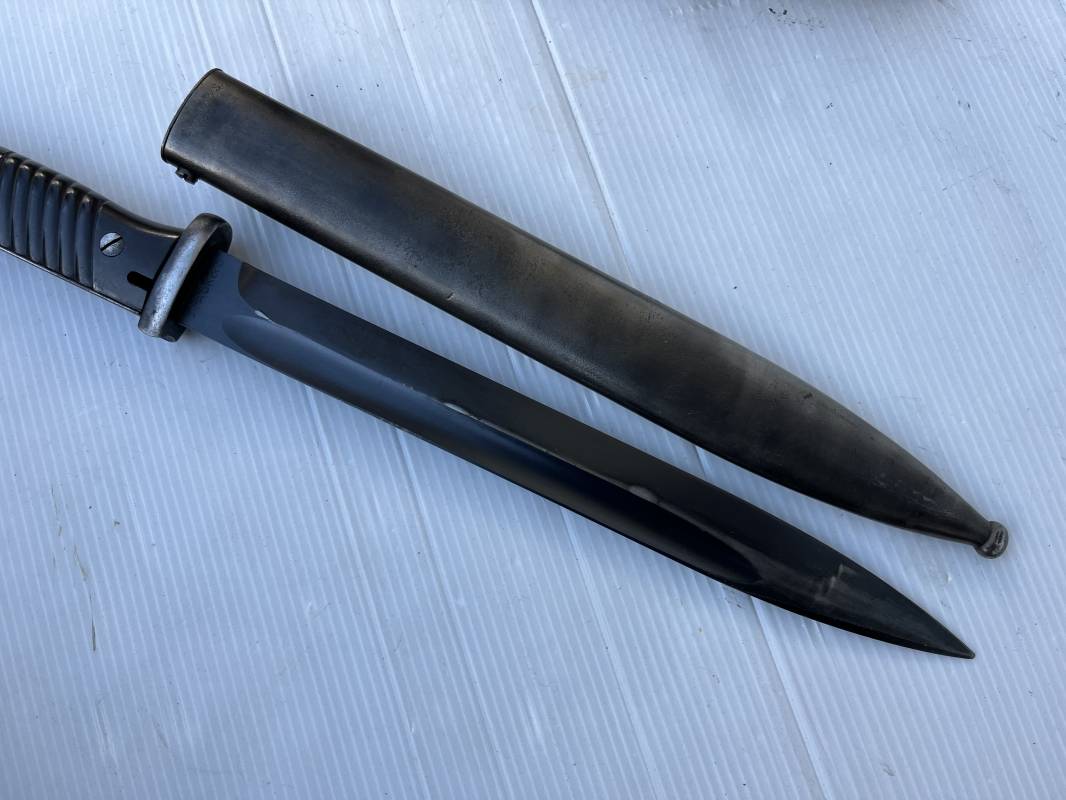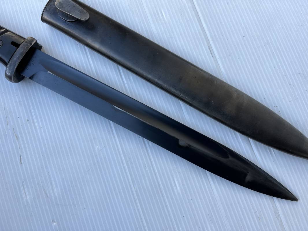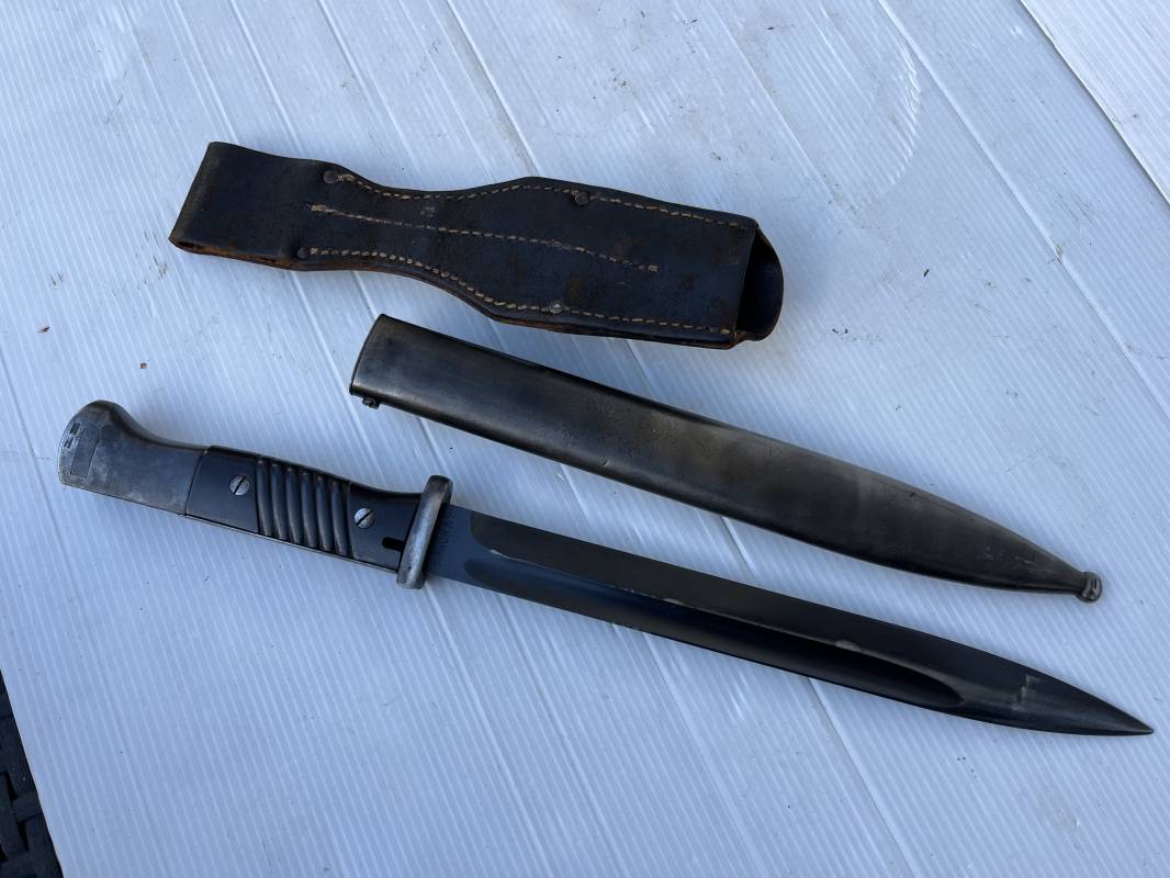 Trés belle Baionnette modèle 84/98 plaquettes bakélite marron foncé et son gousset en cuir noir retourné . Bel ensemble trouvé telquel . Baionnette aux mémes numéros . 8656 J sur fourreau et lame , marquage fabricant E.Pack & Sohn sur lame et fourreau et daté 39 sur tranche de la lame . Bouton poussoir sur pommeau.Aigle WaA sur bouterolle et pommeau . Belle lame bronzée d'origine Fourreau métallique bronzé. Pontet métallique de fixation du gousset. Gousset en cuir retourné noir avec rivets fer . Bel ensemble porté en bel état 100 % nature et intouché . Ref 21490