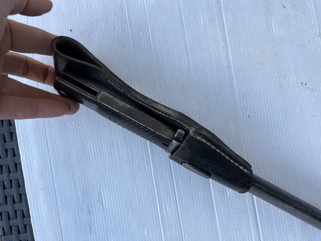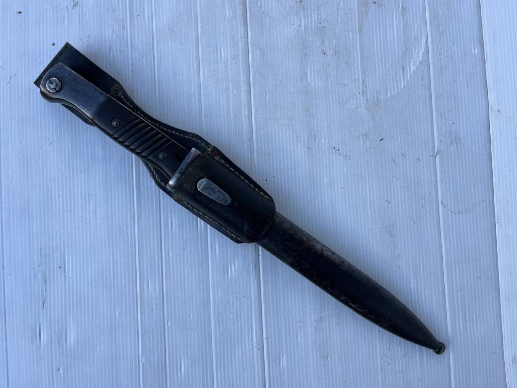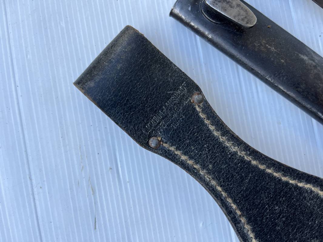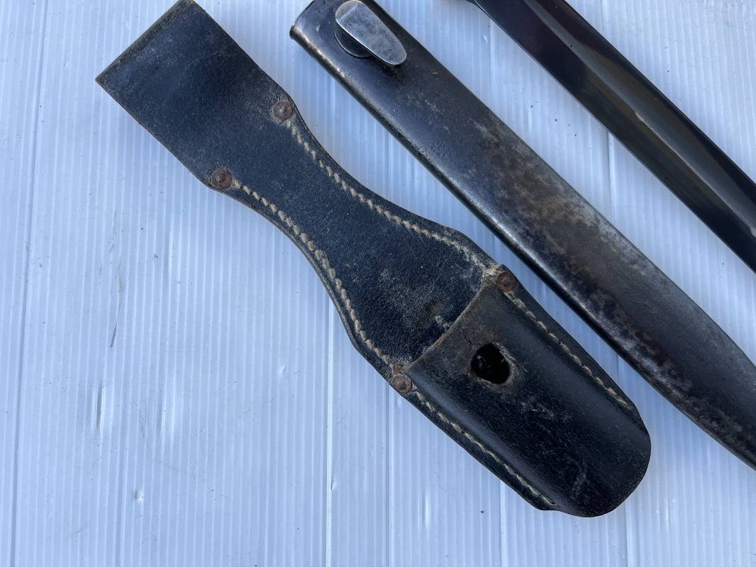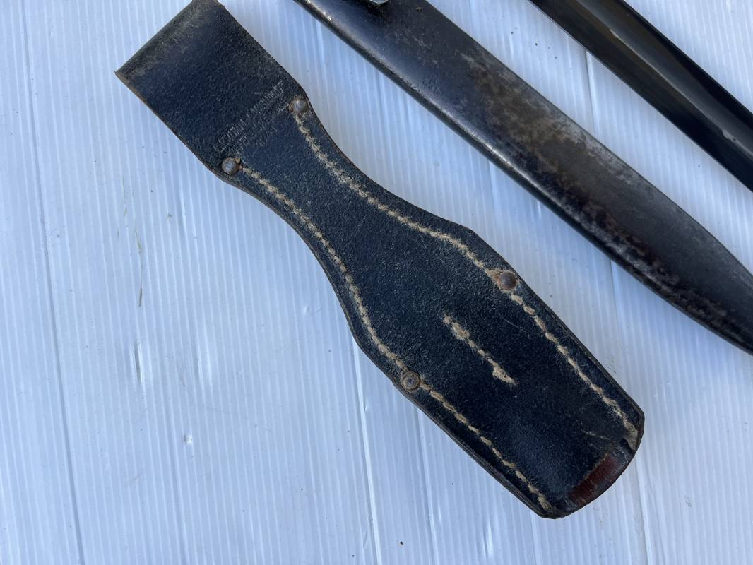 Trés belle Baionnette modèle 84/98 plaquettes bakélite marron foncé et son gousset en cuir noir . Bel ensemble trouvé telquel . Baionnette aux mémes numéros . 912 f sur fourreau et lame , marquage fabricant E.u.Fu Horster sur lame et fourreau et daté 40 sur tranche de la lame . Bouton poussoir sur pommeau.Aigle WaA sur bouterolle et pommeau . Belle lame bronzée d'origine Fourreau métallique bronzé. Pontet métallique de fixation du gousset. Gousset en cuir noir avec rivets fer , marquage fabricant au dos daté 1941 . Bel ensemble porté en bel état 100 % nature et intouché . Ref 21489
