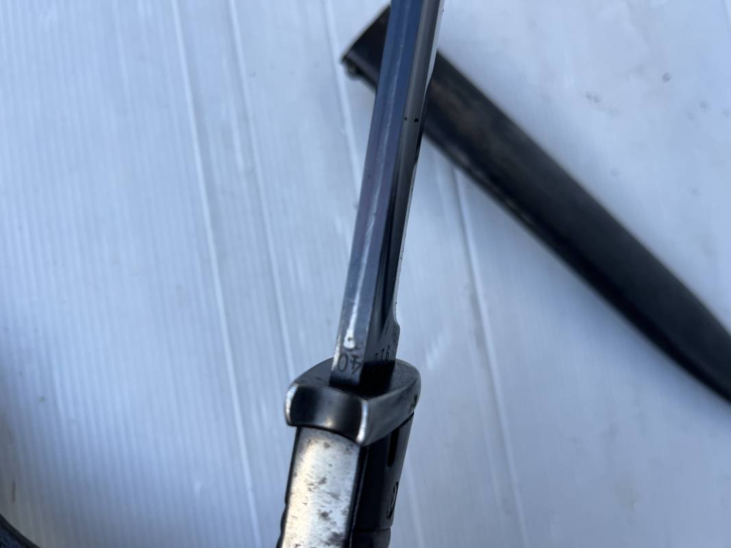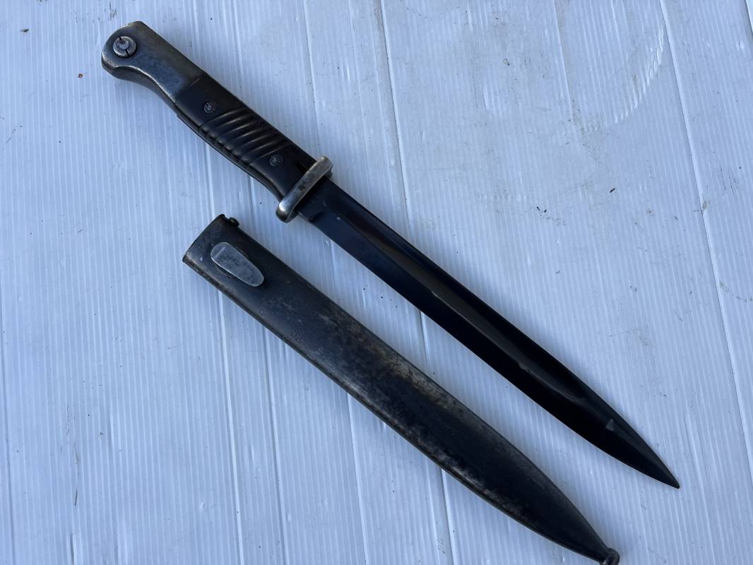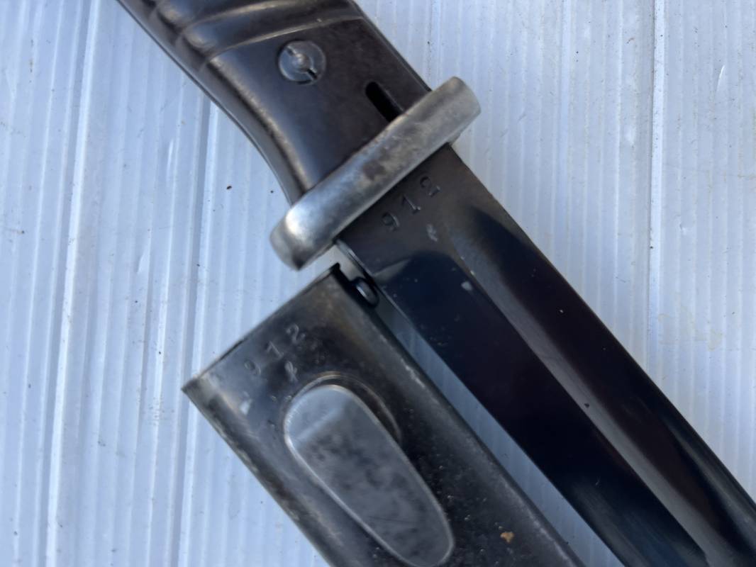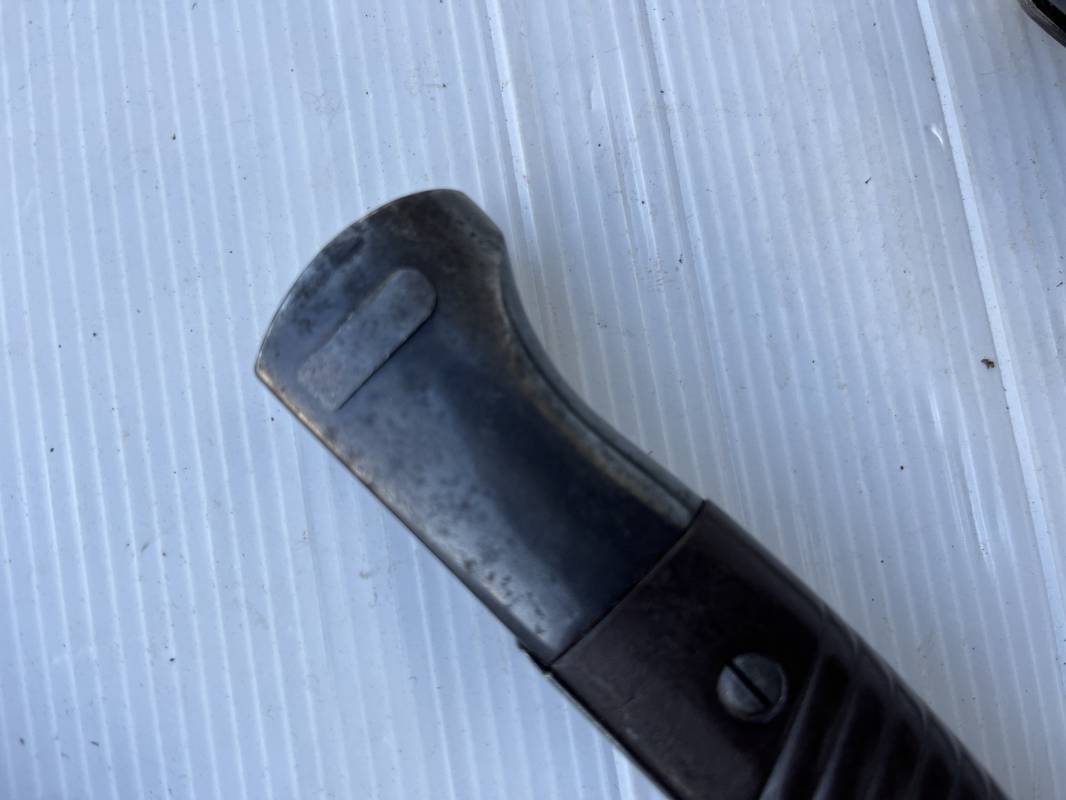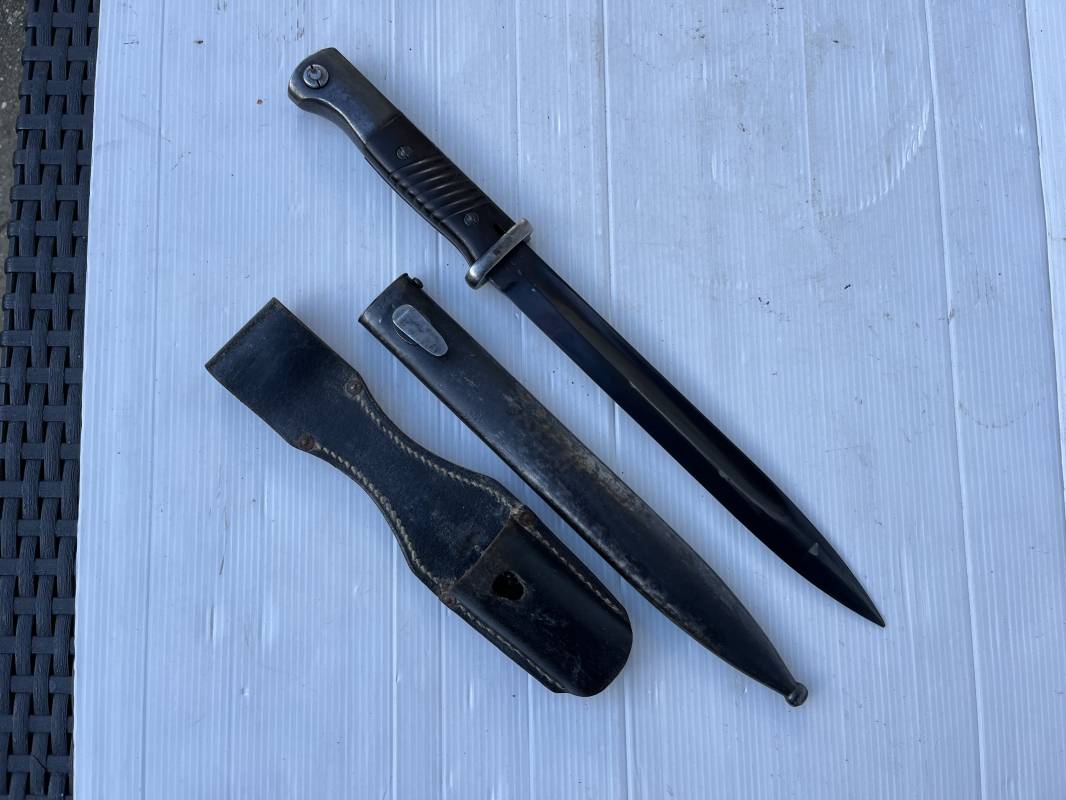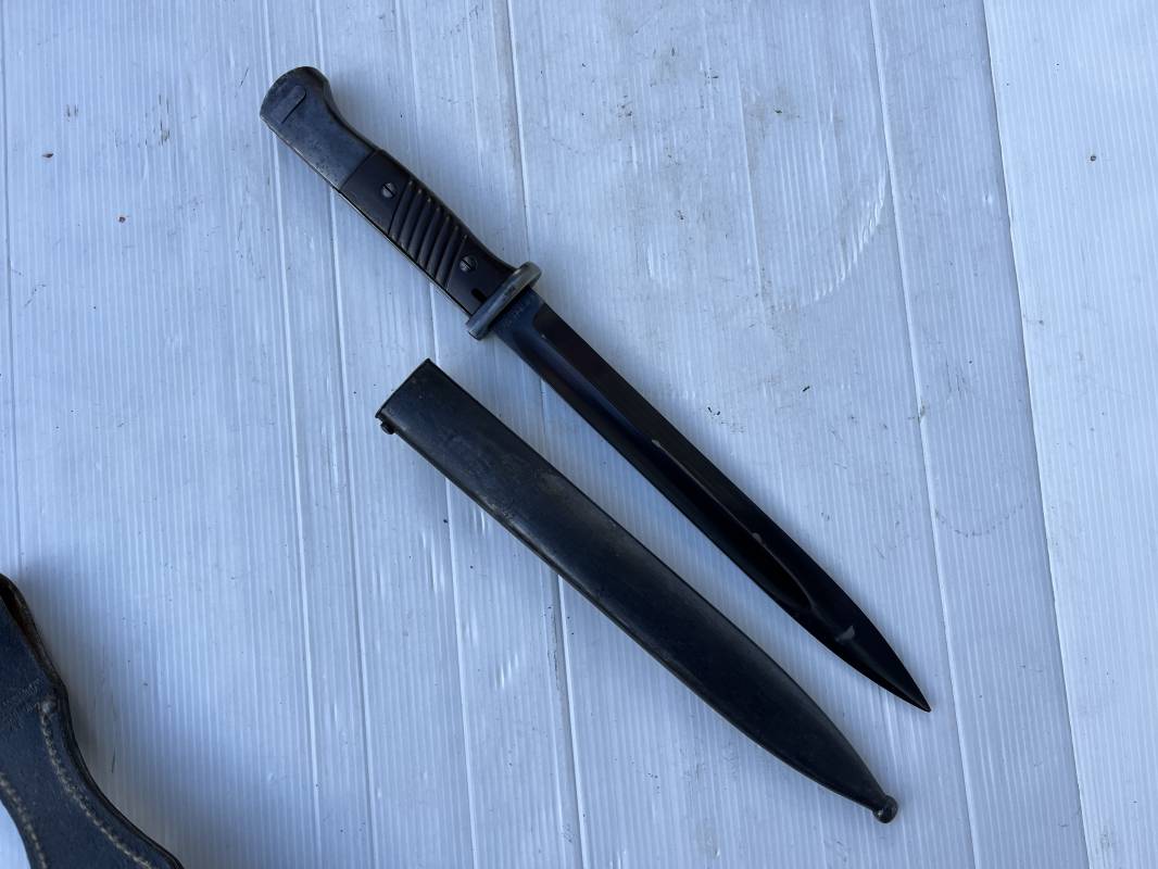 Trés belle Baionnette modèle 84/98 plaquettes bakélite marron foncé et son gousset en cuir noir . Bel ensemble trouvé telquel . Baionnette aux mémes numéros . 912 f sur fourreau et lame , marquage fabricant E.u.Fu Horster sur lame et fourreau et daté 40 sur tranche de la lame . Bouton poussoir sur pommeau.Aigle WaA sur bouterolle et pommeau . Belle lame bronzée d'origine Fourreau métallique bronzé. Pontet métallique de fixation du gousset. Gousset en cuir noir avec rivets fer , marquage fabricant au dos daté 1941 . Bel ensemble porté en bel état 100 % nature et intouché . Ref 21489