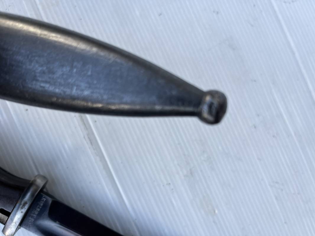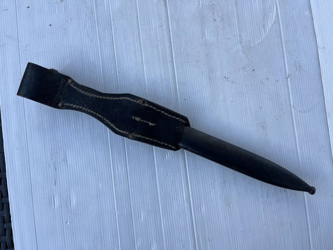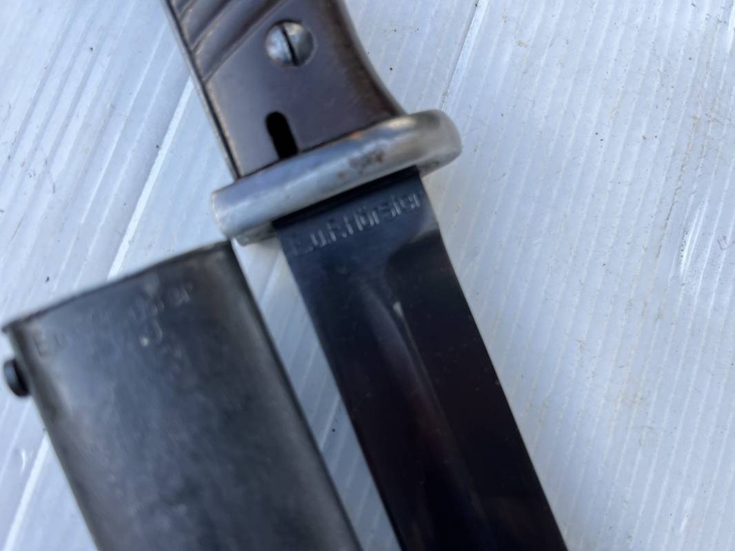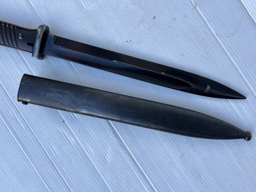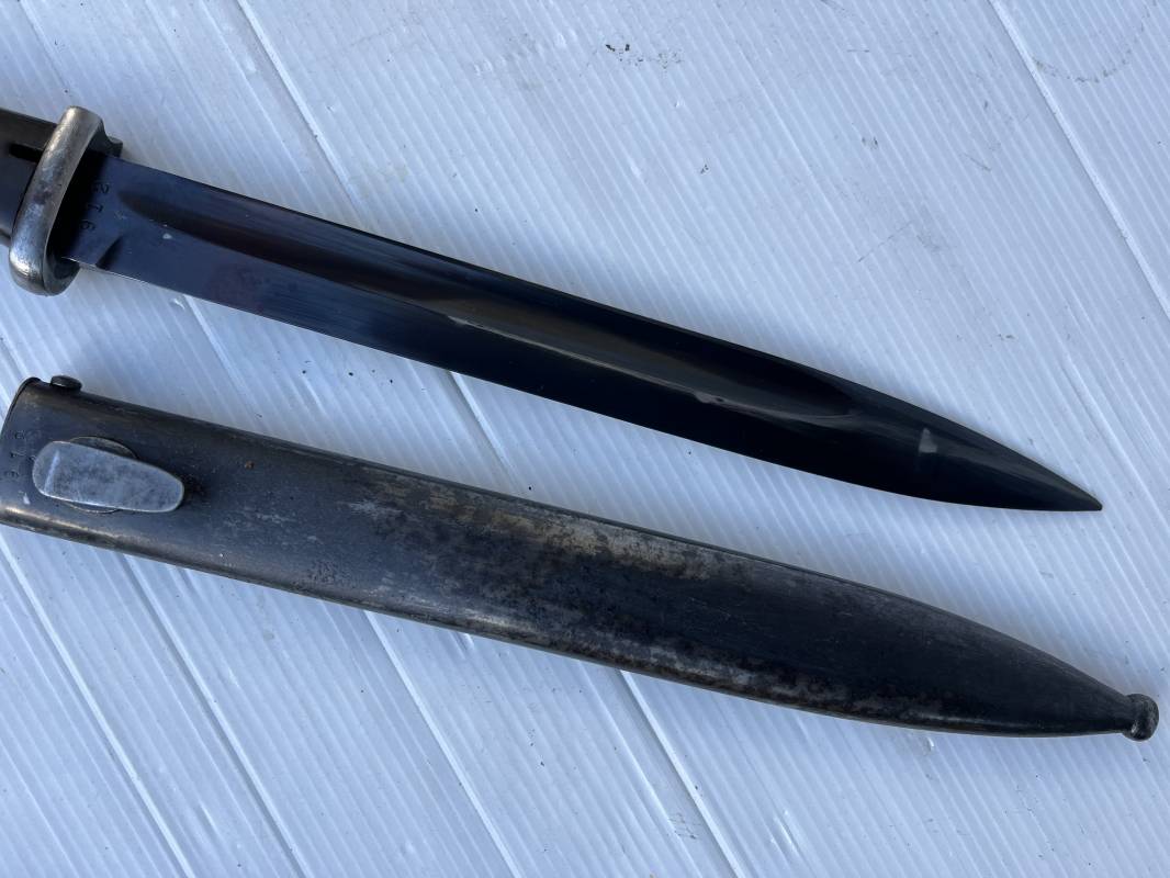 Trés belle Baionnette modèle 84/98 plaquettes bakélite marron foncé et son gousset en cuir noir . Bel ensemble trouvé telquel . Baionnette aux mémes numéros . 912 f sur fourreau et lame , marquage fabricant E.u.Fu Horster sur lame et fourreau et daté 40 sur tranche de la lame . Bouton poussoir sur pommeau.Aigle WaA sur bouterolle et pommeau . Belle lame bronzée d'origine Fourreau métallique bronzé. Pontet métallique de fixation du gousset. Gousset en cuir noir avec rivets fer , marquage fabricant au dos daté 1941 . Bel ensemble porté en bel état 100 % nature et intouché . Ref 21489