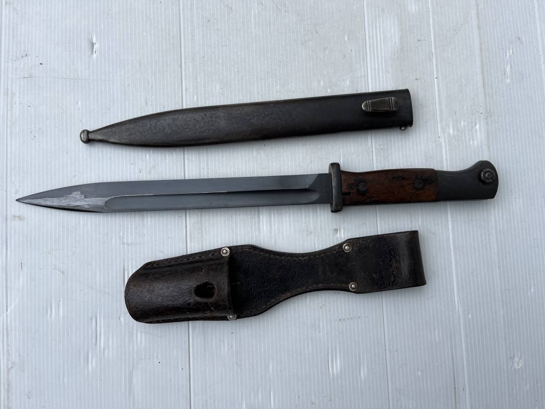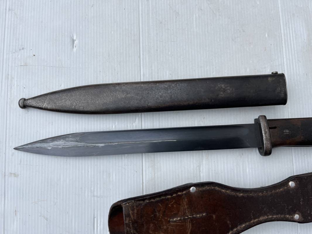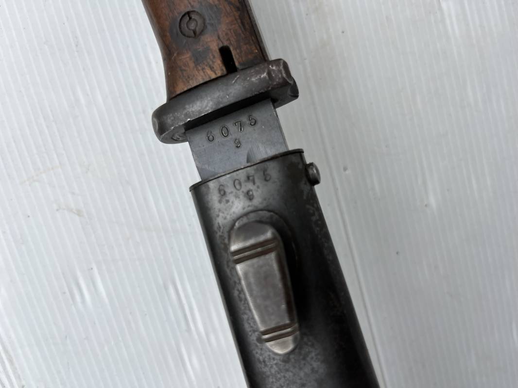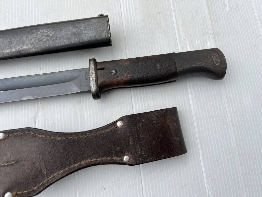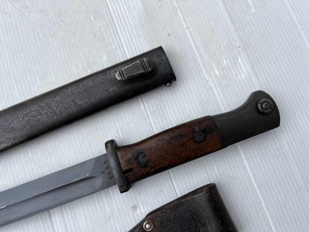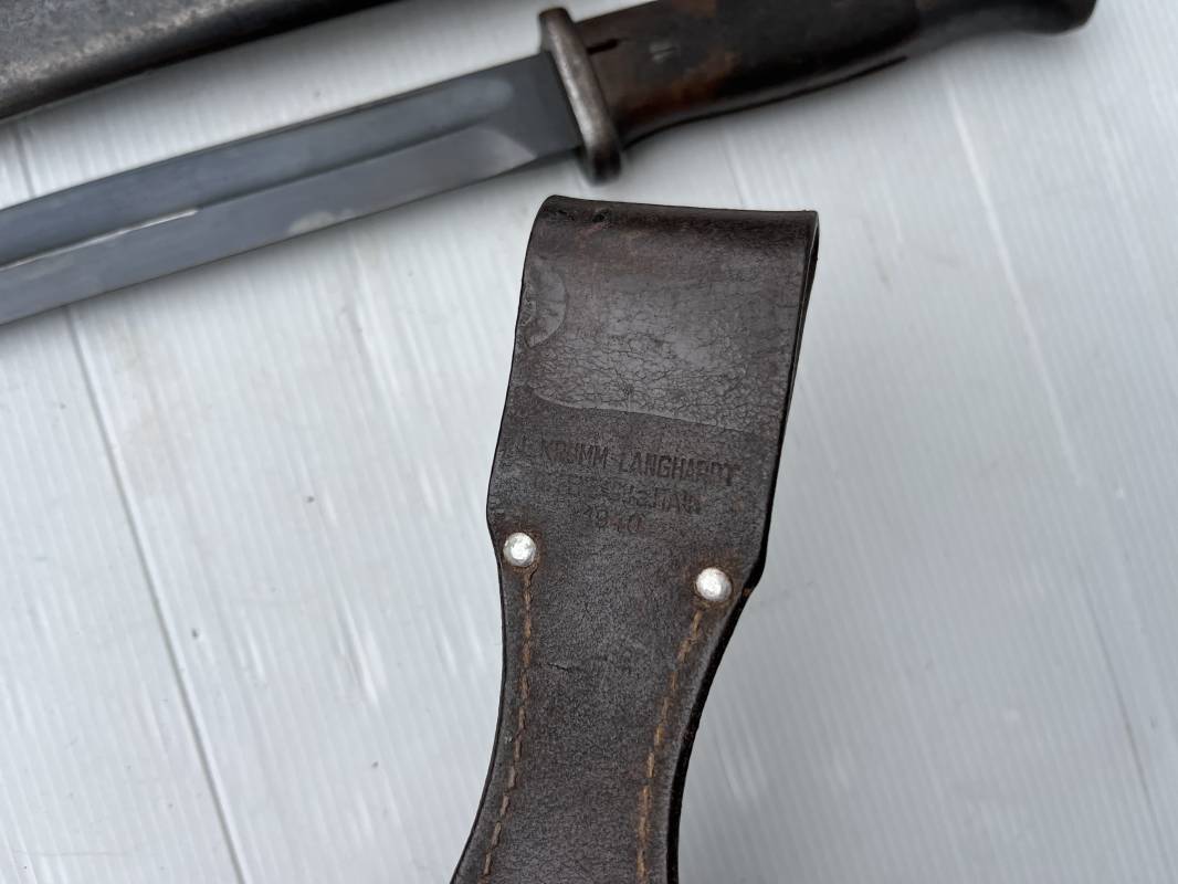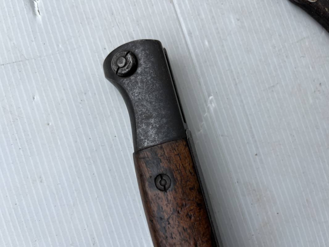 Trés belle Baionnette modèle 84/98 plaquettes bois et son gousset en cuir retourné marron noirci à l usage . Baionnette aux mémes numéros .6075 g sur fourreau et lame , marquage code fabricant Jos Corts Sn 1938 sur lame et fourreau . Marquage '38' sur la tranche de lame . Bouton poussoir . Superbe lame bronzée d'origine Fourreau métallique bronzé . Marquage aigle WaA sur pommeau et bouterole . Pontet métallique de fixation du gousset. Gousset en cuir retourné marron foncé ,noirci a l usage avec rivets alu , modéle sans patelette en cuir , passant cuir pour le port au ceinturon . Cuir souple .Marquage fabricant Krumm Langhart 1940 Bel ensemble porté en bel état 100 % nature et intouché . Ref 19936