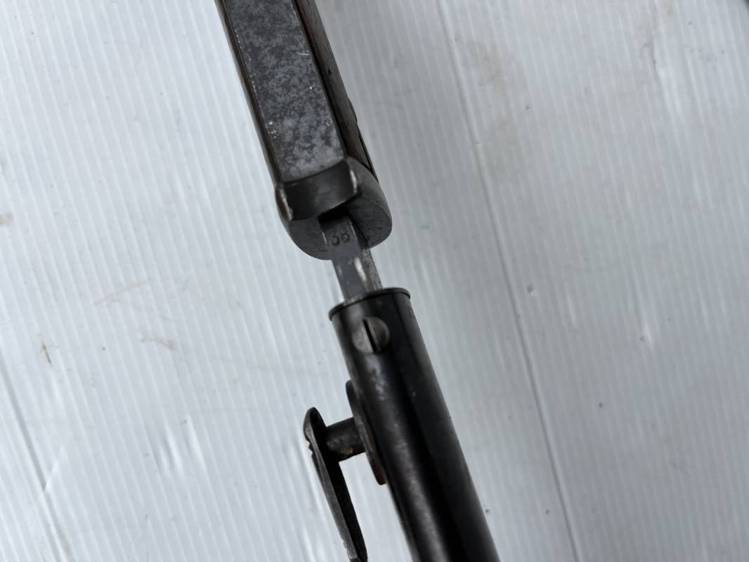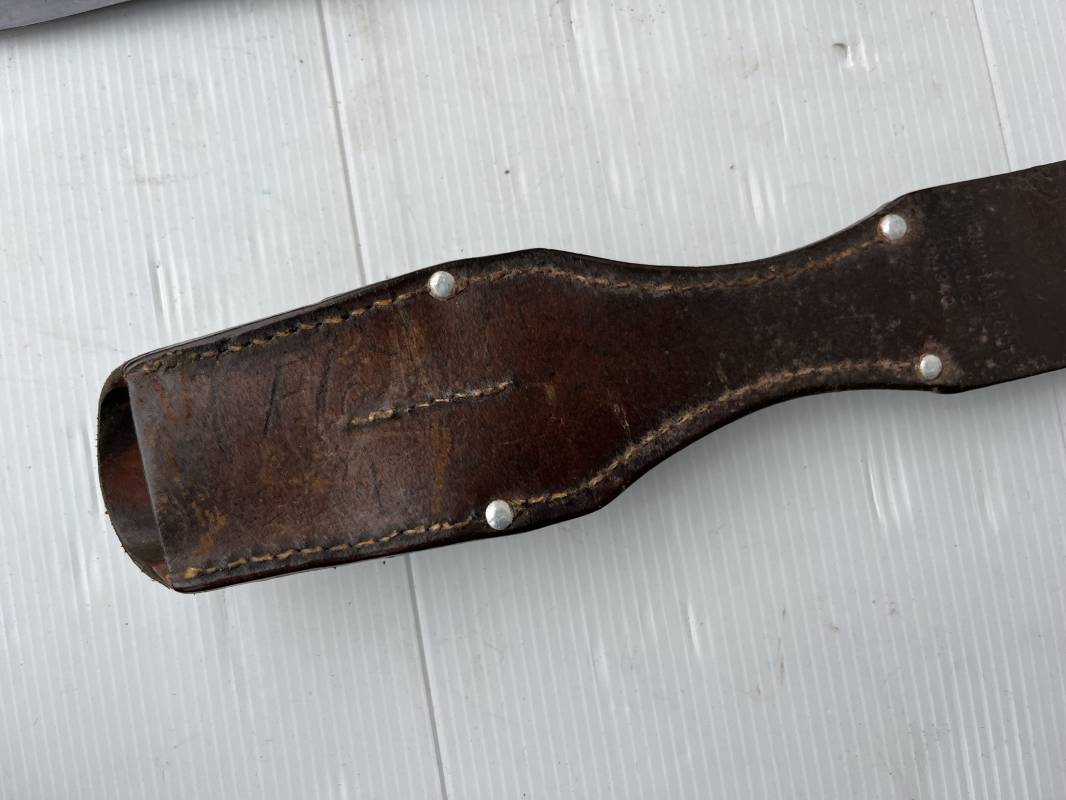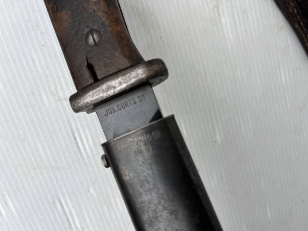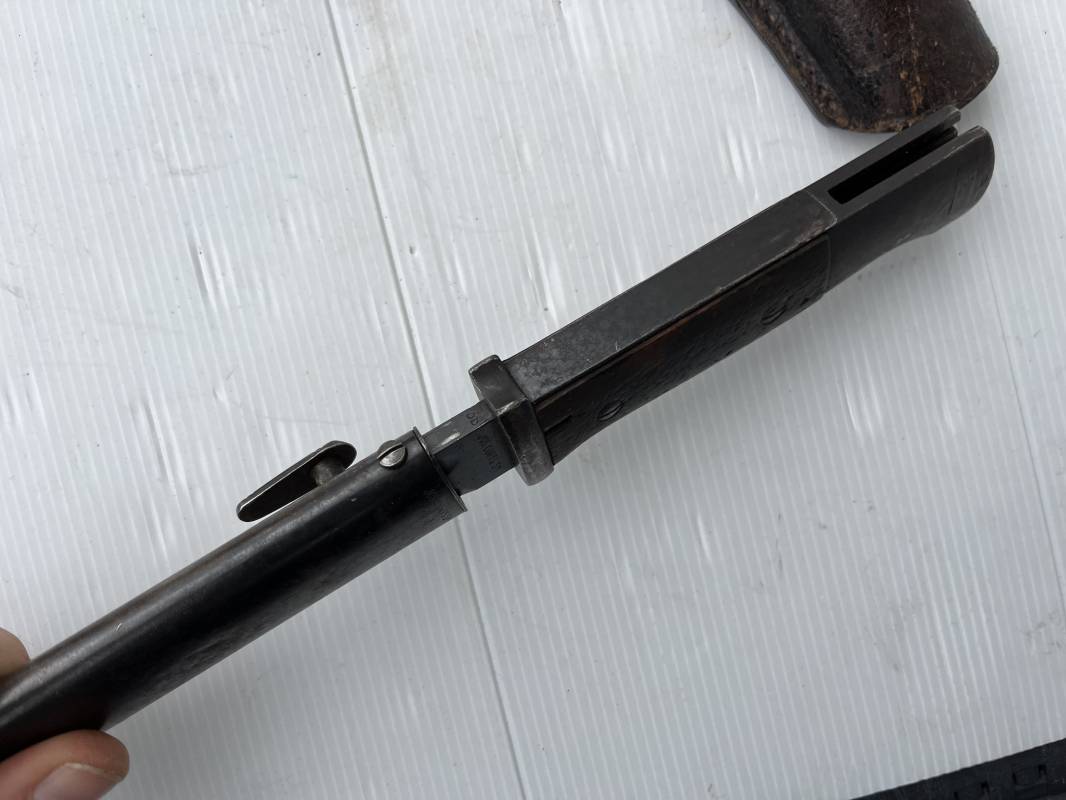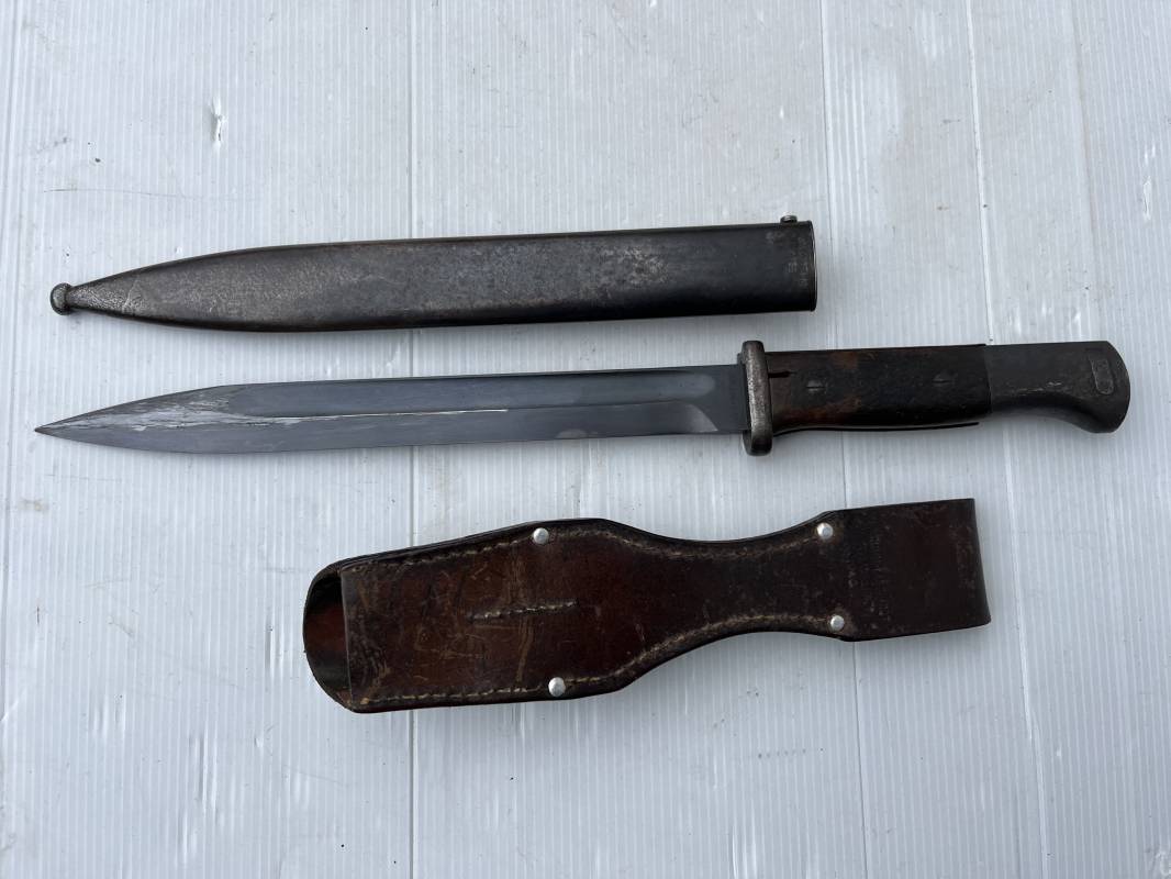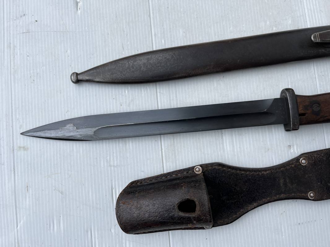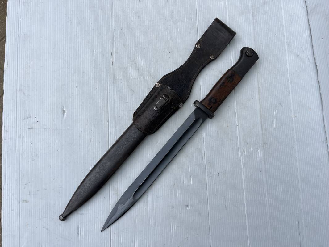 Trés belle Baionnette modèle 84/98 plaquettes bois et son gousset en cuir retourné marron noirci à l usage . Baionnette aux mémes numéros .6075 g sur fourreau et lame , marquage code fabricant Jos Corts Sn 1938 sur lame et fourreau . Marquage '38' sur la tranche de lame . Bouton poussoir . Superbe lame bronzée d'origine Fourreau métallique bronzé . Marquage aigle WaA sur pommeau et bouterole . Pontet métallique de fixation du gousset. Gousset en cuir retourné marron foncé ,noirci a l usage avec rivets alu , modéle sans patelette en cuir , passant cuir pour le port au ceinturon . Cuir souple .Marquage fabricant Krumm Langhart 1940 Bel ensemble porté en bel état 100 % nature et intouché . Ref 19936