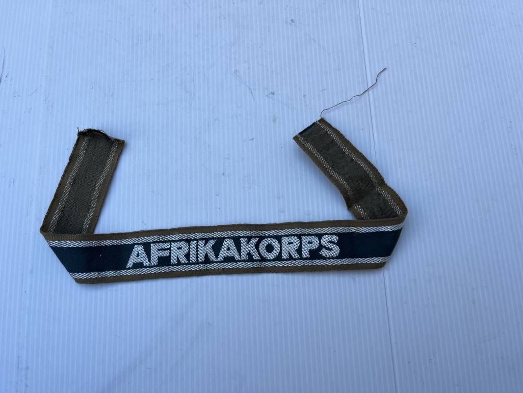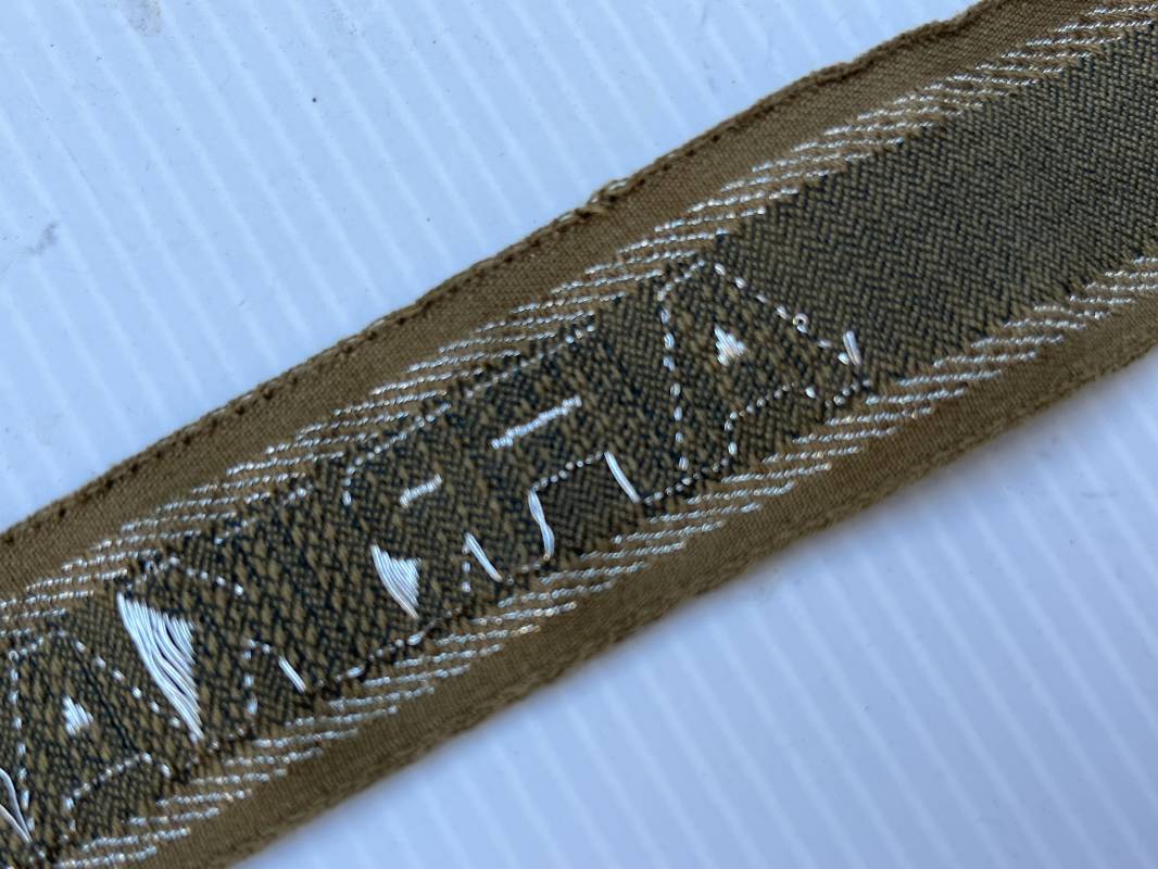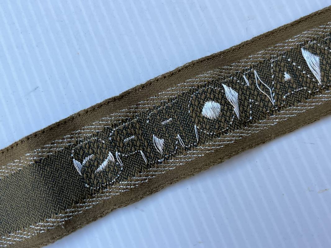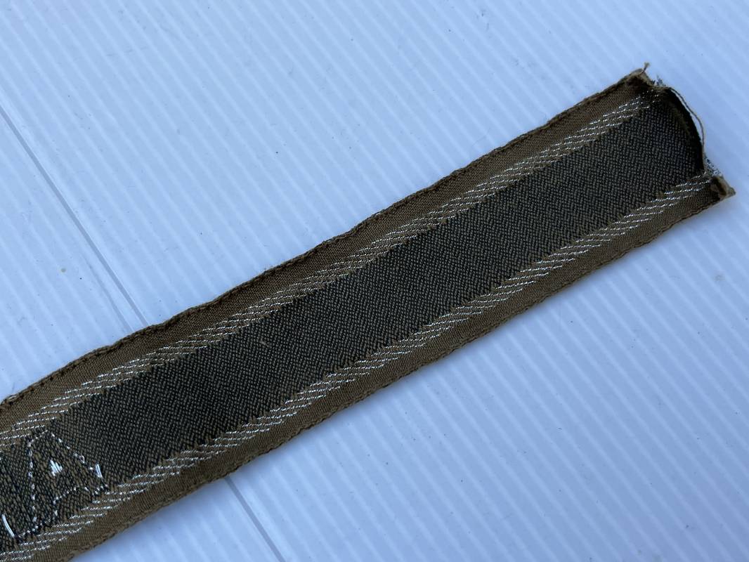 Trés belle bande de bras AFRIKAKORPS . Confection réglementaire du modéle tissé Bevo . Tissage AFRIKAKORPS en fil d'aluminium . Démonté d'une vareuse Longueur totale 395 Mm .Pleine longueur . Légérement portée en Parfait état . Ref 21410