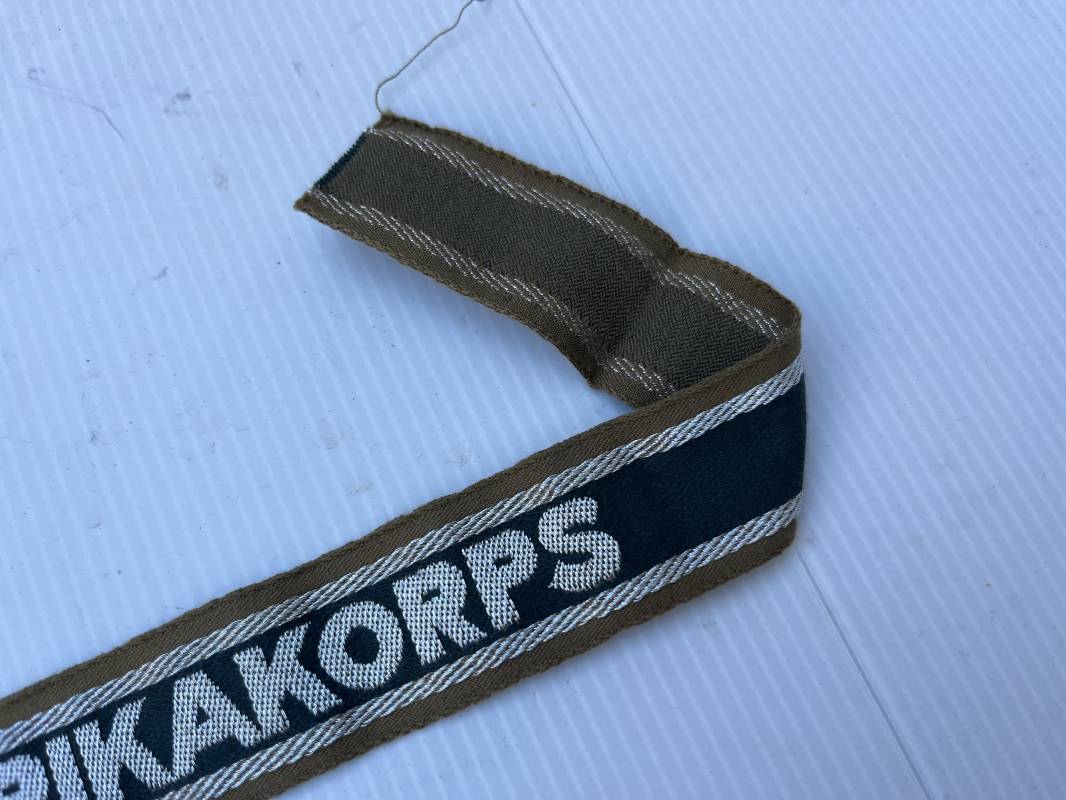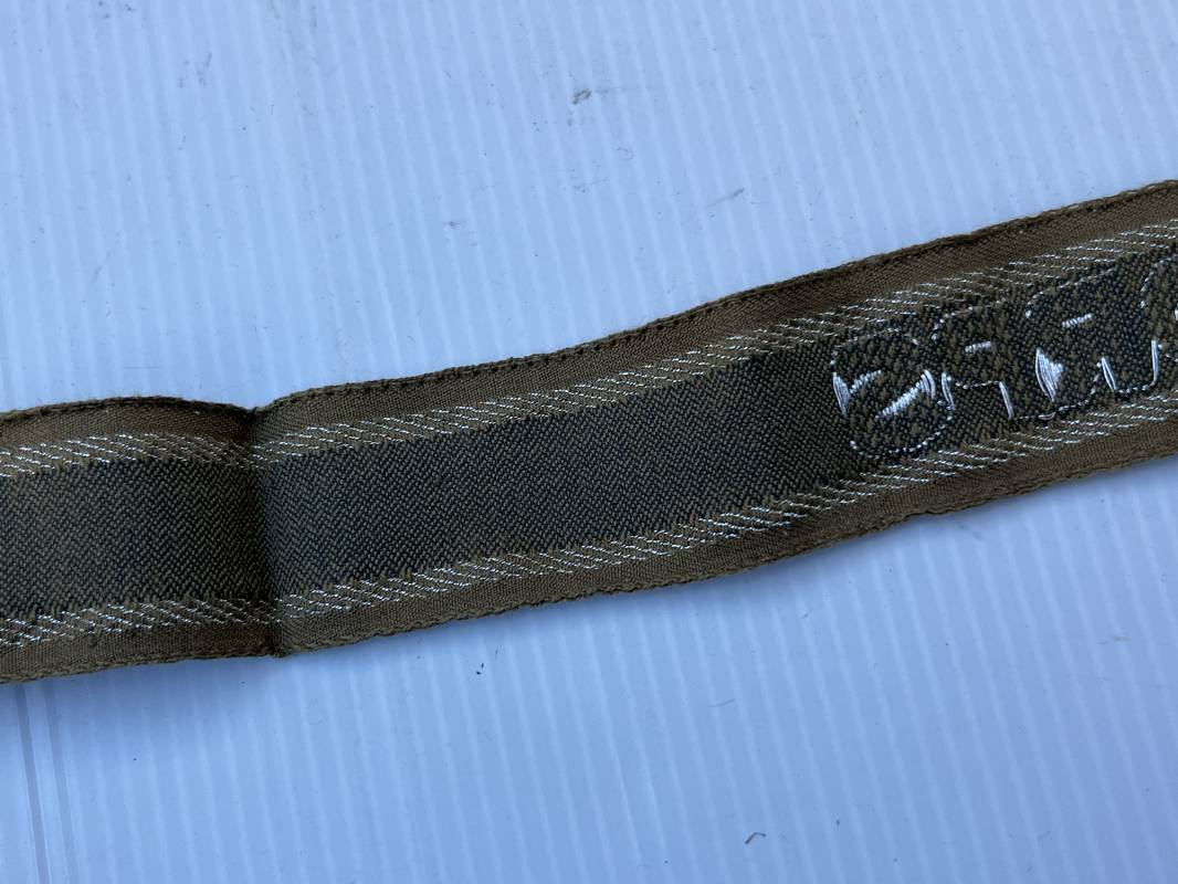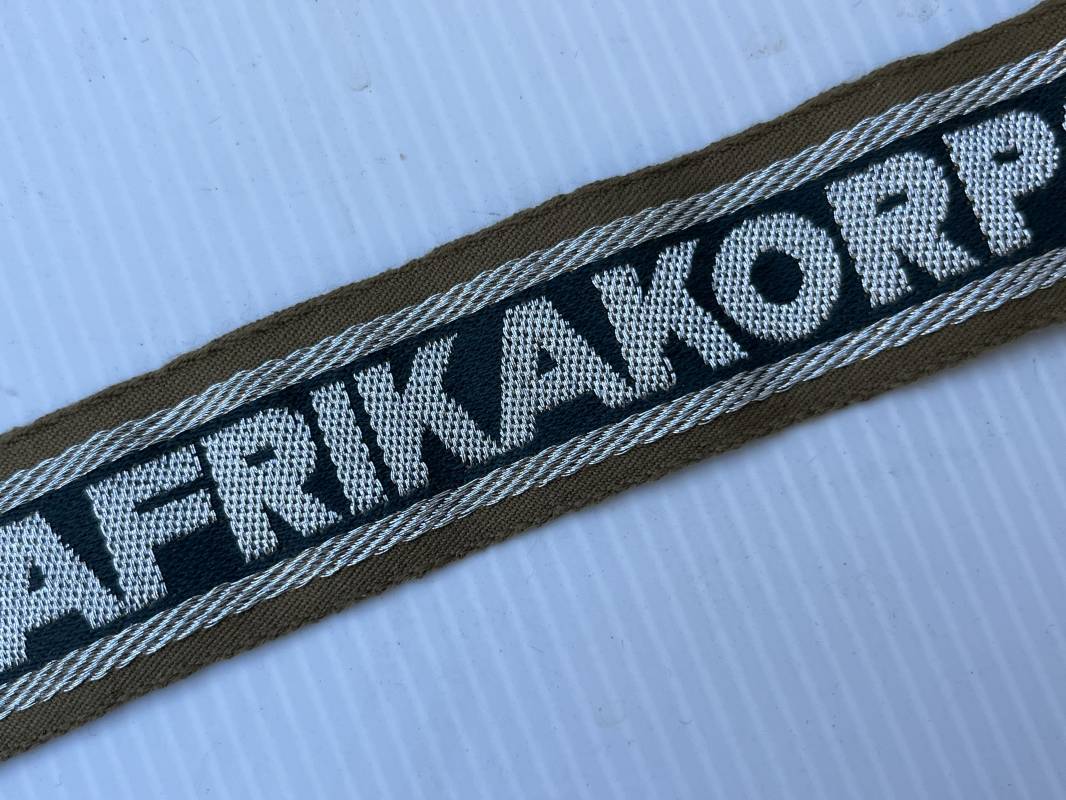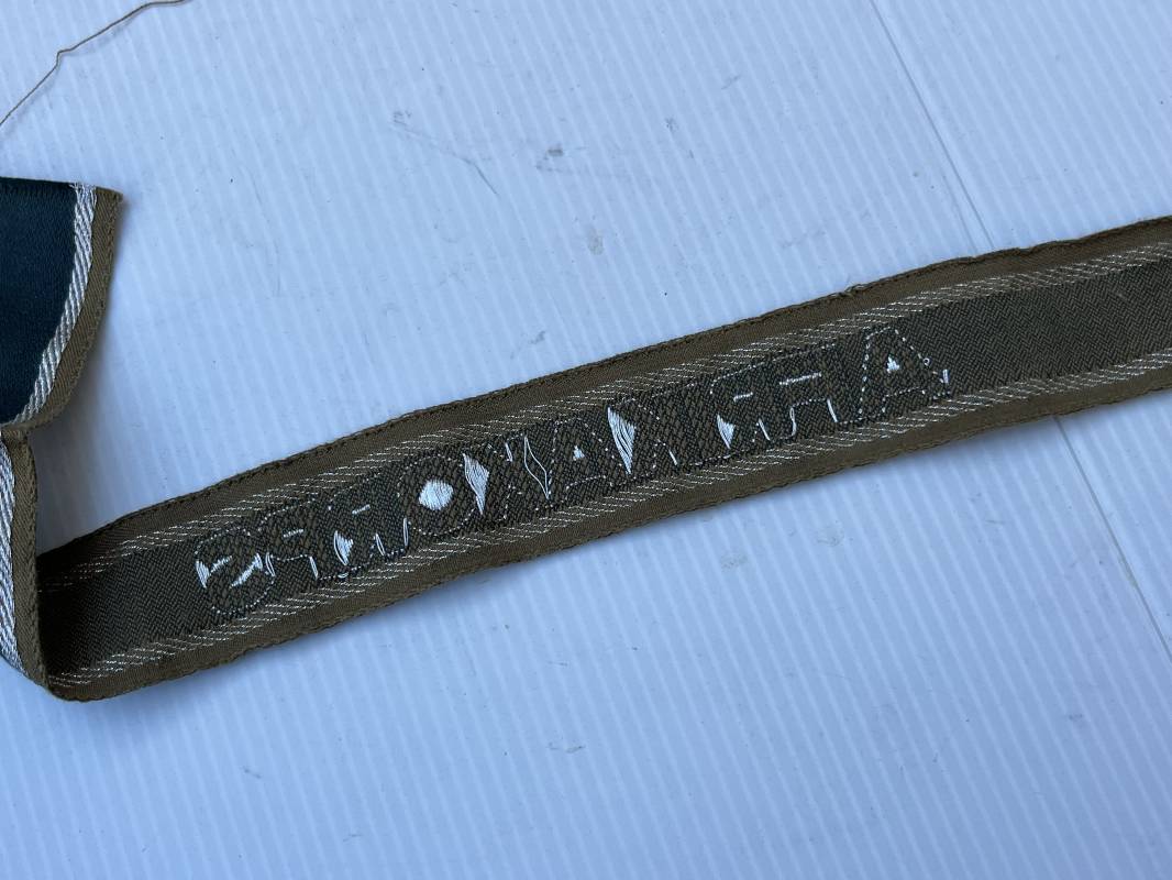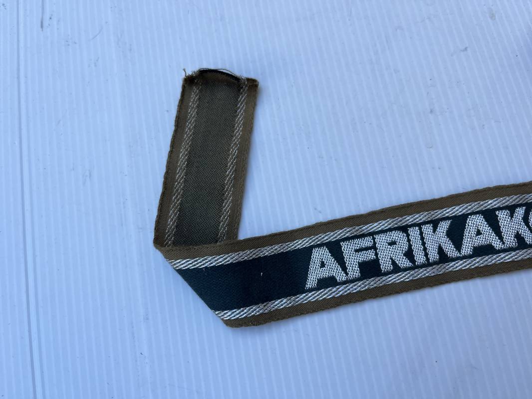 Trés belle bande de bras AFRIKAKORPS . Confection réglementaire du modéle tissé Bevo . Tissage AFRIKAKORPS en fil d'aluminium . Démonté d'une vareuse Longueur totale 395 Mm .Pleine longueur . Légérement portée en Parfait état . Ref 21410