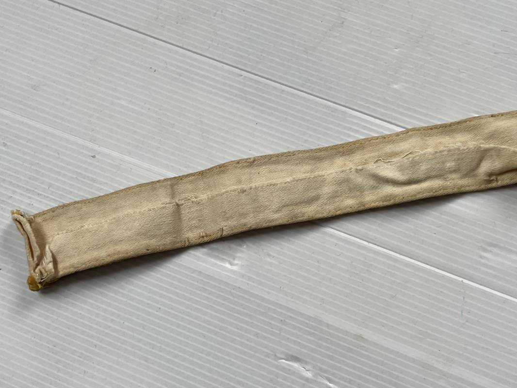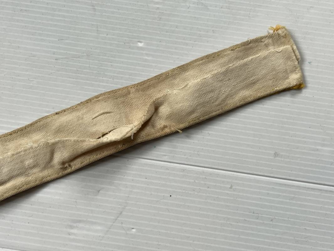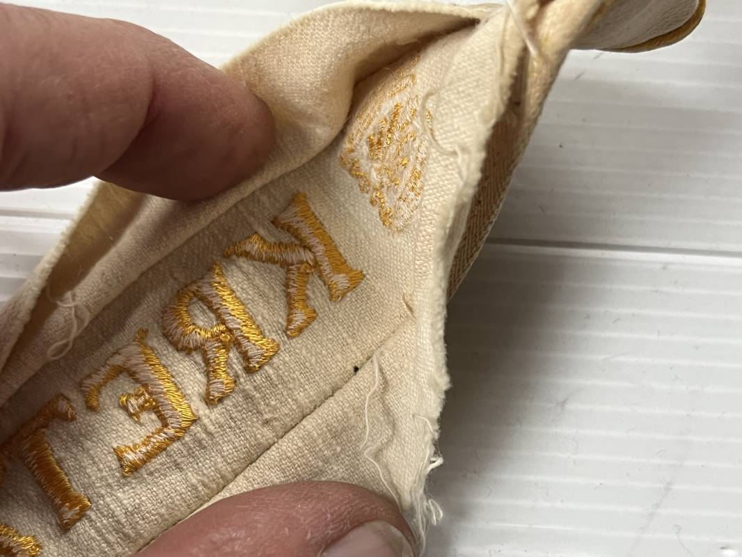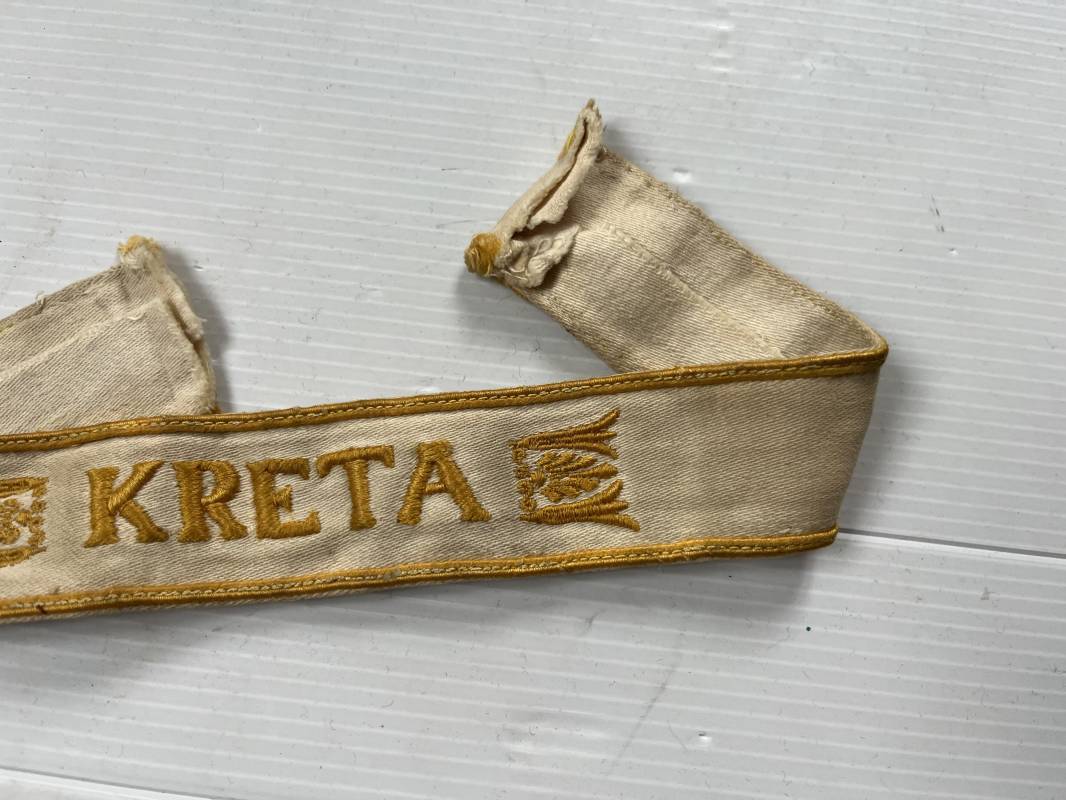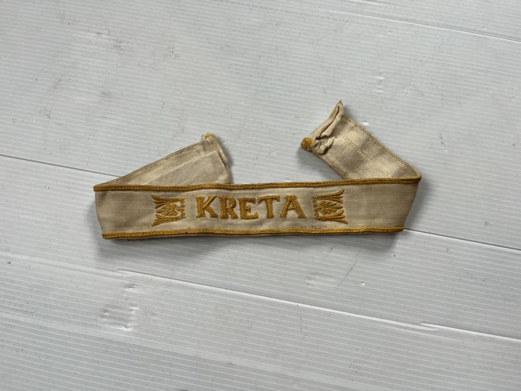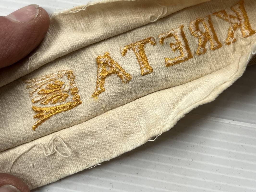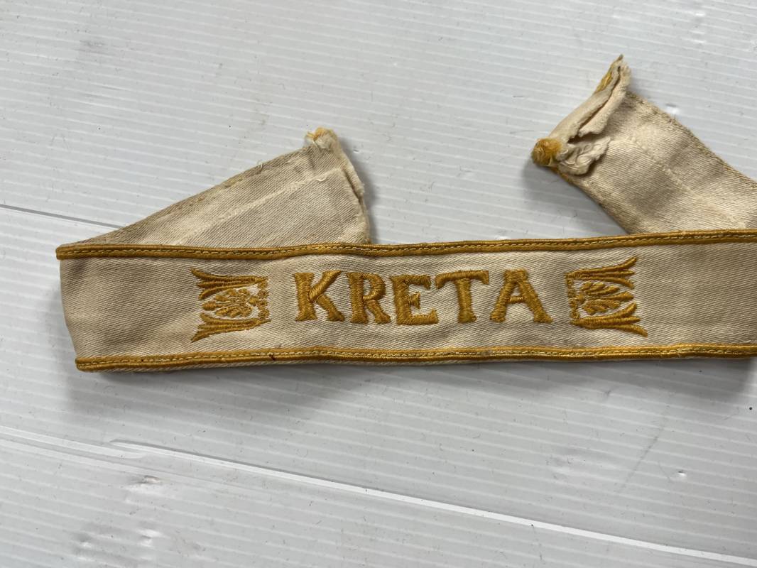 Rare bande de bras de dotation commémorative 'KRETA' . Bande de bras légèrement portée démontée d'une vareuse . Longueur à plat 37 cm . trés belle patine générale . Broderies coton jaune d 'or . Rare bande de bras commémorative de la prise de l'ile de Créte en 1941 . Insigne peu courant Ref 20029
