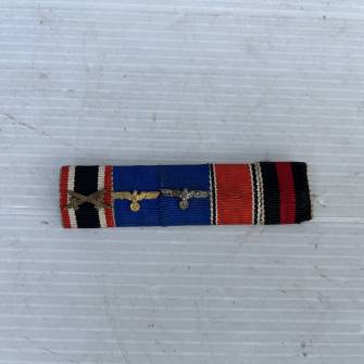 Barette de rappel de décorations de la Wehrmacht . Longueur 75 mm . Barette de 5 décorations KVK 2éme cl avec glaives 1939 , Deux dannexions , 2 de service . Attache horizontale au dos . Parfait état Ref 19826