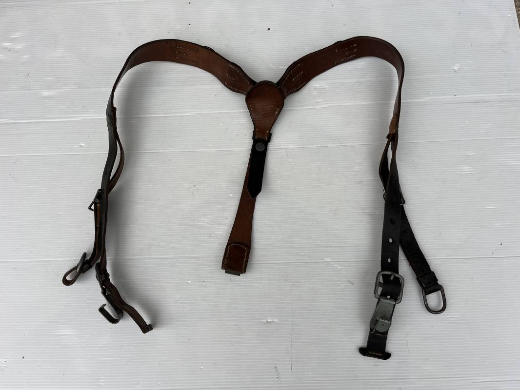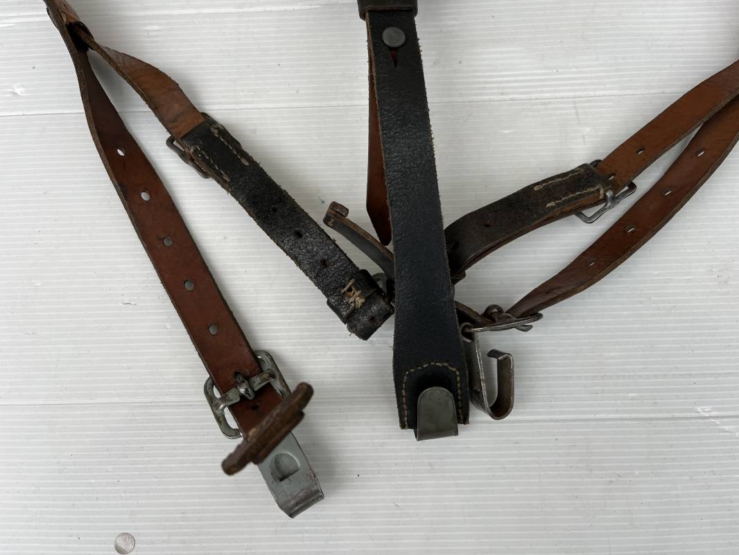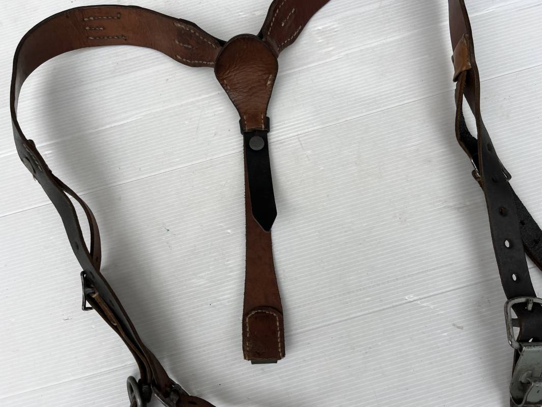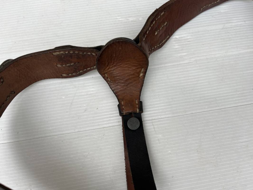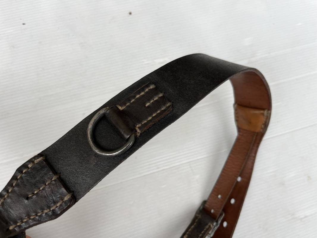 Belles de bretelles de suspension en cuir noir retourné de la Wehrmacht . Bretelles modéle 1939 du modéle lourd pour fixation du chargement dorsal . Anneaux et crochets en fer peints en gris . Rivets fer . Bretelle dorsale en cuir et anneau . Pastille de protection en cuir . Marquage code fabricant Rbnr . Légérement porté en parfait état . Cuir souple 1939/45 Ref 21411