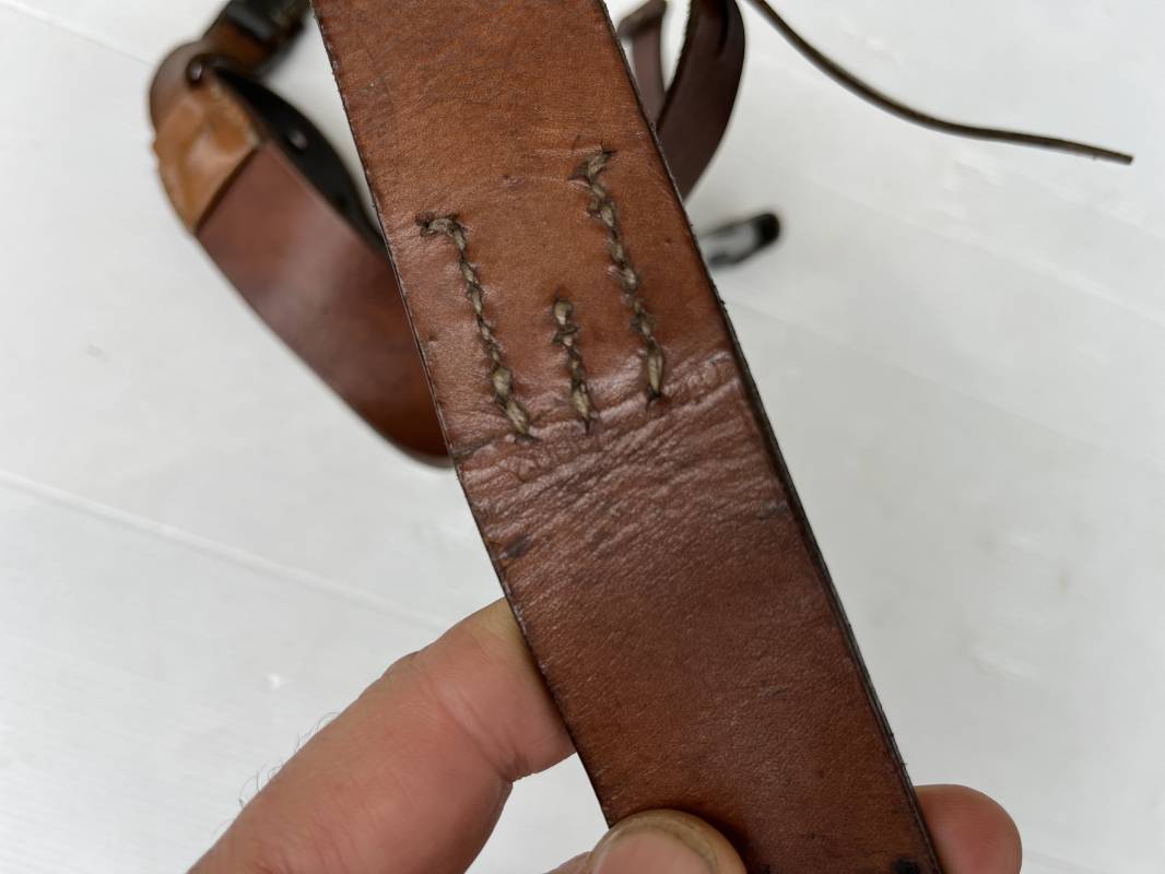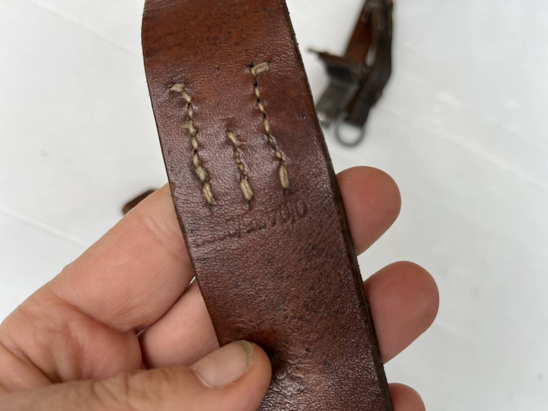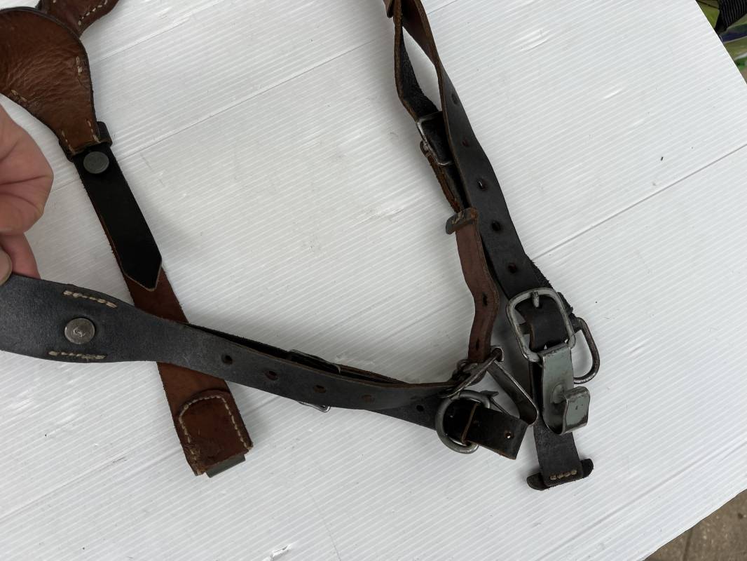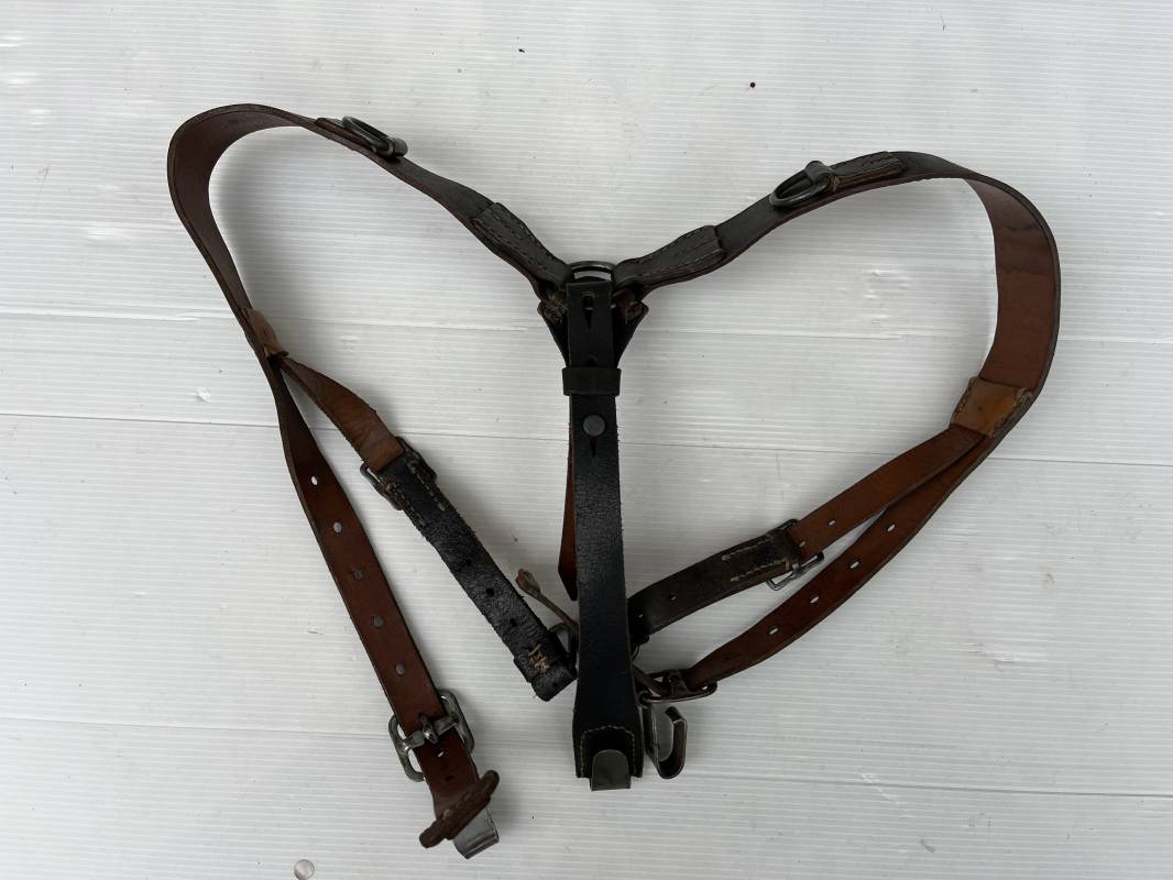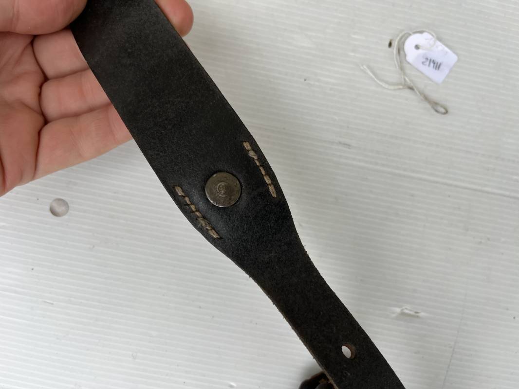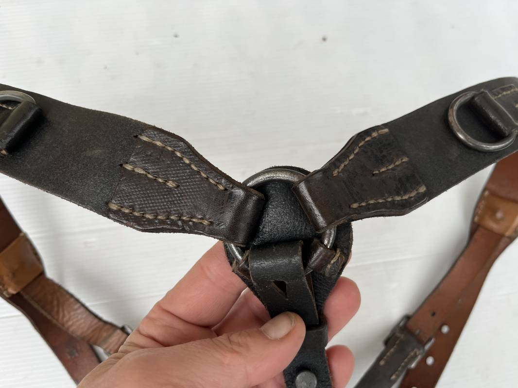 Belles de bretelles de suspension en cuir noir retourné de la Wehrmacht . Bretelles modéle 1939 du modéle lourd pour fixation du chargement dorsal . Anneaux et crochets en fer peints en gris . Rivets fer . Bretelle dorsale en cuir et anneau . Pastille de protection en cuir . Marquage code fabricant Rbnr . Légérement porté en parfait état . Cuir souple 1939/45 Ref 21411