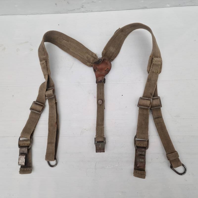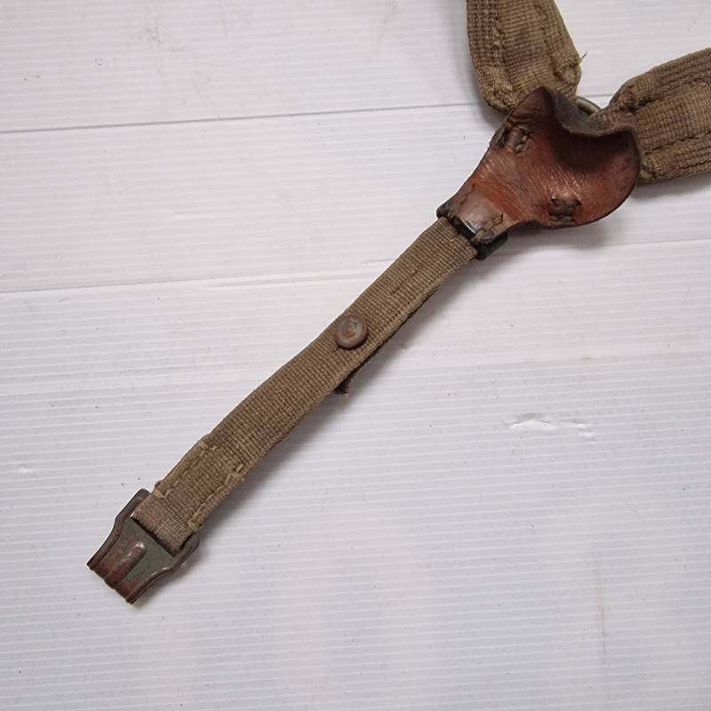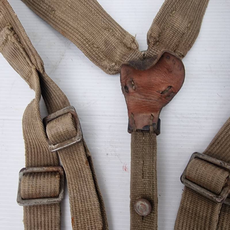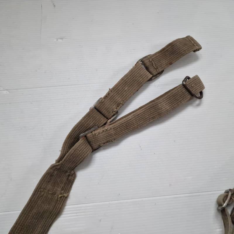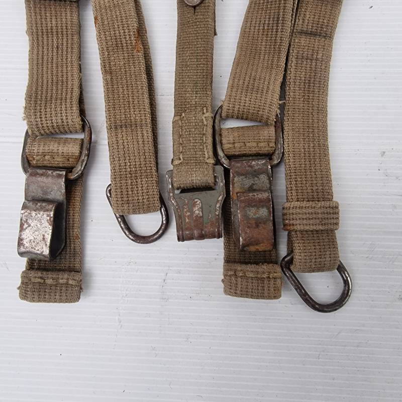 Rares bretelles de suspension du modèle tropical en toile vert olive . Modèle lourd avec contres sanglons et anneaux de fixation du sac à dos. Anneaux et crochets en fer. Plastron en cuir avec nom du soldat manuscrit . Brelage légèrement porté en parfait état. Trés belle patine générale .Rare équipement pour troupe de l'Afrika Korps 1941/43. Ref 19418
