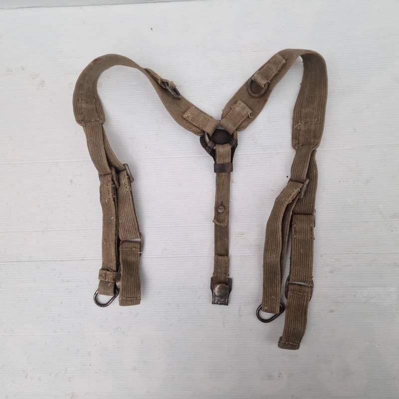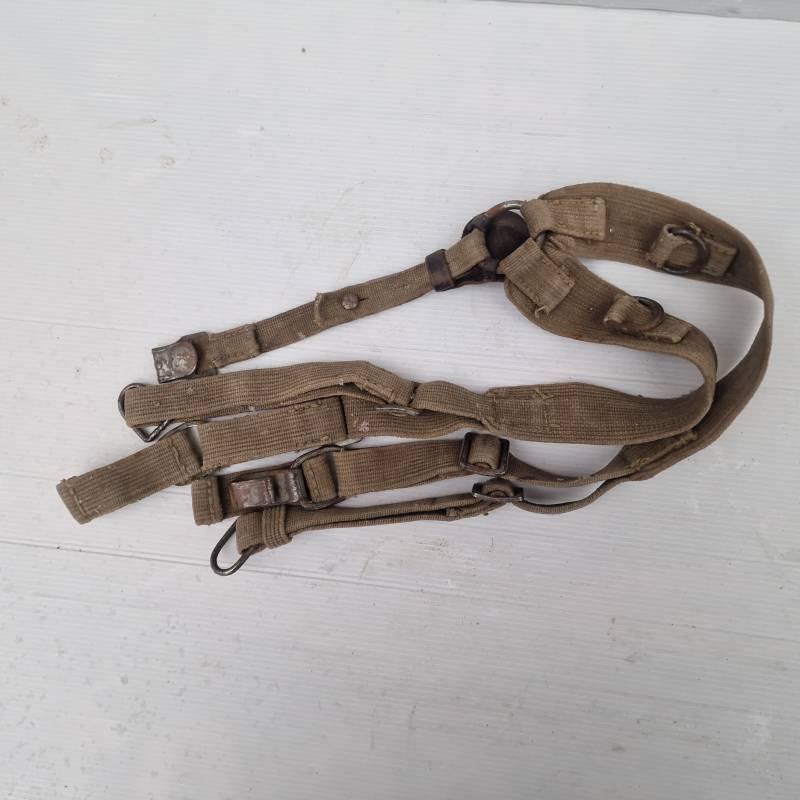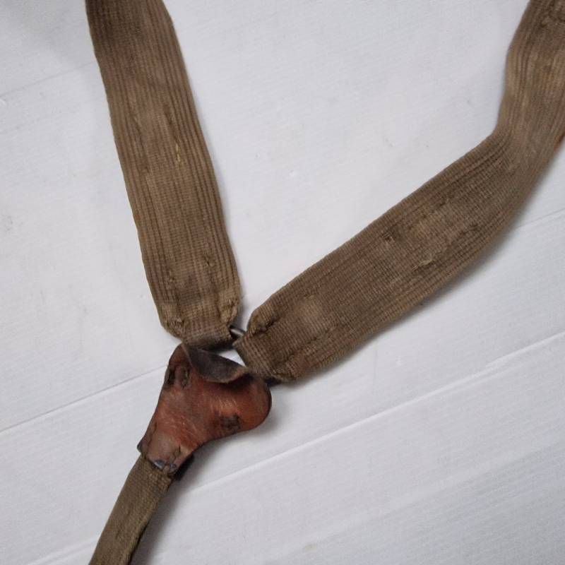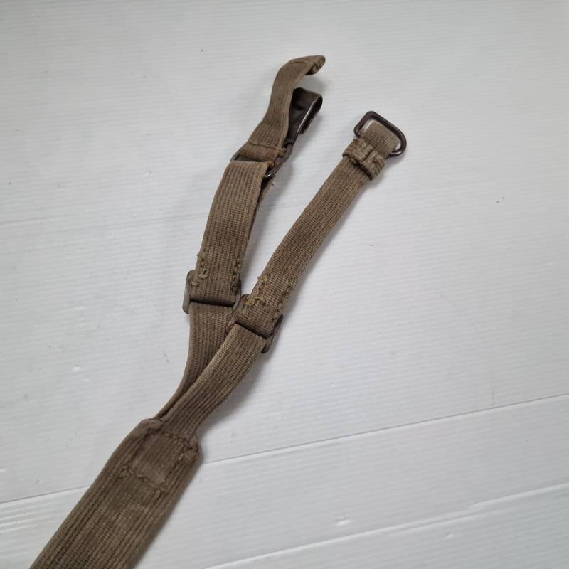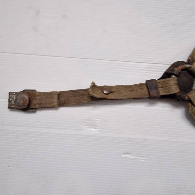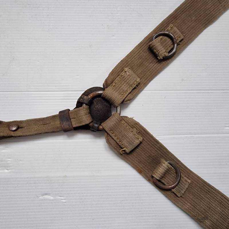 Rares bretelles de suspension du modèle tropical en toile vert olive . Modèle lourd avec contres sanglons et anneaux de fixation du sac à dos. Anneaux et crochets en fer. Plastron en cuir avec nom du soldat manuscrit . Brelage légèrement porté en parfait état. Trés belle patine générale .Rare équipement pour troupe de l'Afrika Korps 1941/43. Ref 19418
