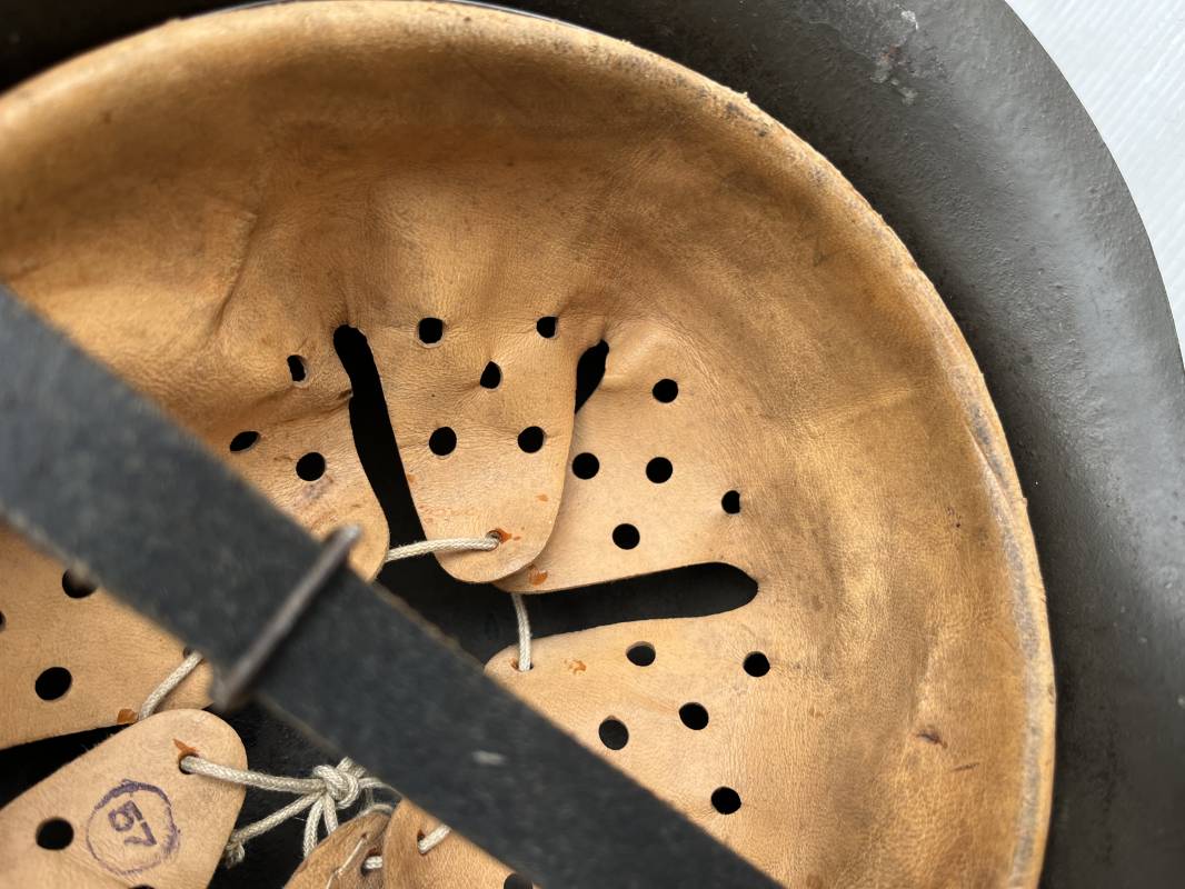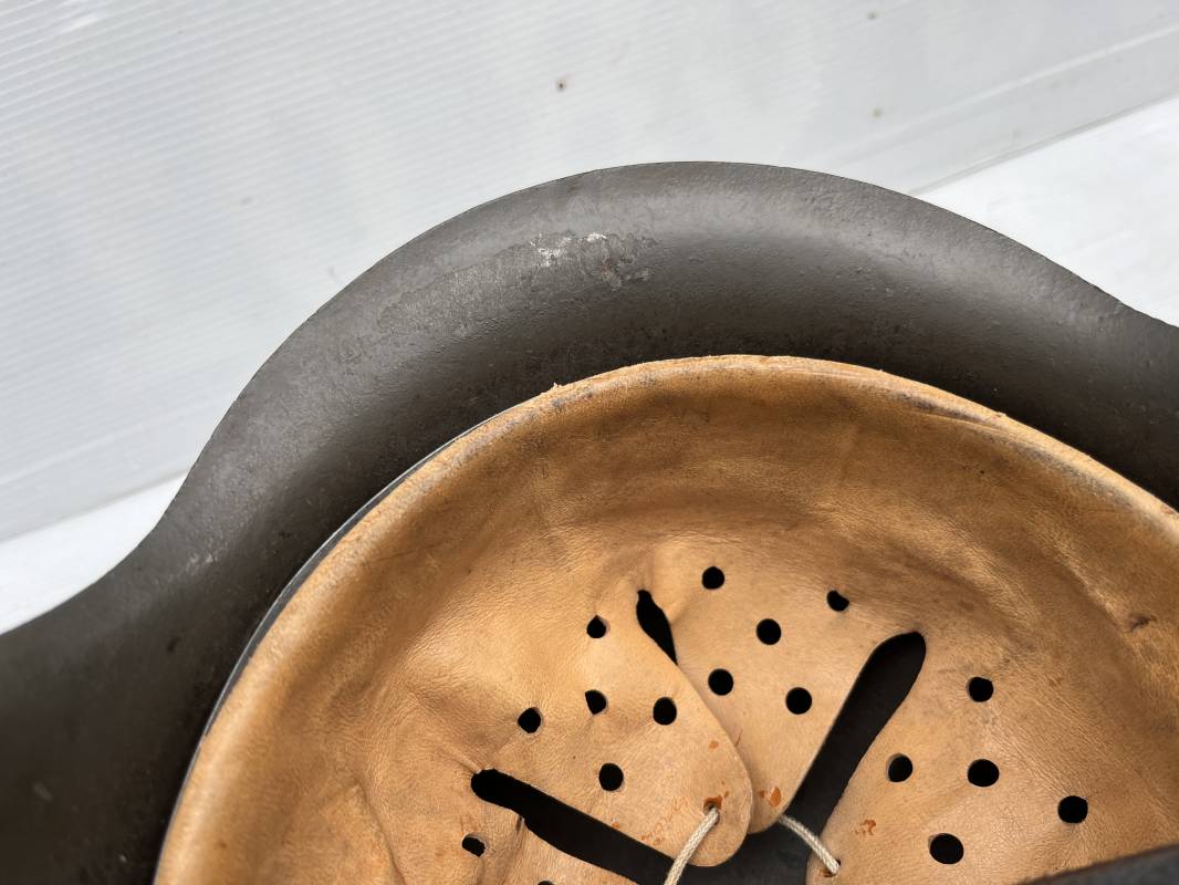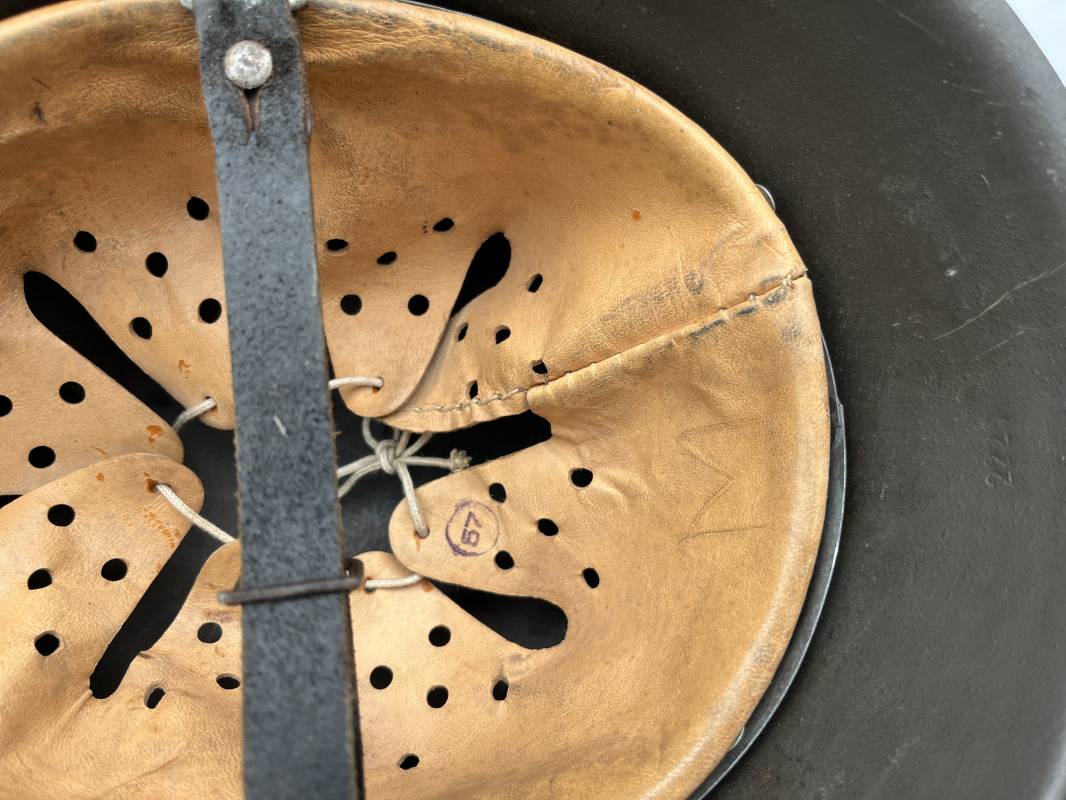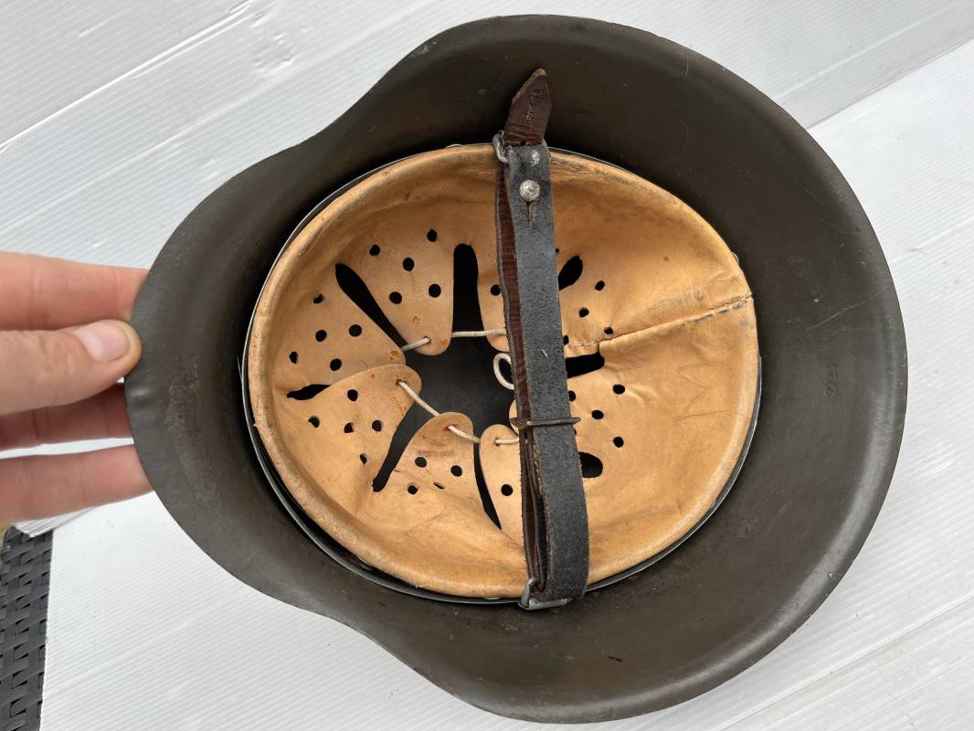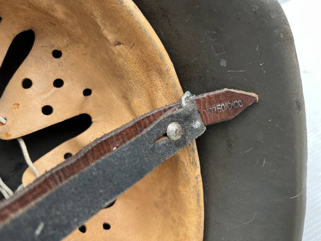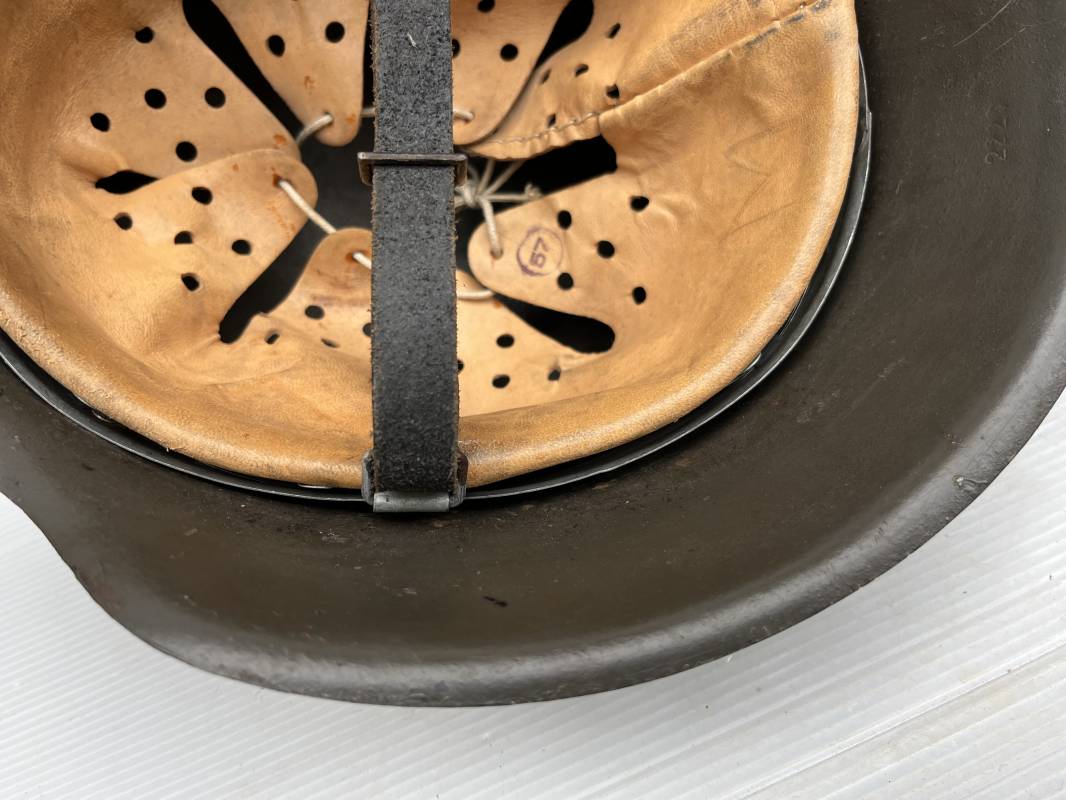 Superbe casque modèle 1942 de la Wehrmacht, fabrication 1943 sans insigne. Ce casque trouvé en Allemagne est dans un état quasi neuf . Il n a jamais été distribué . Trés belle coque avec peinture gris/vert. Marquage code fabricant ET 64 . Marquage sur coque interieure n°2226 . Cerclage en zinc monté d'origine. Cuir fauve naturel en superbe état jamais ciré . Taille 57. Lacet coton d'origine, cuir souple. Jugulaire en cuir noir retourné. Marquage code fabricant Rbnr. Rivets et boucle à un ardillon en fer peint en gris , cuir souple. Très beau casque en superbe état . Casque sans aucun défaut 1943/45. Ref 21201