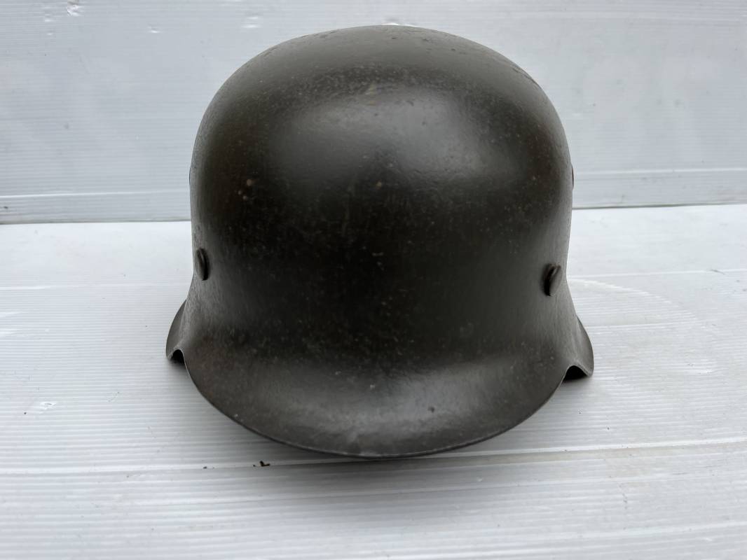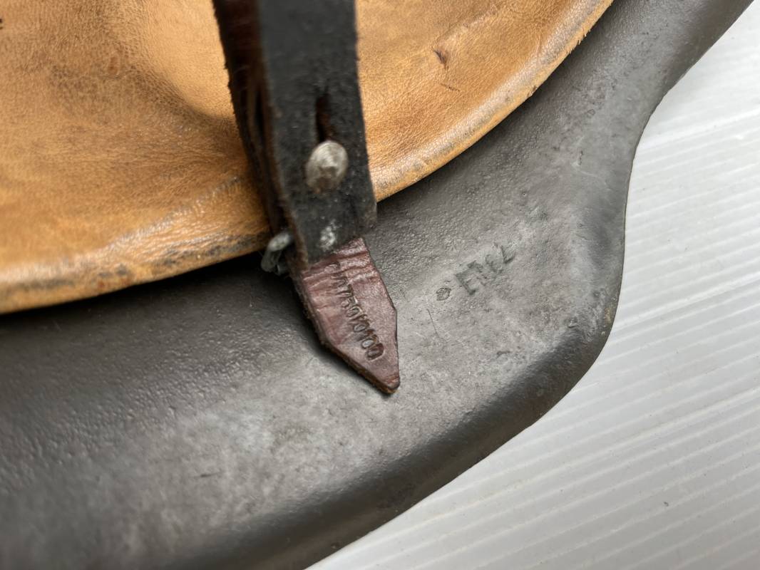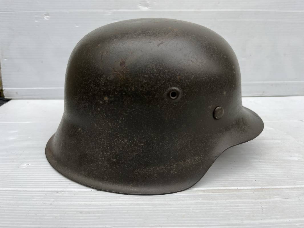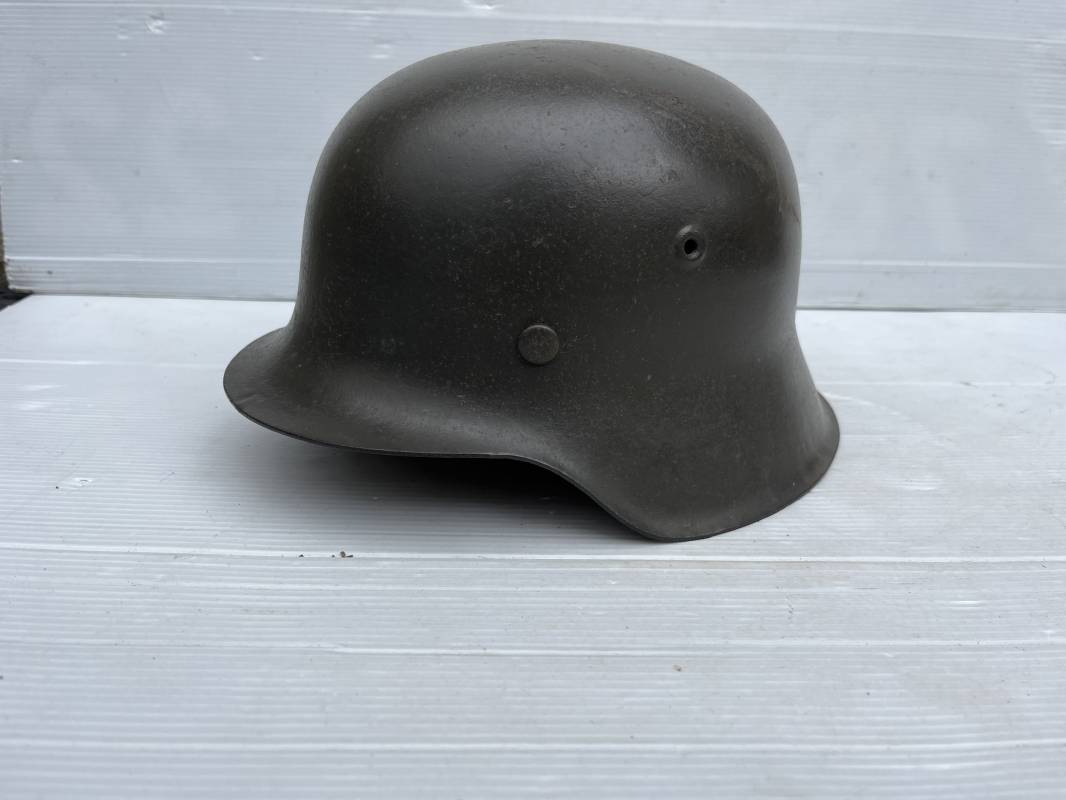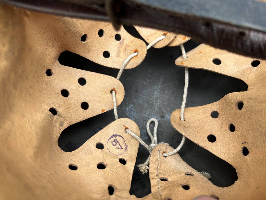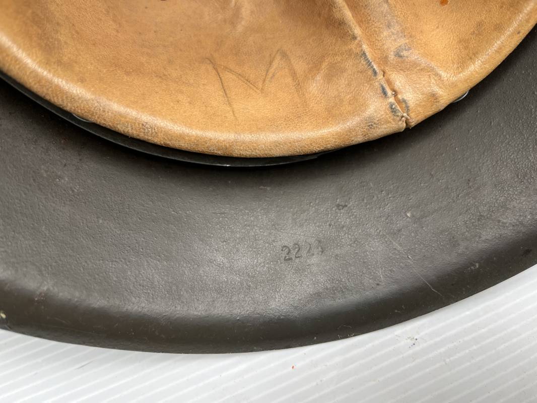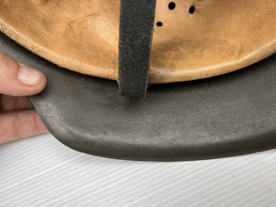 Superbe casque modèle 1942 de la Wehrmacht, fabrication 1943 sans insigne. Ce casque trouvé en Allemagne est dans un état quasi neuf . Il n a jamais été distribué . Trés belle coque avec peinture gris/vert. Marquage code fabricant ET 64 . Marquage sur coque interieure n°2226 . Cerclage en zinc monté d'origine. Cuir fauve naturel en superbe état jamais ciré . Taille 57. Lacet coton d'origine, cuir souple. Jugulaire en cuir noir retourné. Marquage code fabricant Rbnr. Rivets et boucle à un ardillon en fer peint en gris , cuir souple. Très beau casque en superbe état . Casque sans aucun défaut 1943/45. Ref 21201