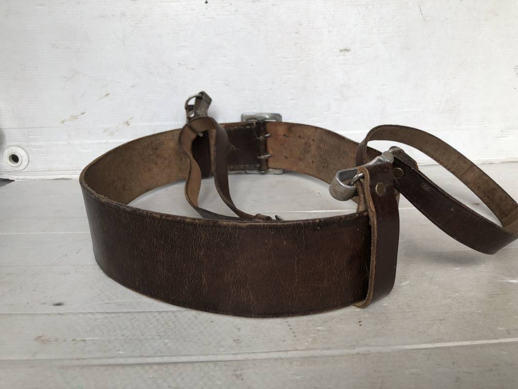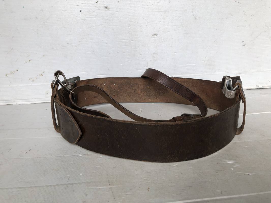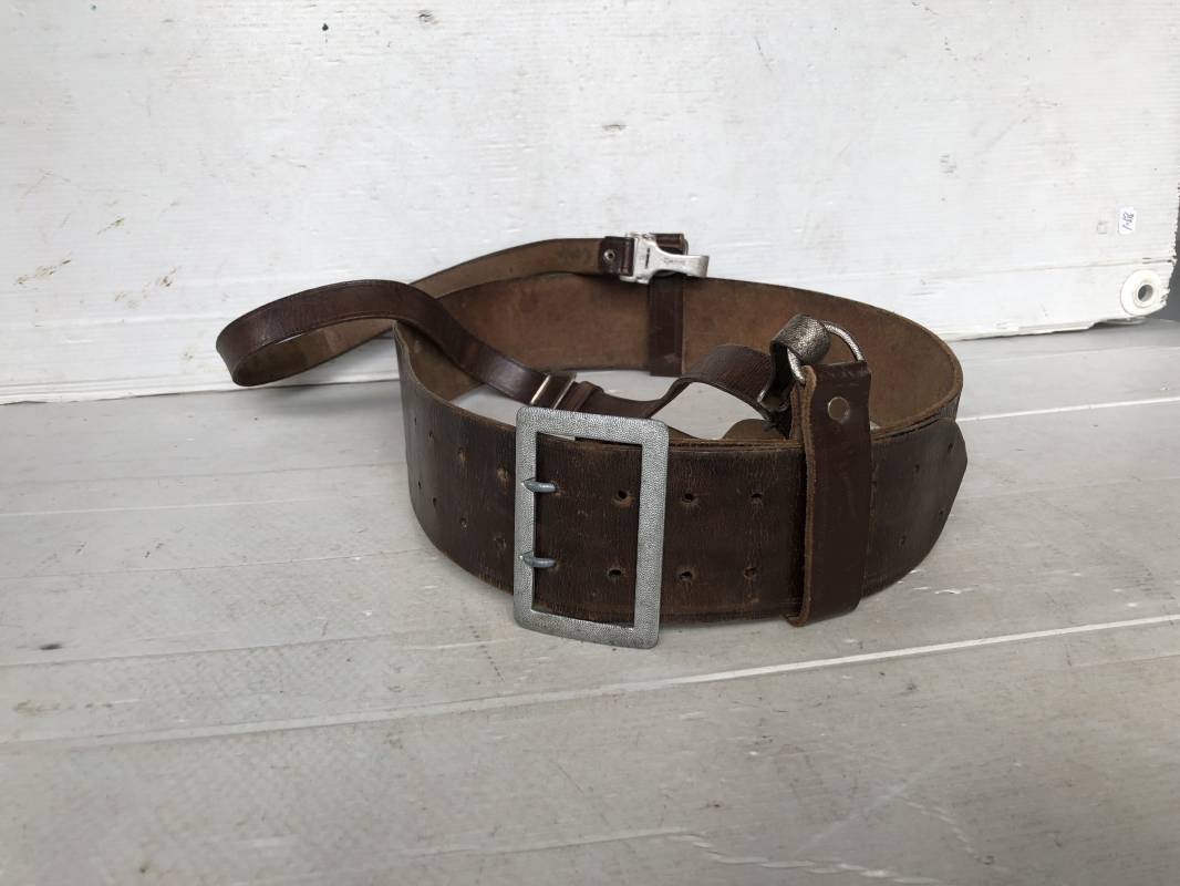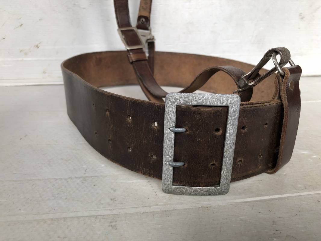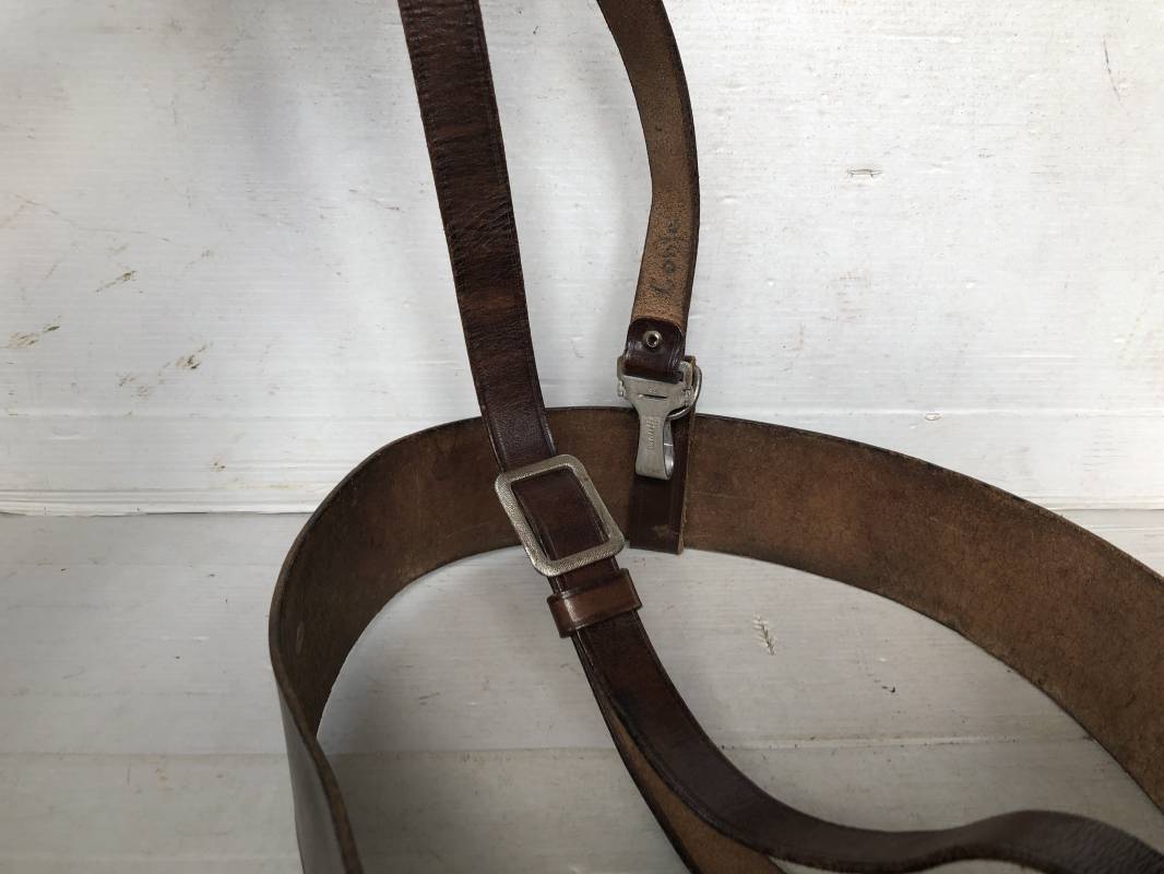 Trés beau ceinturon baudrier d'un officier de la Wehrmacht . Ceinturon en cuir marron foncé . Boucle fer grenelé à deux ardillons . Largeur 58 mm . Longueur 100 cm , cuir souple . Légèrement porté en parfait état . Baudrier en cuir marron ,Boucle et crochets en fer grenelé . Marquage fabricant GM Leuner DRGM . Bel ensemble homogéne en parfait état 1935/40 Ref 13954