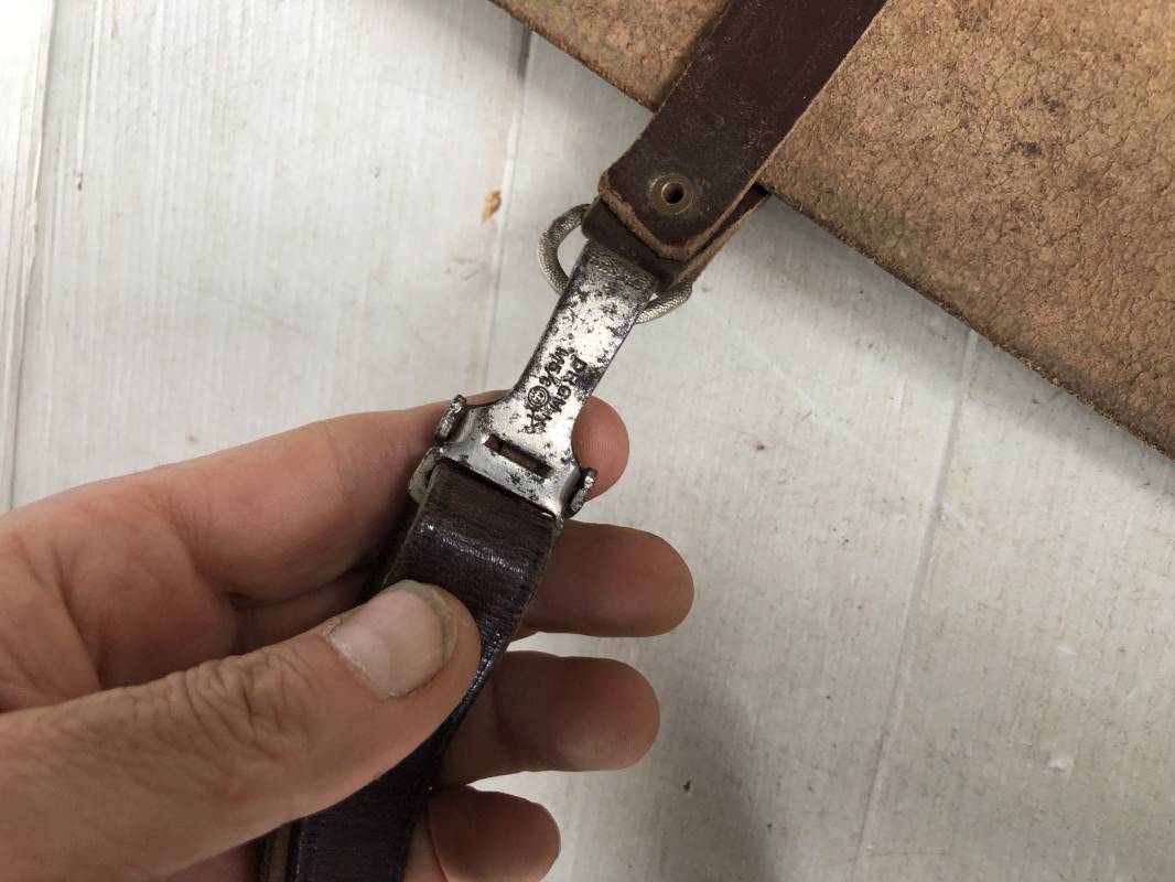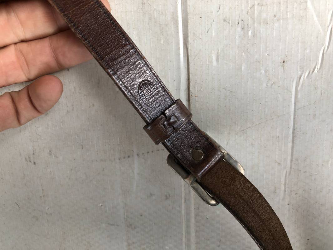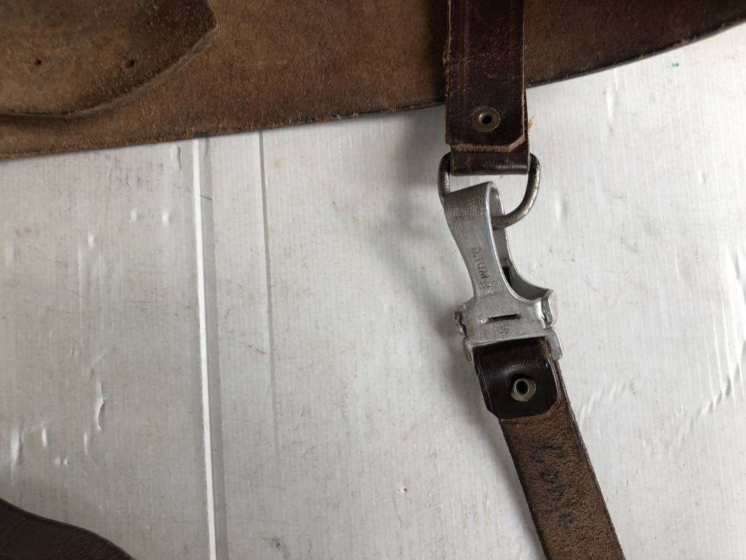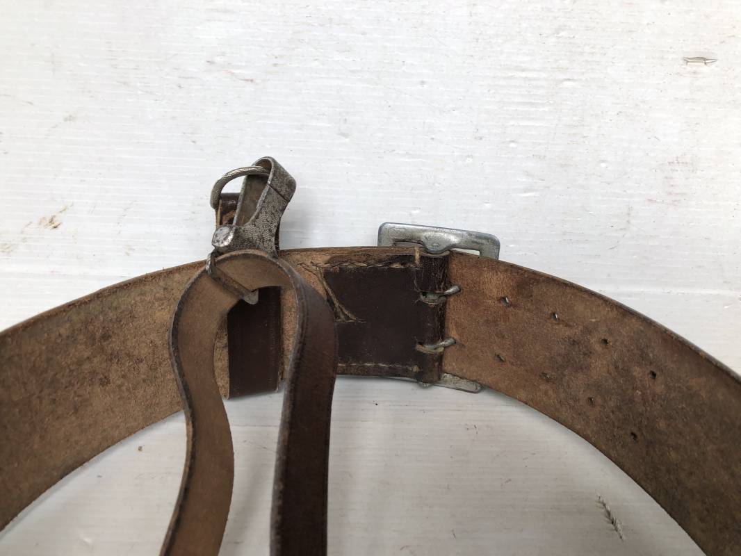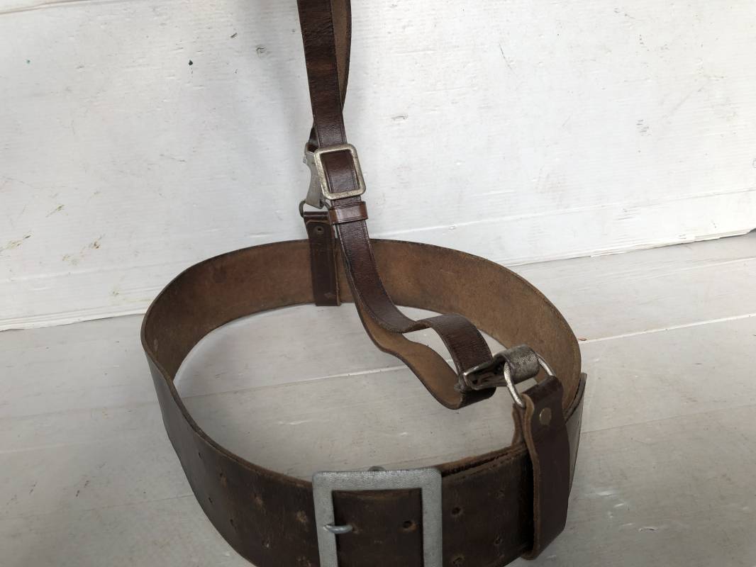 Trés beau ceinturon baudrier d'un officier de la Wehrmacht . Ceinturon en cuir marron foncé . Boucle fer grenelé à deux ardillons . Largeur 58 mm . Longueur 100 cm , cuir souple . Légèrement porté en parfait état . Baudrier en cuir marron ,Boucle et crochets en fer grenelé . Marquage fabricant GM Leuner DRGM . Bel ensemble homogéne en parfait état 1935/40 Ref 13954